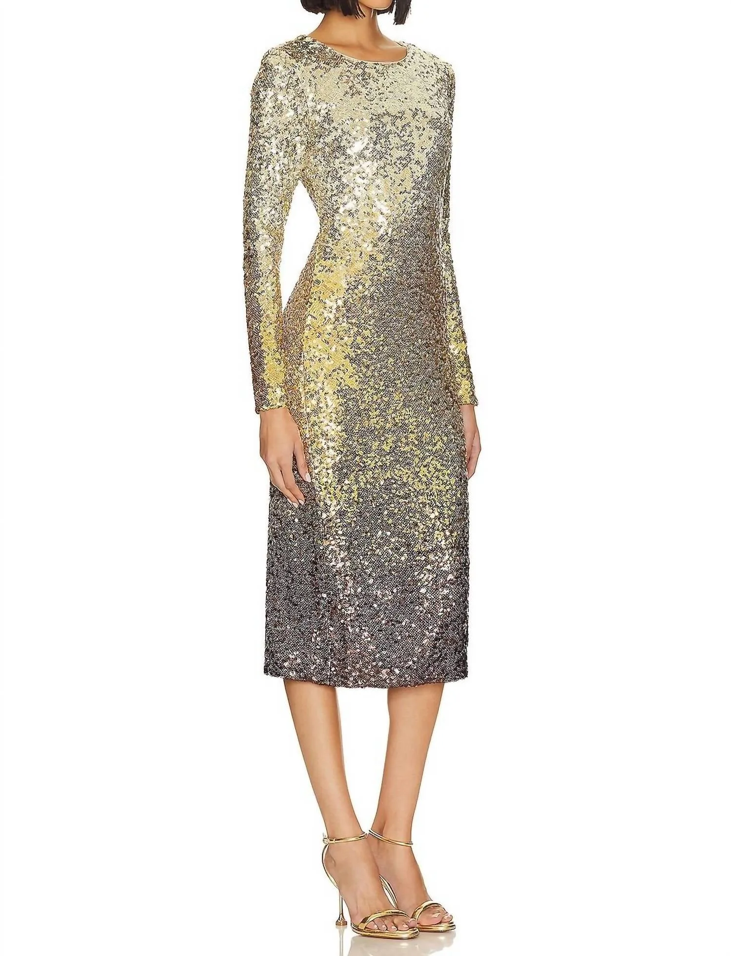 Это элегантное платье миди создано для особых случаев. Длинные рукава и круглый вырез подчеркивают его красивый фактурный узор. Благодаря облегающему силуэту, оно выгодно подчеркивает фигуру, делая ее эффектным выбором для любого мероприятия.