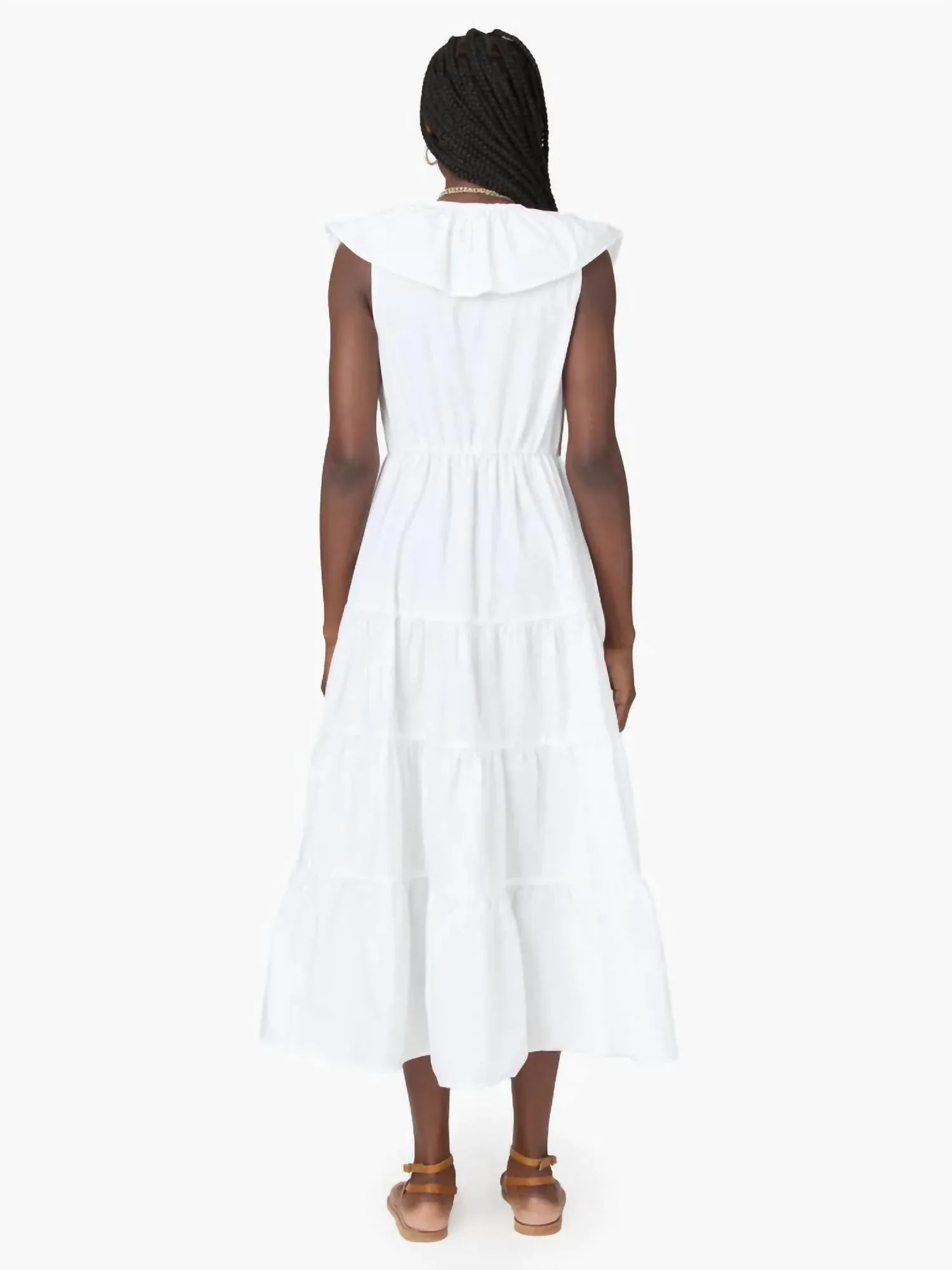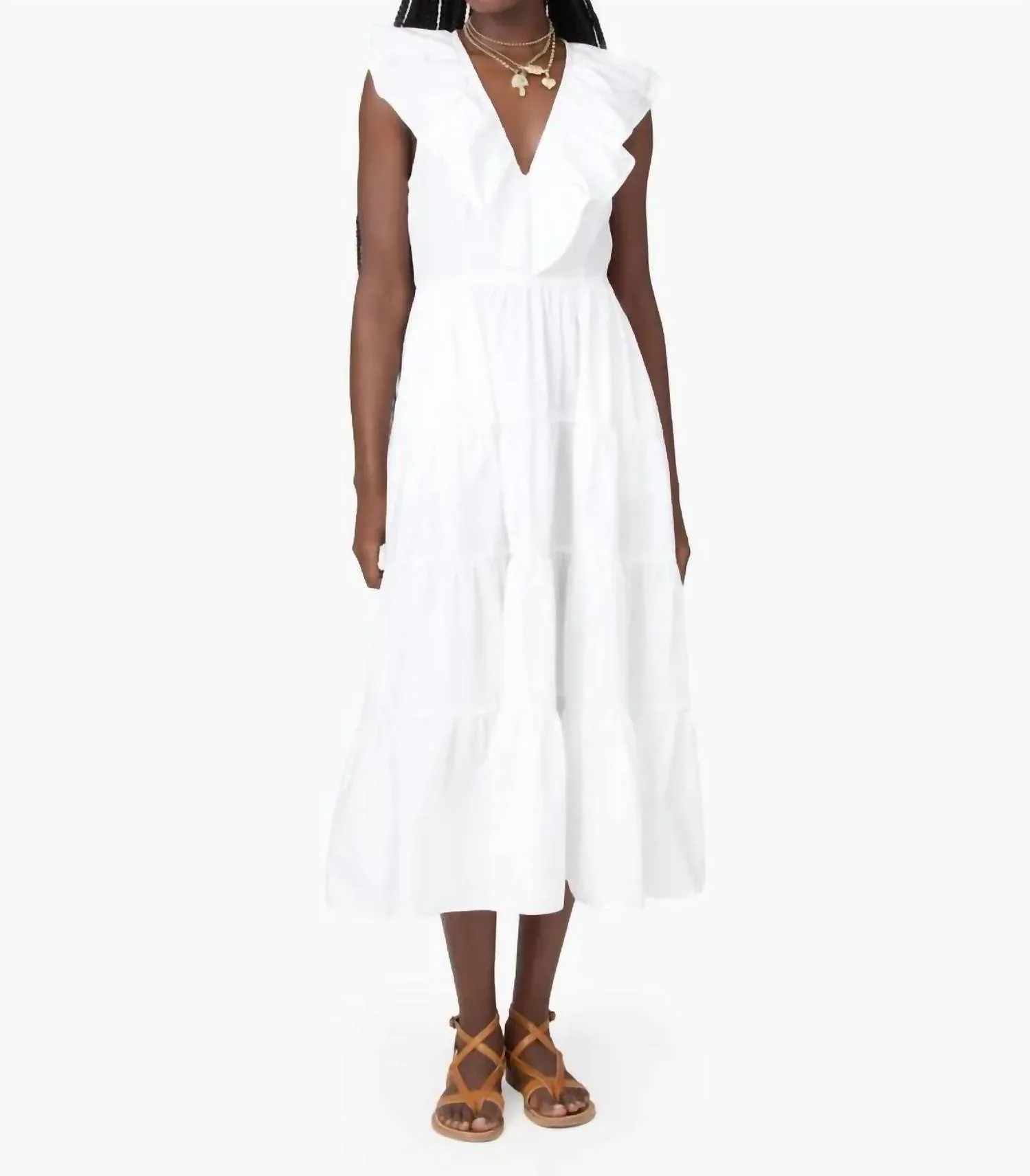 Платье идеальной длины действительно существует. Представляем платье Tatiana от XIRENA - вневременную модель, созданную для женского очарования. Это белое платье миди без рукавов, однотонное, изготовлено из 100% хлопкового поплина и отличается кокетливым многоярусным дизайном с V-образным вырезом с оборками и эластичной талией для удобства и комфорта. Оно дополнено удобными боковыми карманами и застежкой-молнией. Насладитесь очарованием его женственного кроя, идеально подходящего для тех, кто ищет силуэт, соответствующий размеру, и при этом невероятно элегантный.