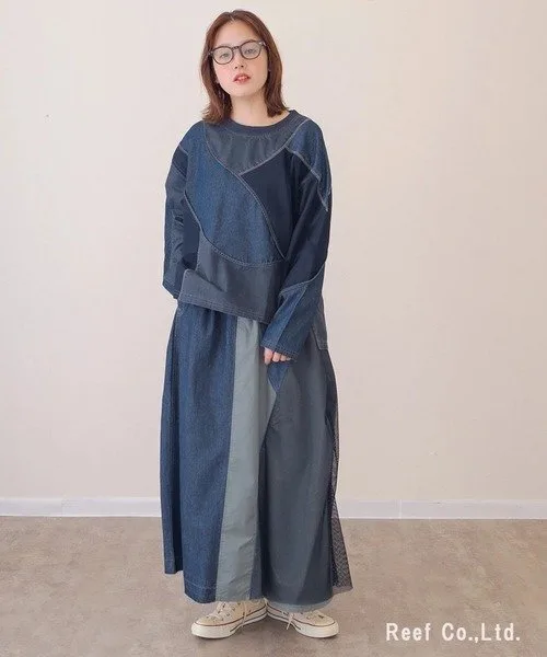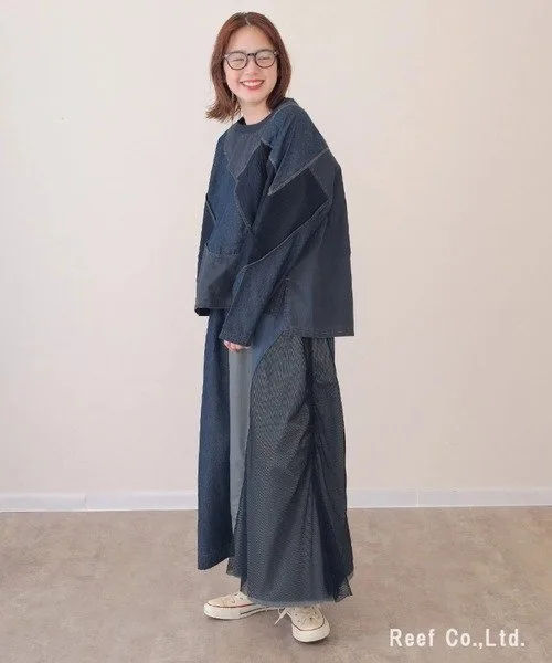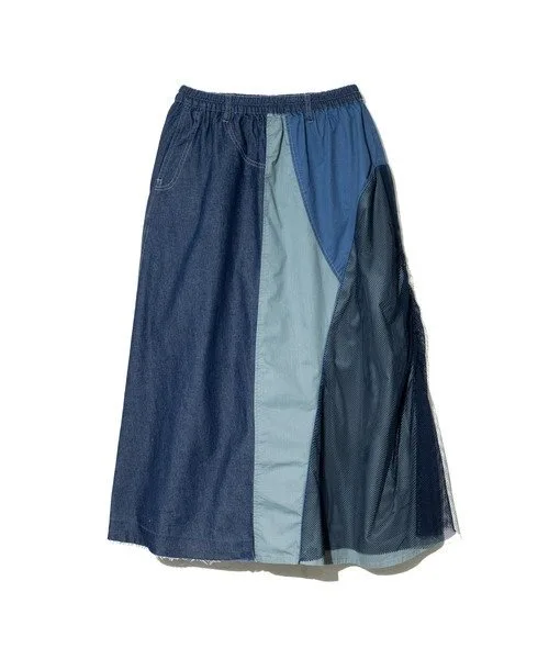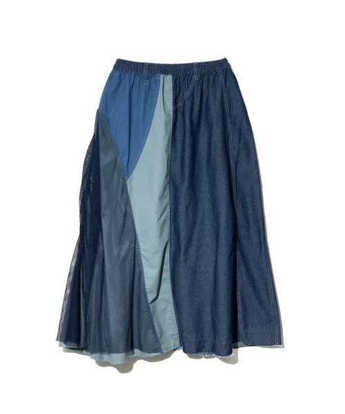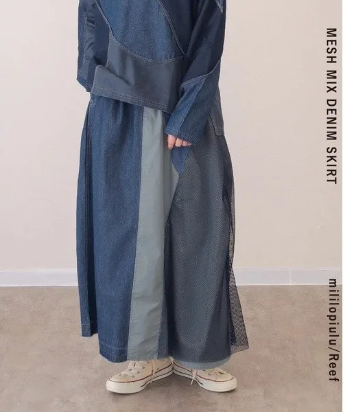 Длинная джинсовая юбка с асимметричным дизайном, украшенная сеткой.