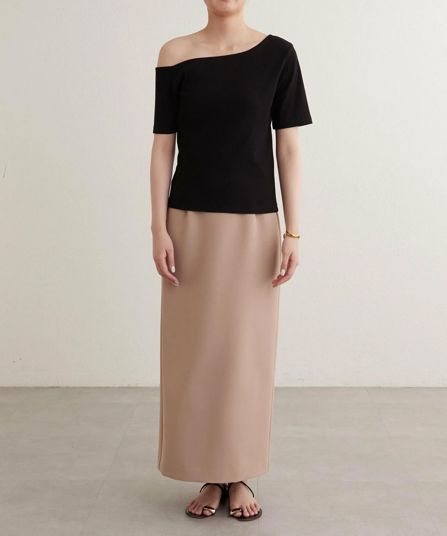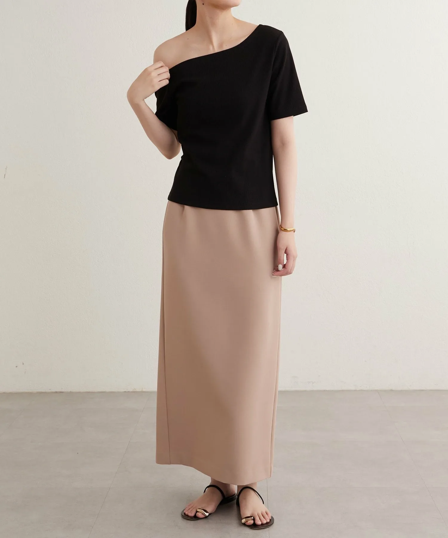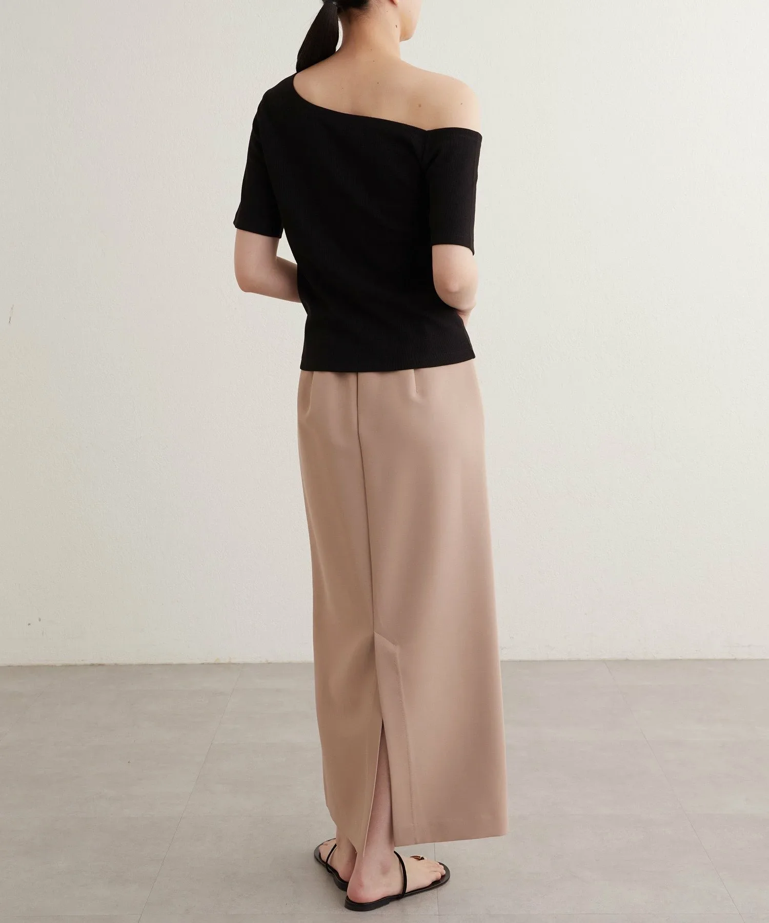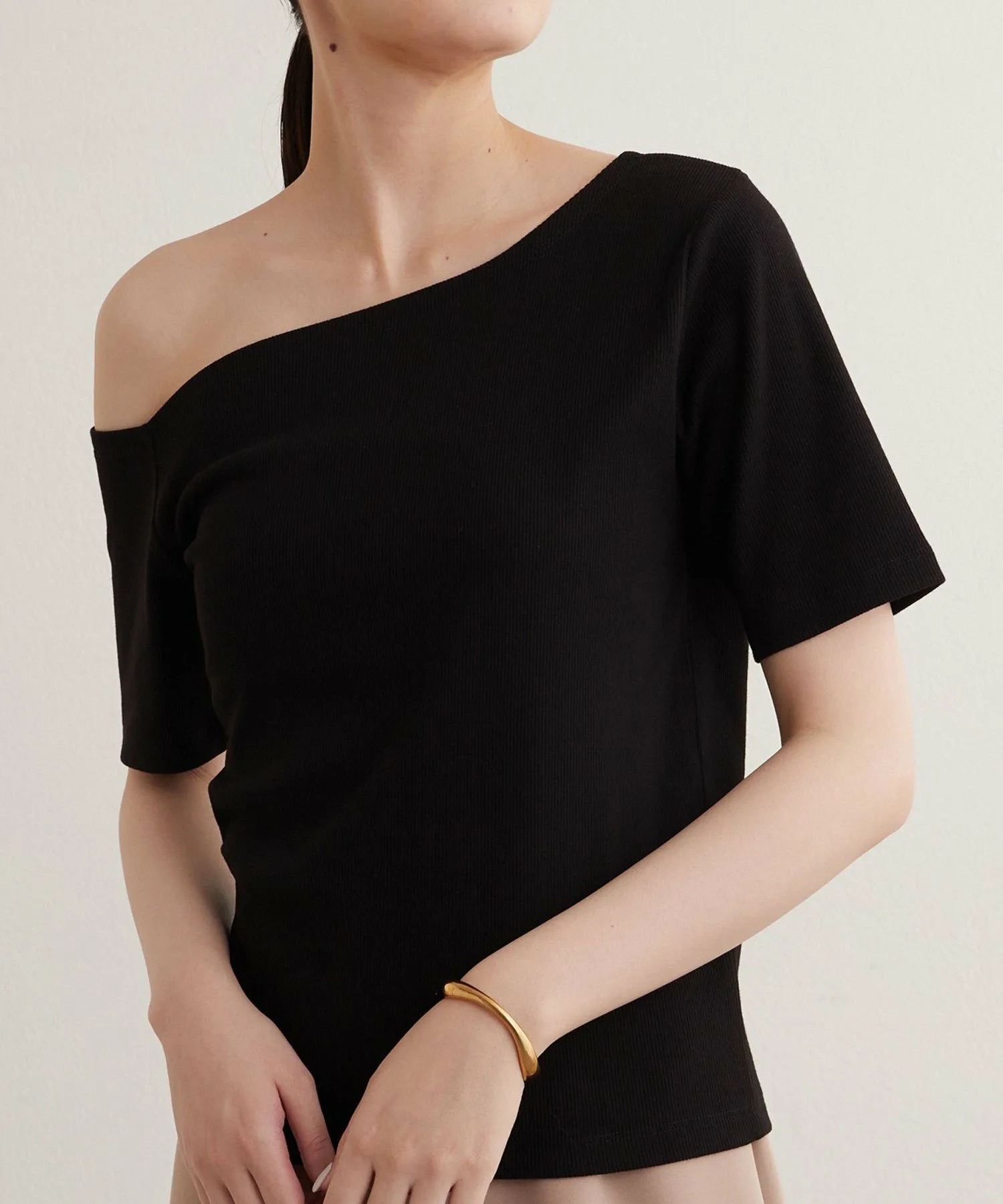 - Вырез горловины и длина рукавов асимметричны с левой и правой стороны, что обеспечивает красивый эффект одного плеча.
