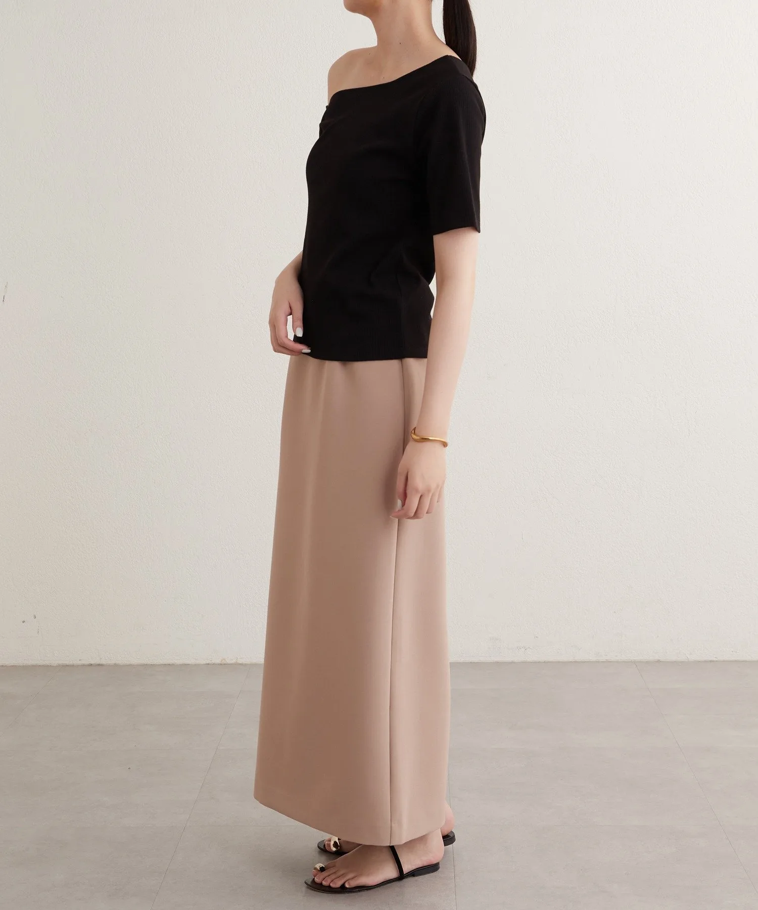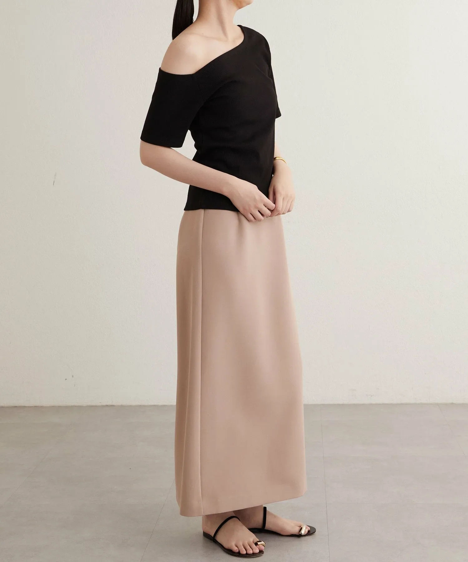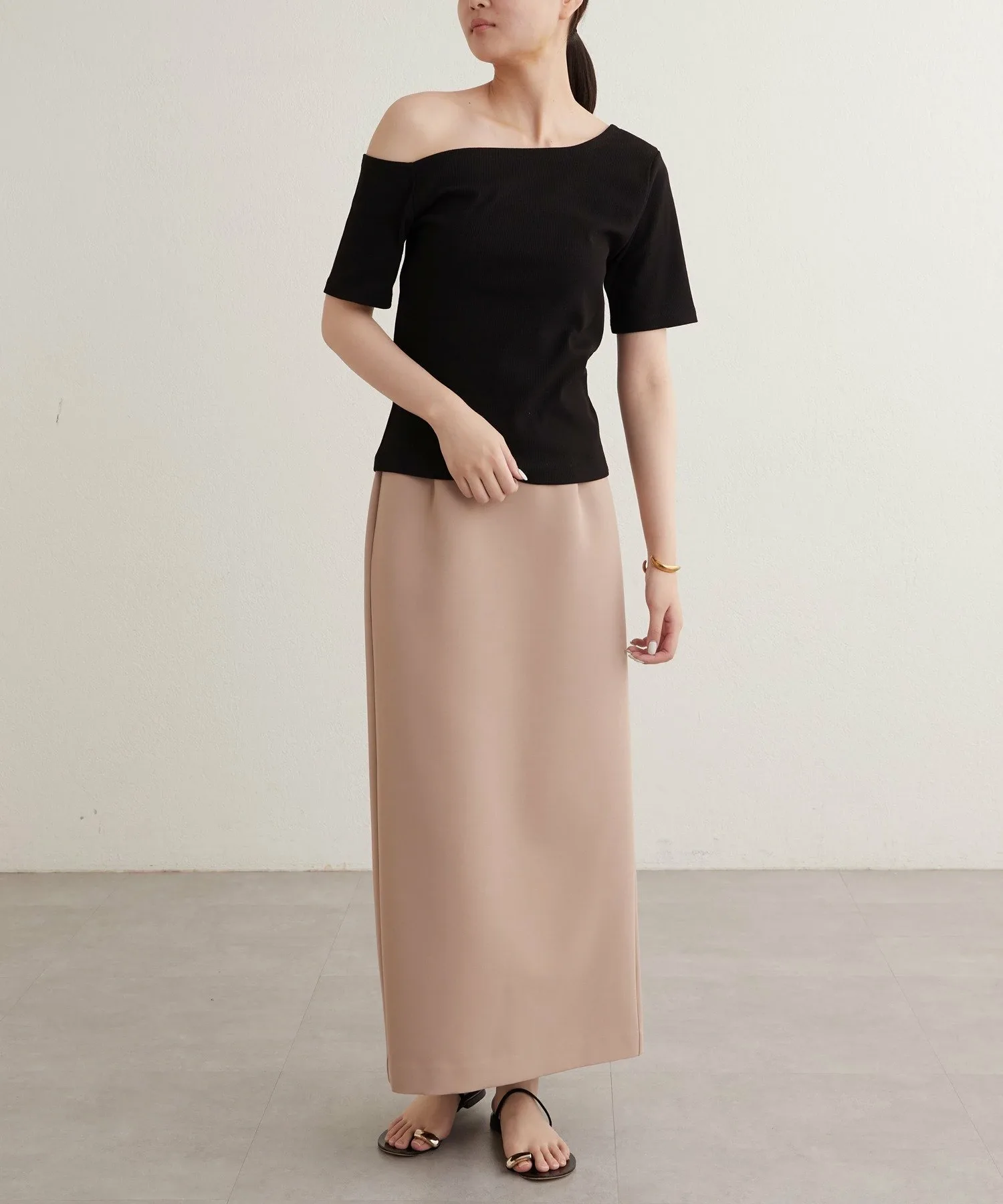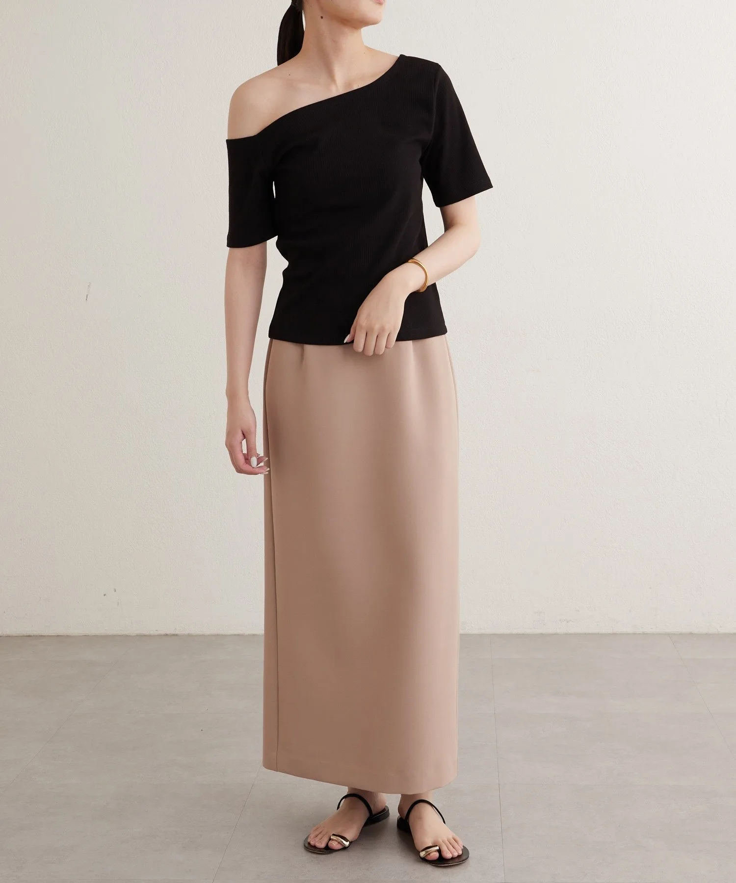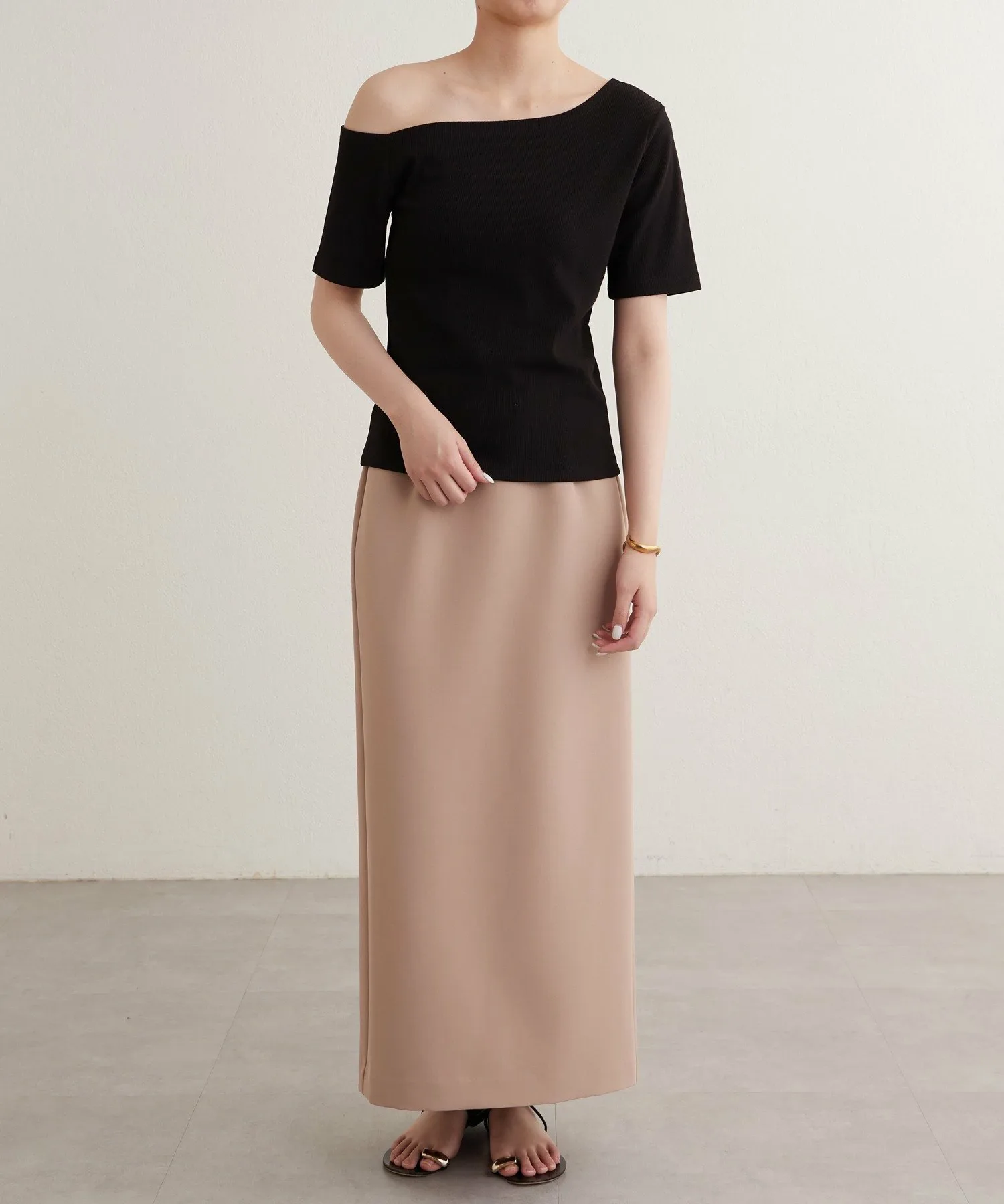 - Вырез горловины и длина рукавов асимметричны с левой и правой стороны, что обеспечивает красивый эффект одного плеча.
