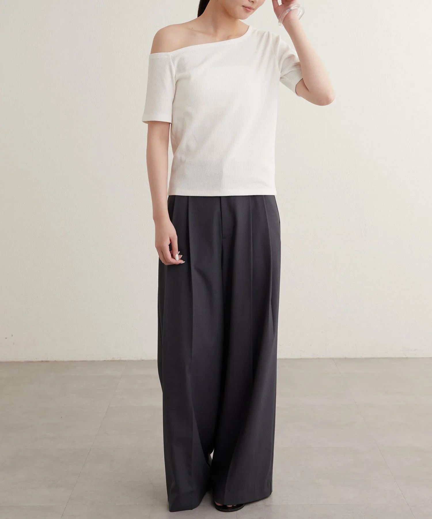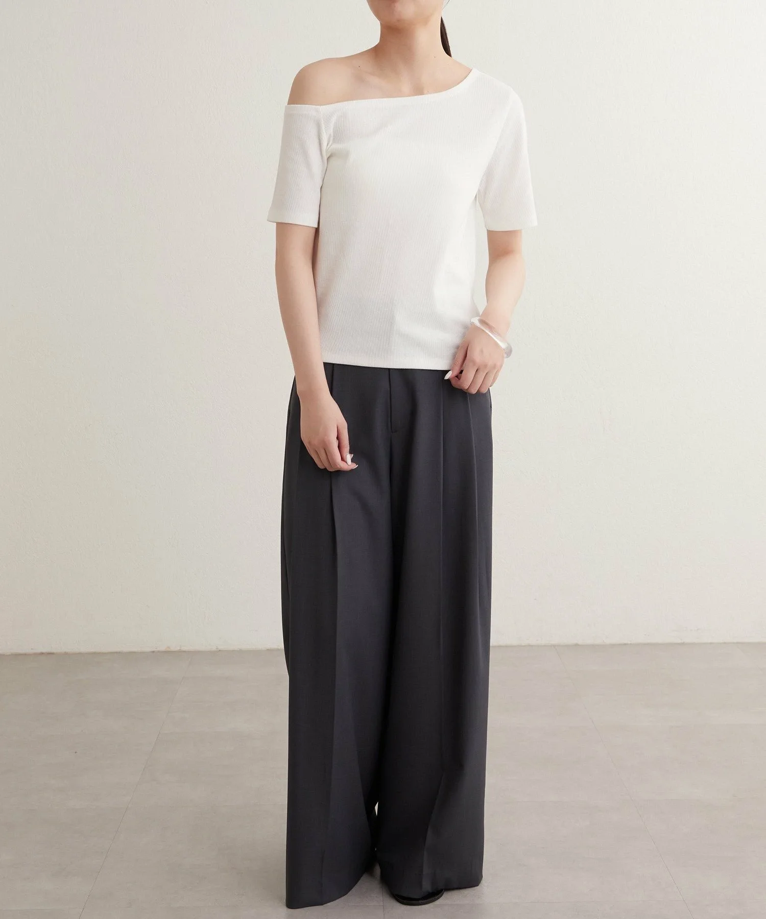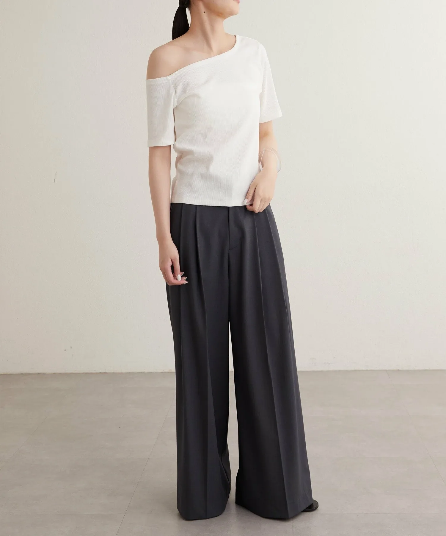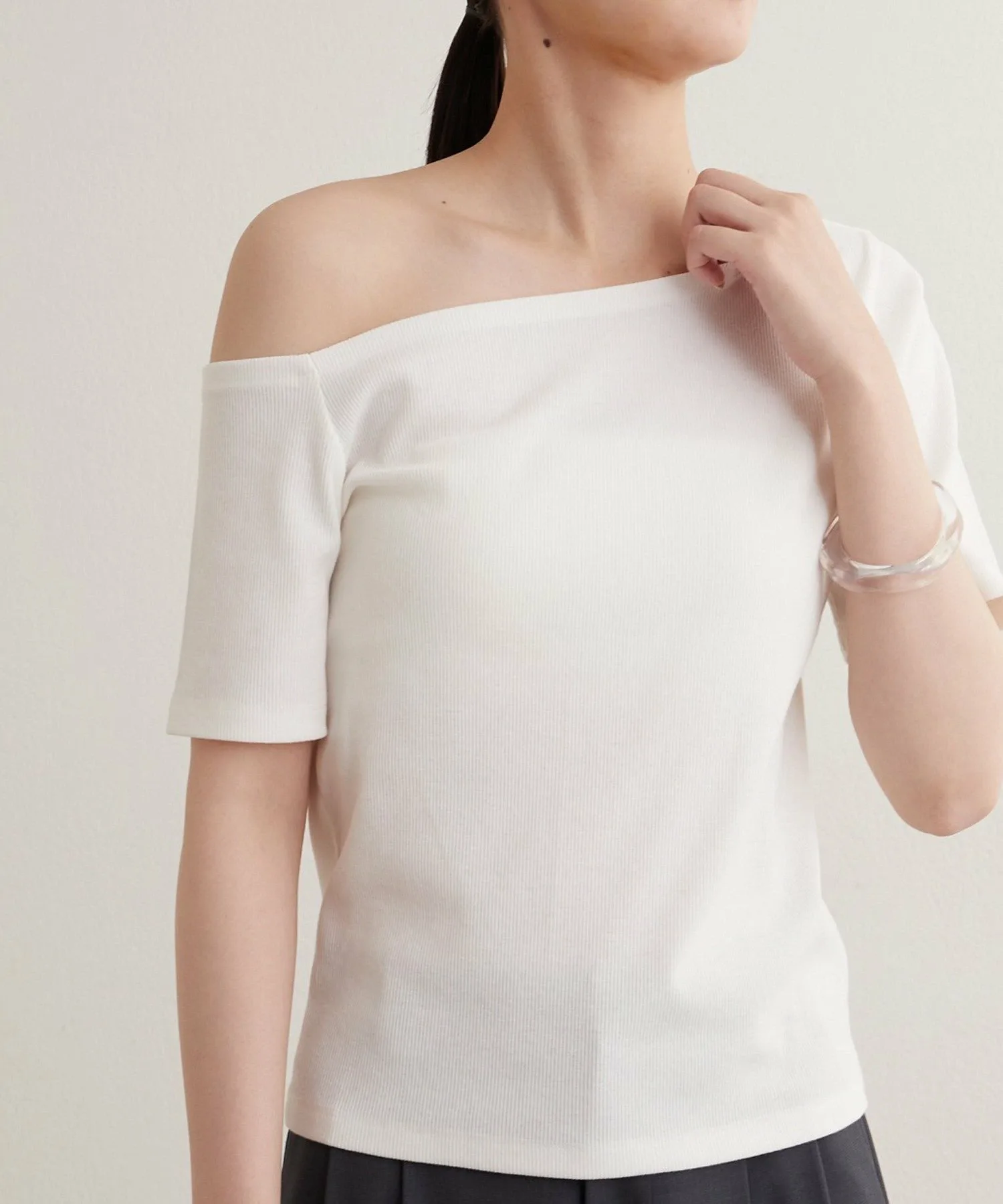 - Вырез горловины и длина рукавов асимметричны с левой и правой стороны, что обеспечивает красивый эффект одного плеча.