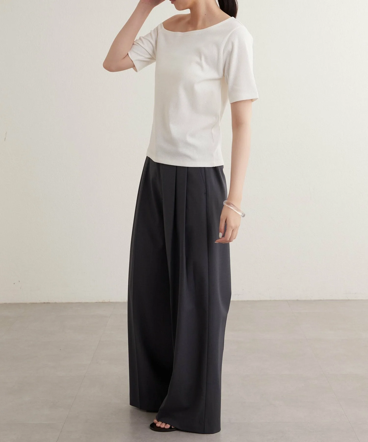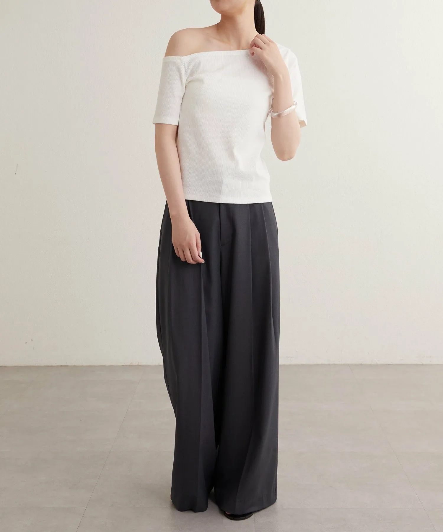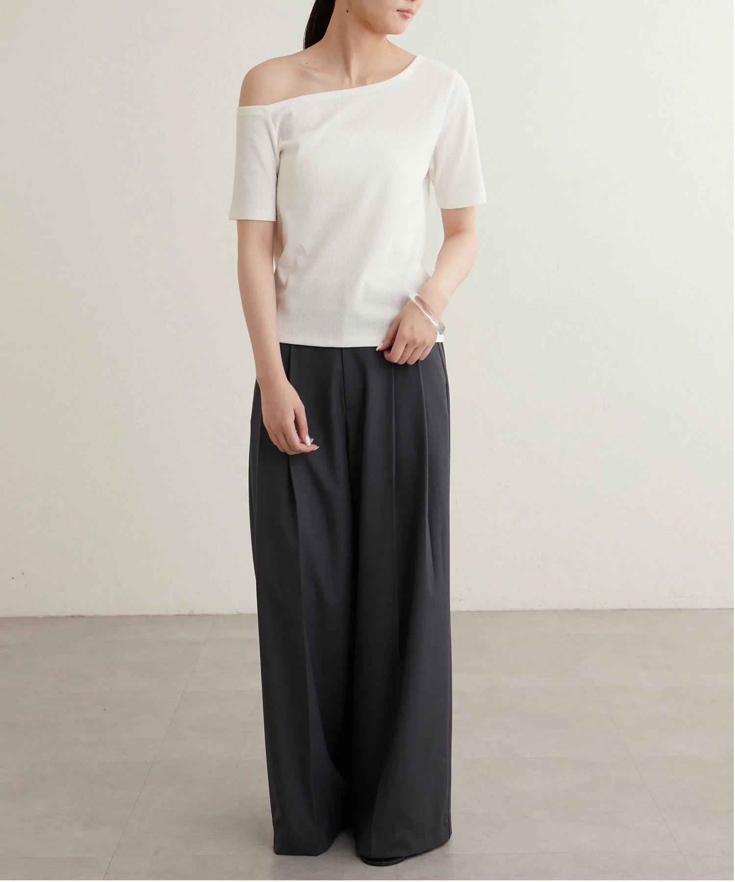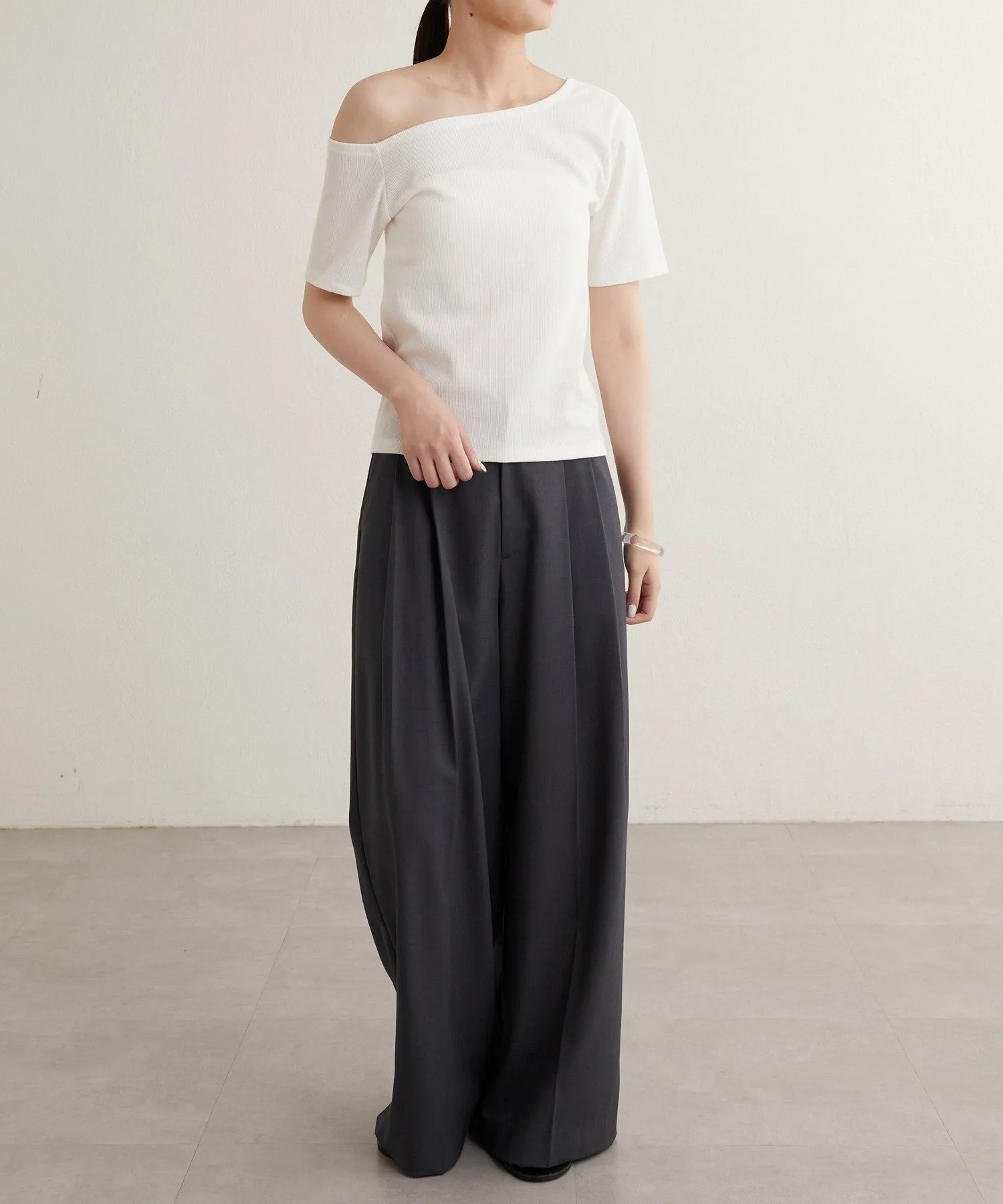 - Вырез горловины и длина рукавов асимметричны с левой и правой стороны, что обеспечивает красивый эффект одного плеча.