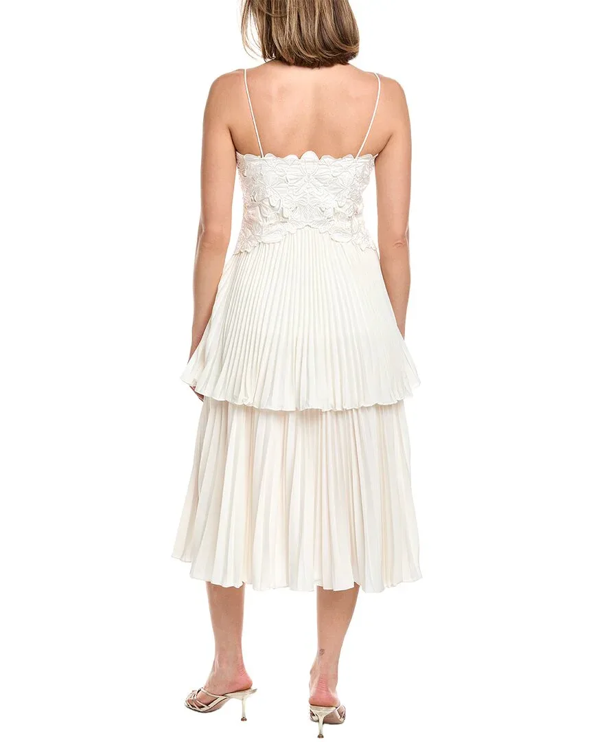 • Платье-миди Esmae с цветочным принтом, цвет слоновой кости, с многослойной плиссированной юбкой и лифом, украшенным цветочной вышивкой.