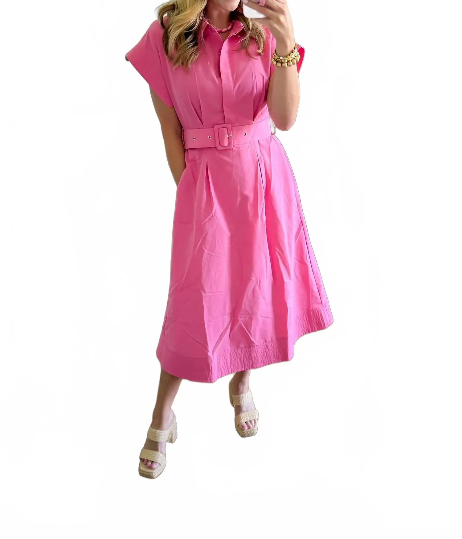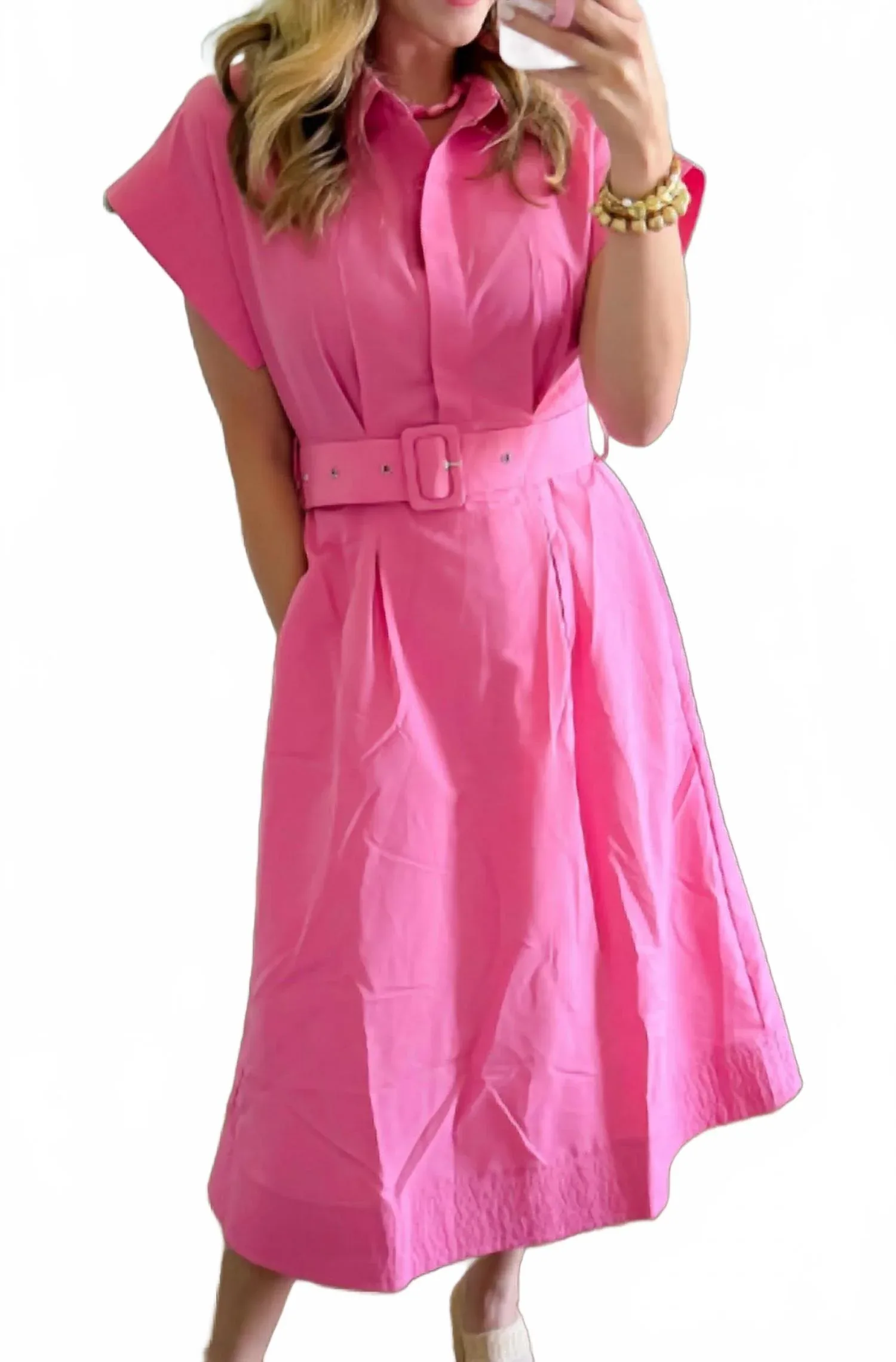 Удобное и милое, это повседневное платье идеально подходит для любого случая. Дополните свой весенний гардероб розовым платьем миди Kate от Entro - шикарным и минималистичным силуэтом «приталенное и расклешенное», который отлично подойдет для любой свадебной церемонии. Платье с короткими рукавами и воротником-стойкой имеет облегающую талию, регулируемый пояс и удобные карманы на подкладке. Платье обеспечивает комфорт и непринужденный стиль, подходит для машинной стирки и сушки в сушильной машине. Меган носит размер S, и рекомендуется выбирать размер больше, если у вас пышная грудь или широкая фигура.