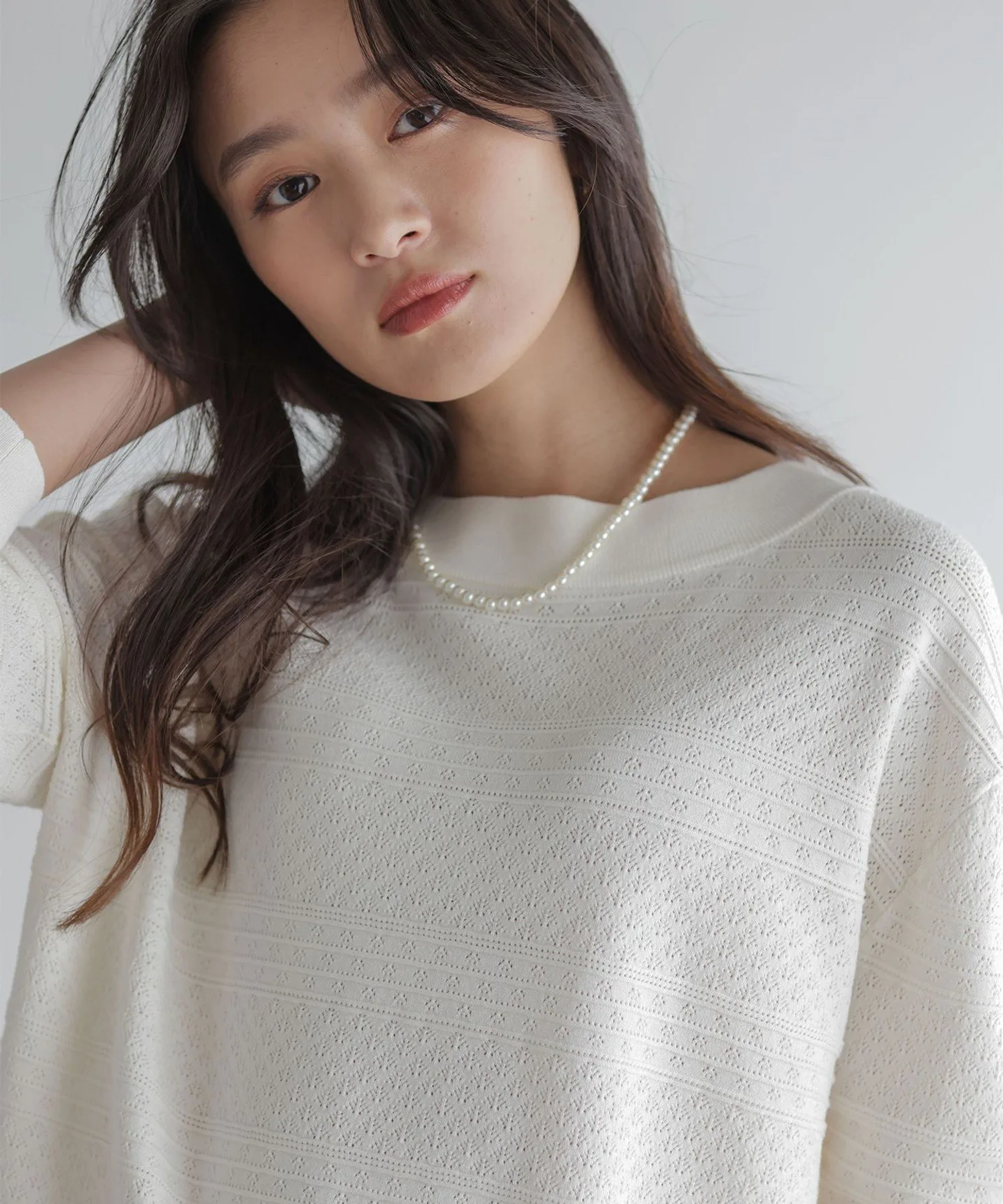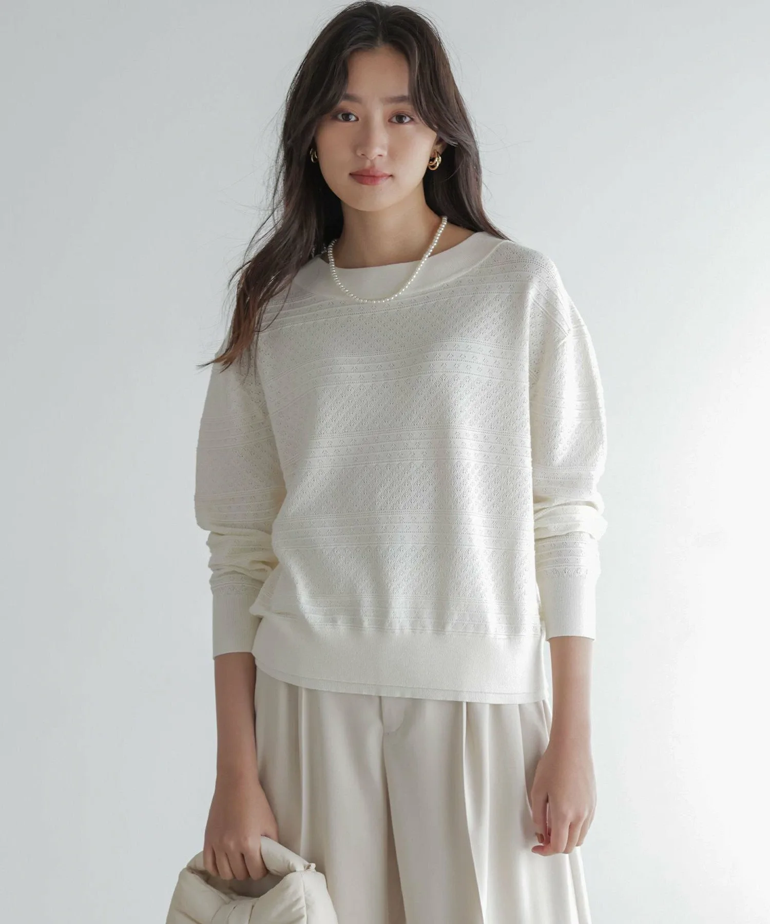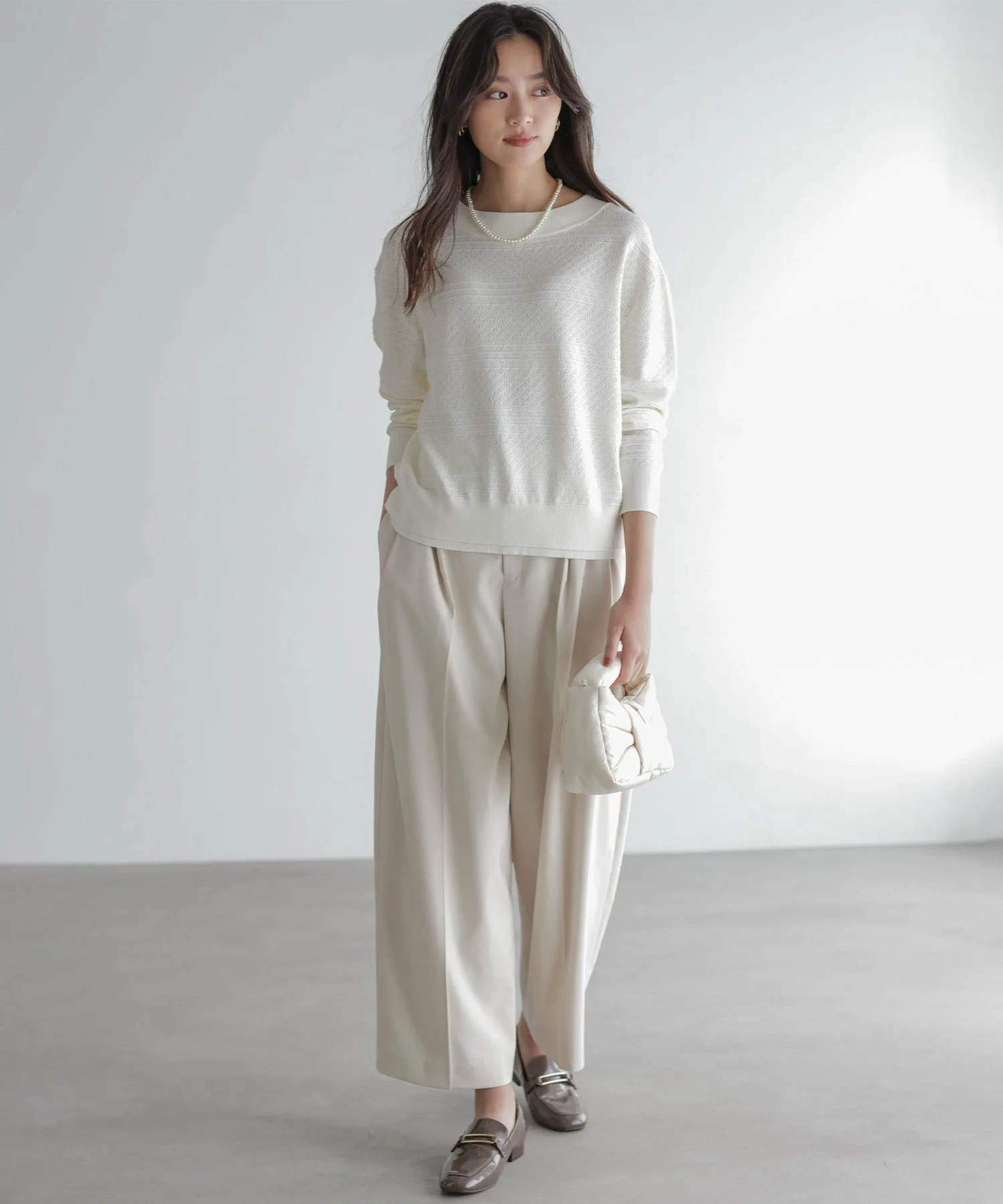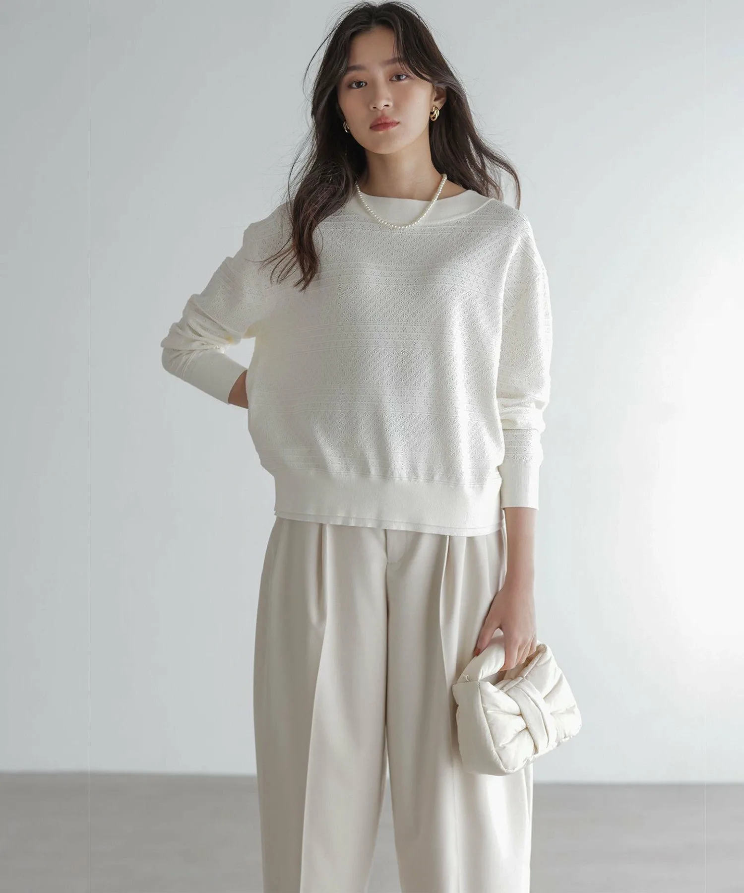 Дизайн・Прямые линии и двухслойная отделка подола создают сбалансированное, компактное впечатление, придавая образу естественную изысканность. ・Вырез горловины и длина, а также оптимальный размер создают женственный образ в непринужденной обстановке. ・Подол плотно прилегает, не подчеркивая линии тела, и отлично смотрится заправленным в брюки или юбку. ・Незаметная отделка подола позволяет легко создать баланс при заправке. ・Благодаря простому дизайну, максимально подчеркивающему текстуру материала, это трикотажное изделие универсально и подходит для самых разных случаев, как на работе, так и вне ее.