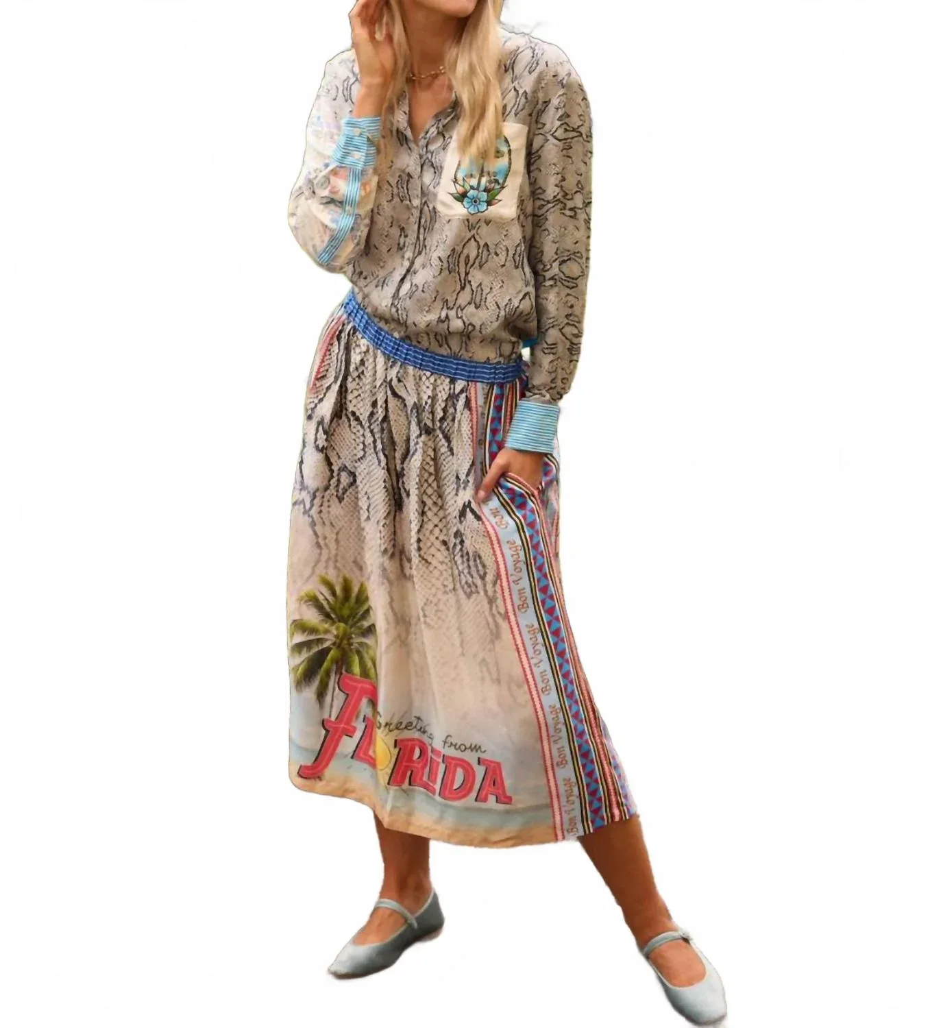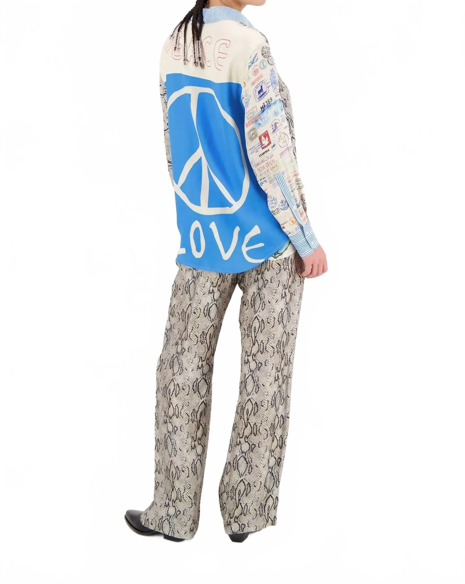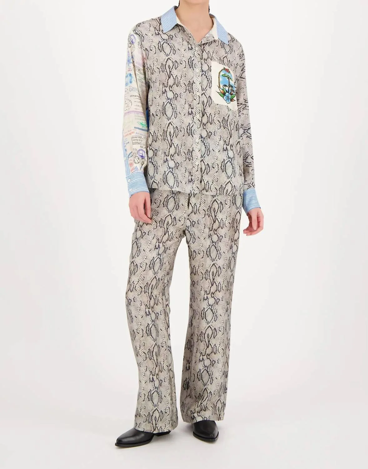 Рубашка Isabel с принтом под змеиную кожу от Me369 сочетает в себе смелый дизайн и классический стиль, идеально подходящий для того, чтобы заявить о себе. Эта привлекательная рубашка на пуговицах имеет длинные рукава: один украшен винтажными штампами, а другой - гладкой серой змеиной кожей, дополненные геометрическим воротником и манжетами. Изготовленная из 100% вискозы, эта рубашка дарит ощущение сдержанной роскоши и идеально подходит для путешествий или новогодних торжеств. Уход: ручная стирка в холодной воде, сушить в расправленном виде. Застежка: на пуговицах. Имеет карманы и соответствует стандартному размеру.