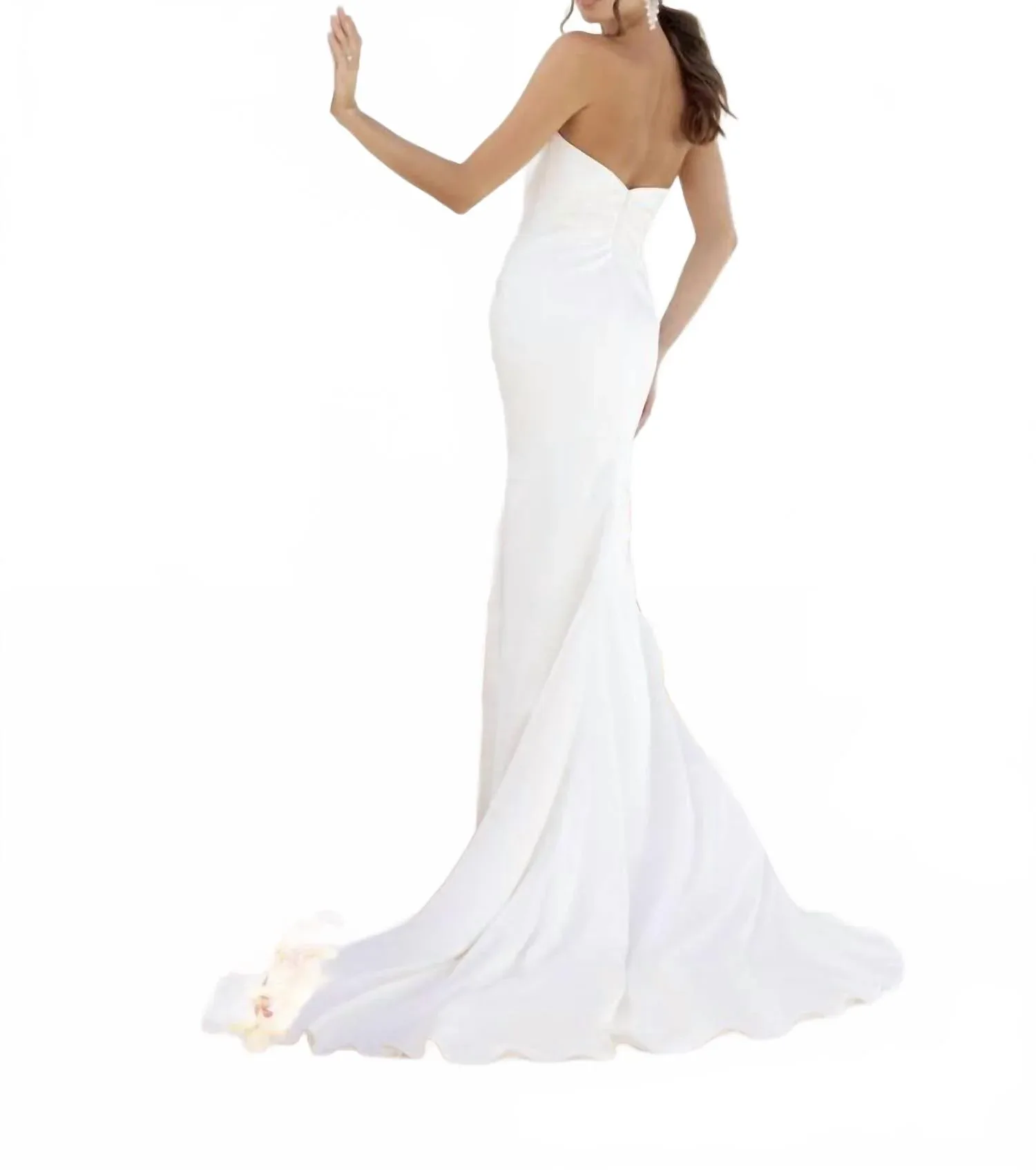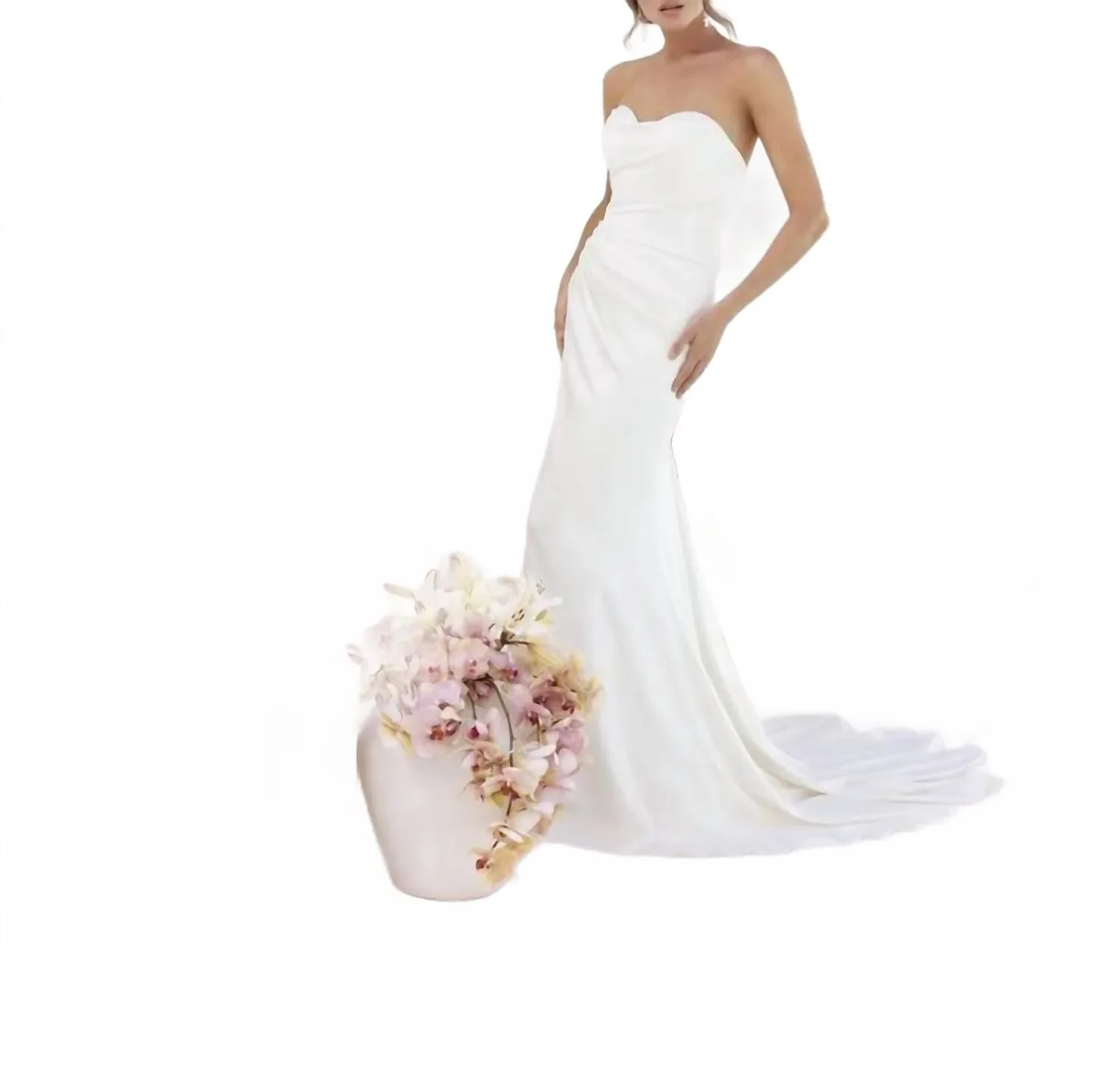 Это гламурное платье силуэта «русалка» с присборенным лифом в форме сердца добавляет романтичности и подчеркивает естественные изгибы фигуры. Изготовленное из роскошного атласа и эластичного жоржета, платье красиво драпируется, обеспечивая гладкую и комфортную посадку. Благодаря шести вертикальным и одной горизонтальной вставкам в лифе, платье обеспечивает превосходную структуру и поддержку, создавая привлекательный силуэт, излучающий элегантность и женственность.