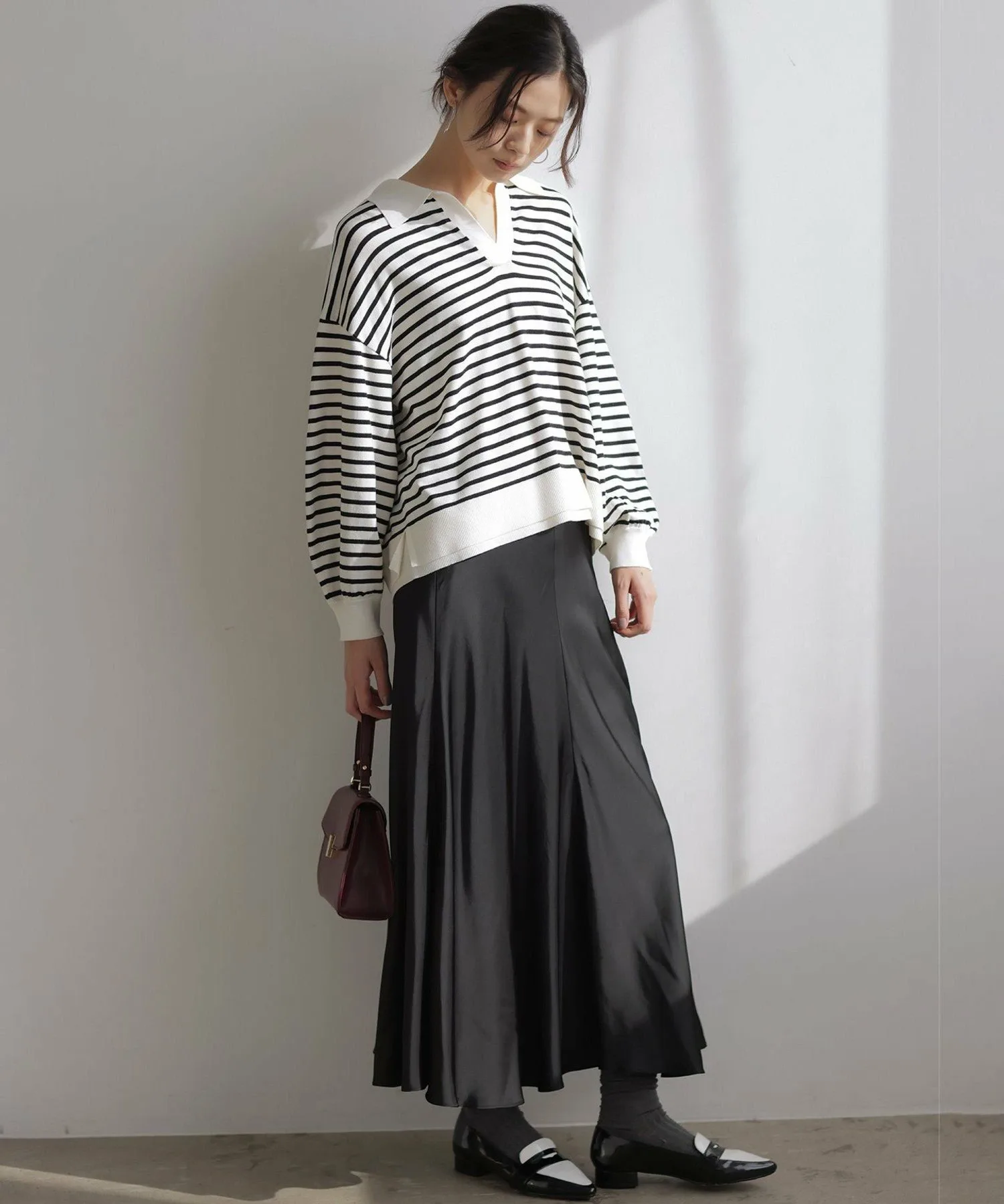 Дизайн・Мы уделили особое внимание открытому вырезу горловины, который подчеркивает женственность, идеальному размеру и объему при закатанных рукавах.・Он не подчеркивает линии тела, а подол хорошо сидит, поэтому выглядит аккуратно, заправленный в брюки или юбку.・Тонкая деталь подола позволяет создать сбалансированный образ, если заправить его.・Идеальная длина, чуть ниже бедер, позволяет легко сочетать его с любыми брюками или юбками.