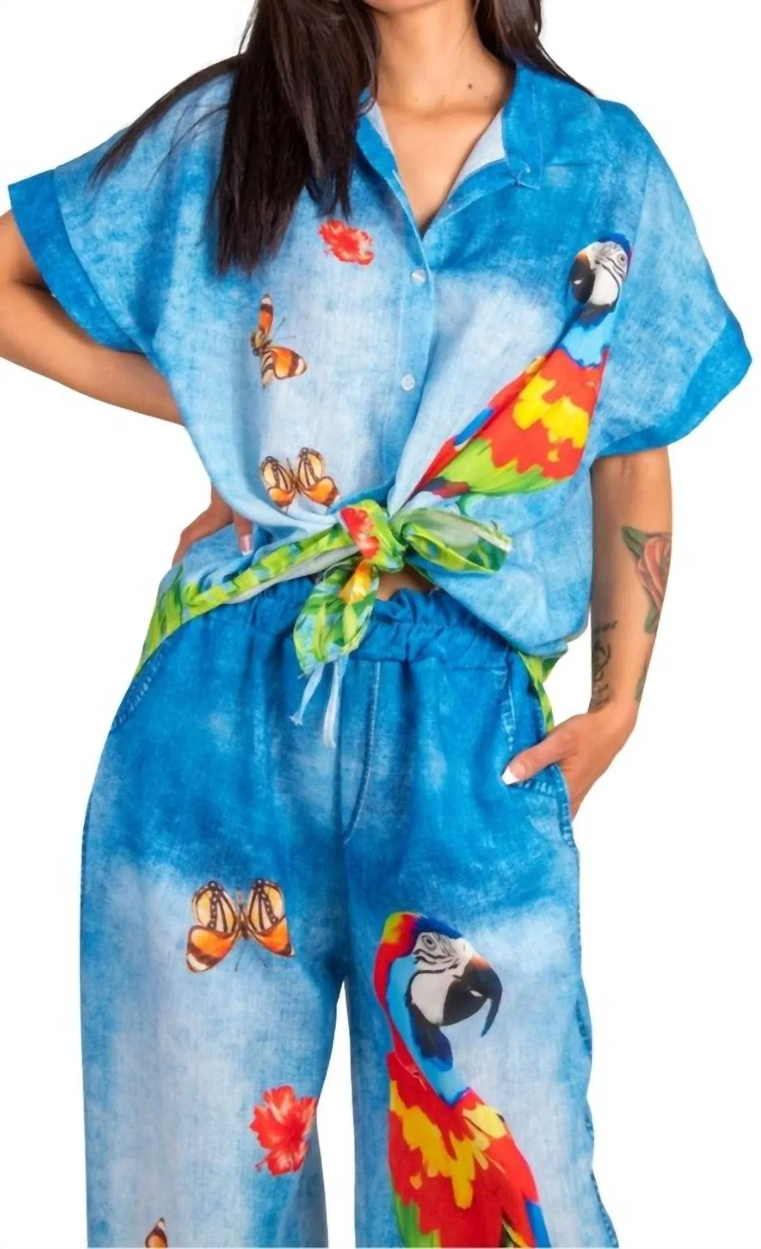 Эта рубашка на пуговицах удобна и элегантна одновременно. Представляем рубашку Pappagallo от GIGI MODA - яркую женскую рубашку на пуговицах, идеально подходящую для вашего летнего гардероба, в эффектном синем цвете. Изготовленная из комфортной смеси 50% хлопка и 50% полиэстера, эта рубашка имеет короткие рукава и игривый принт с тропическими попугаями, имитирующий джинсовую ткань. Сделано в Италии, она имеет стильный воротник и практичную застежку на пуговицы. Дополните образ, сочетая ее с брюками Pappagallo для создания гармоничного богемного шика в отпускном ансамбле. Рост модели 170 см.