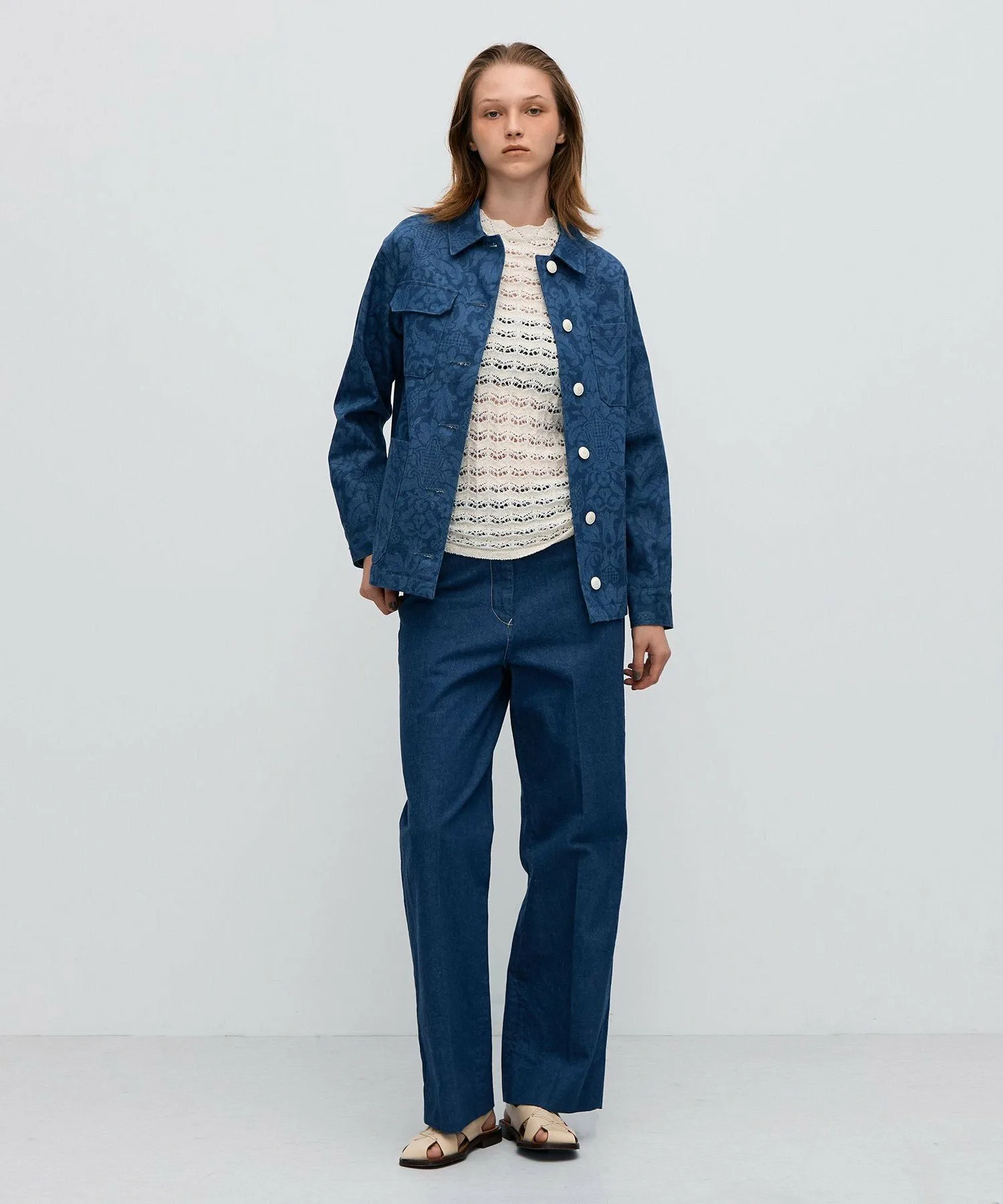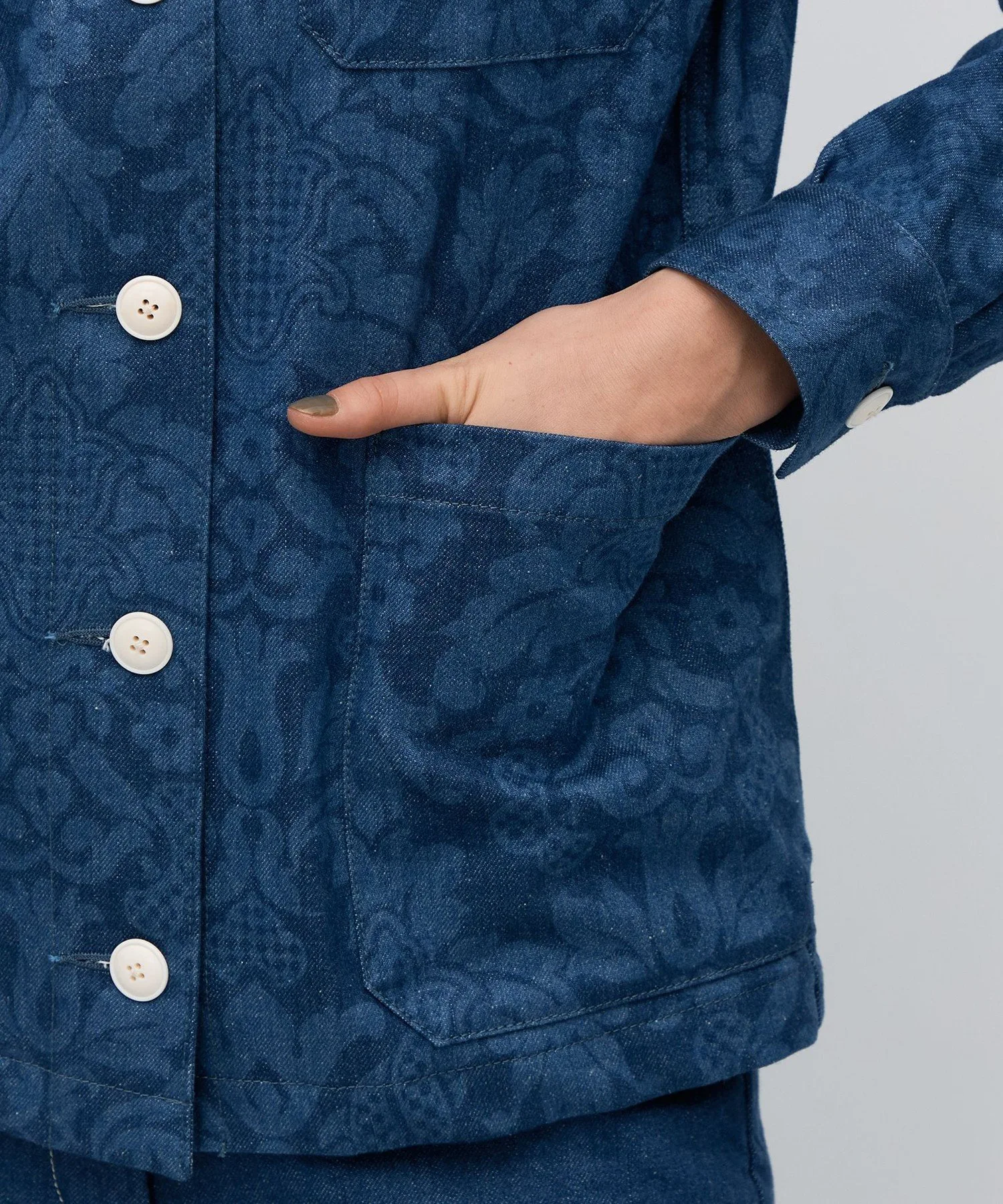 Джинсовая ткань, окрашенная индиго, обработана методом вытравливания для создания изысканного, поношенного вида.