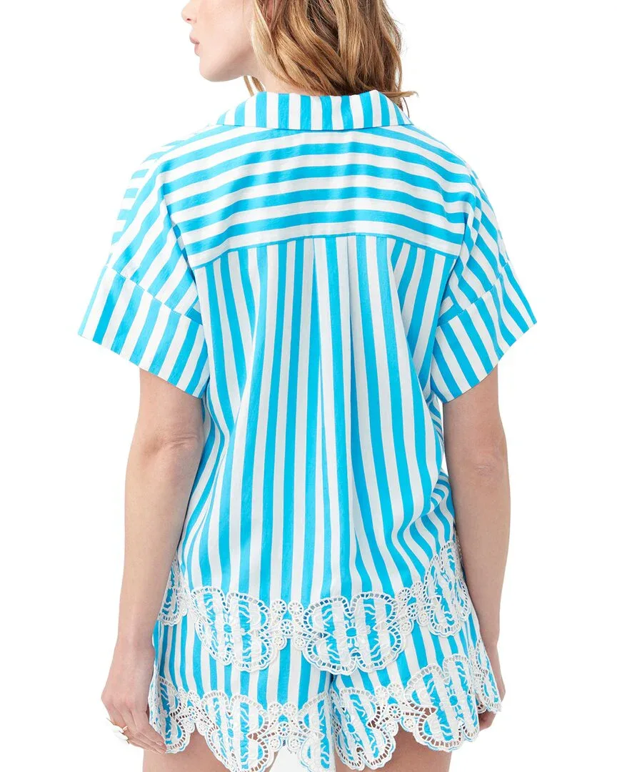Представляем топ Trina Turk Gideon - стильное дополнение к вашему гардеробу от известного современного и яркого бренда Trina Turk. Вдохновленный многокультурным разнообразием Калифорнии, этот топ синего цвета с эффектом выбеленной ткани украшен деталями по низу и имеет заостренный воротник для создания шикарного образа. Застежка на пуговицы спереди, изготовлен из 100% вискозы, длина топа от плеча до низа составляет приблизительно 24,5 дюйма. Легкий в уходе, подходит для ручной или машинной стирки, этот импортный топ идеально дополнит ваш гардероб яркими акцентами.