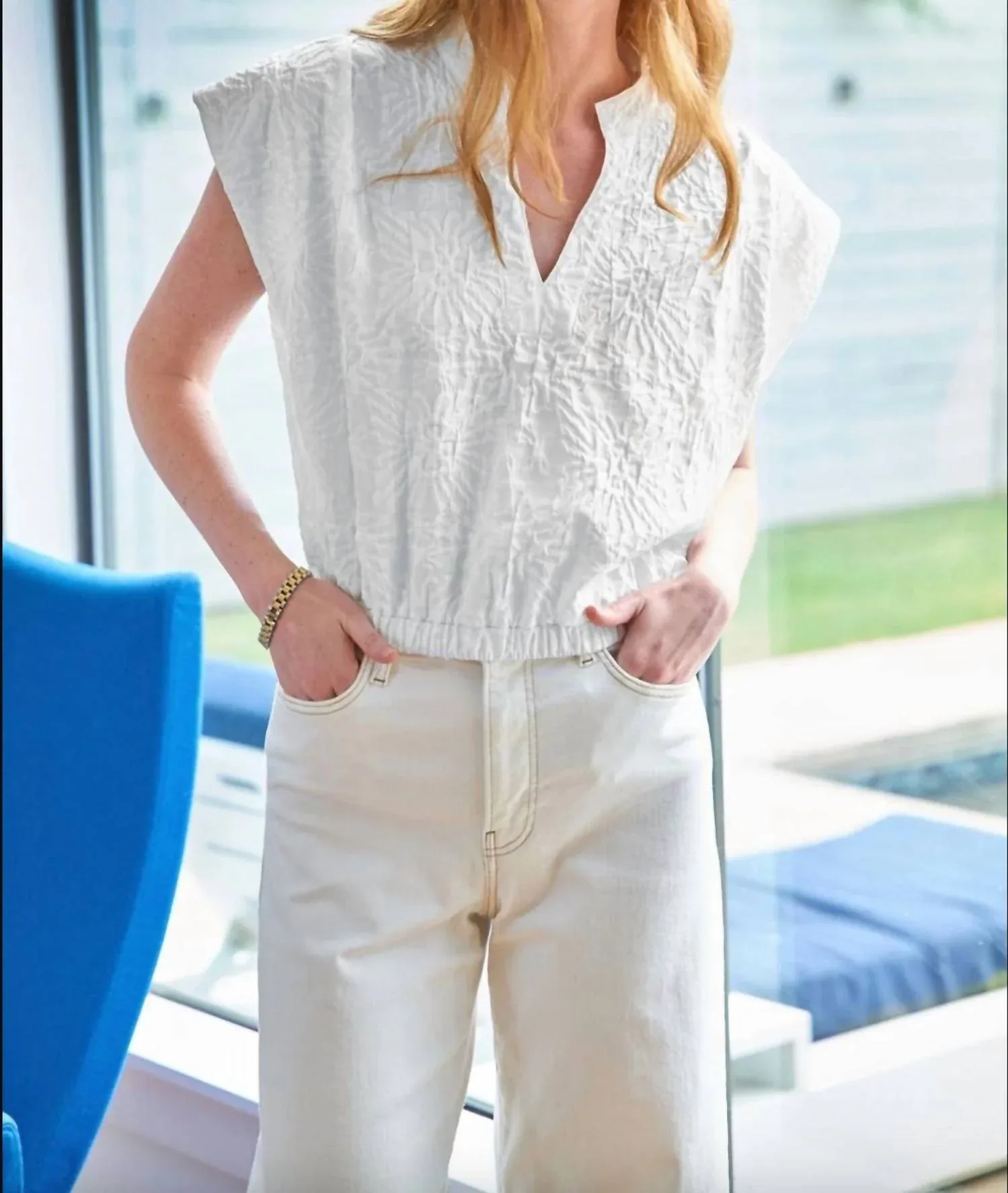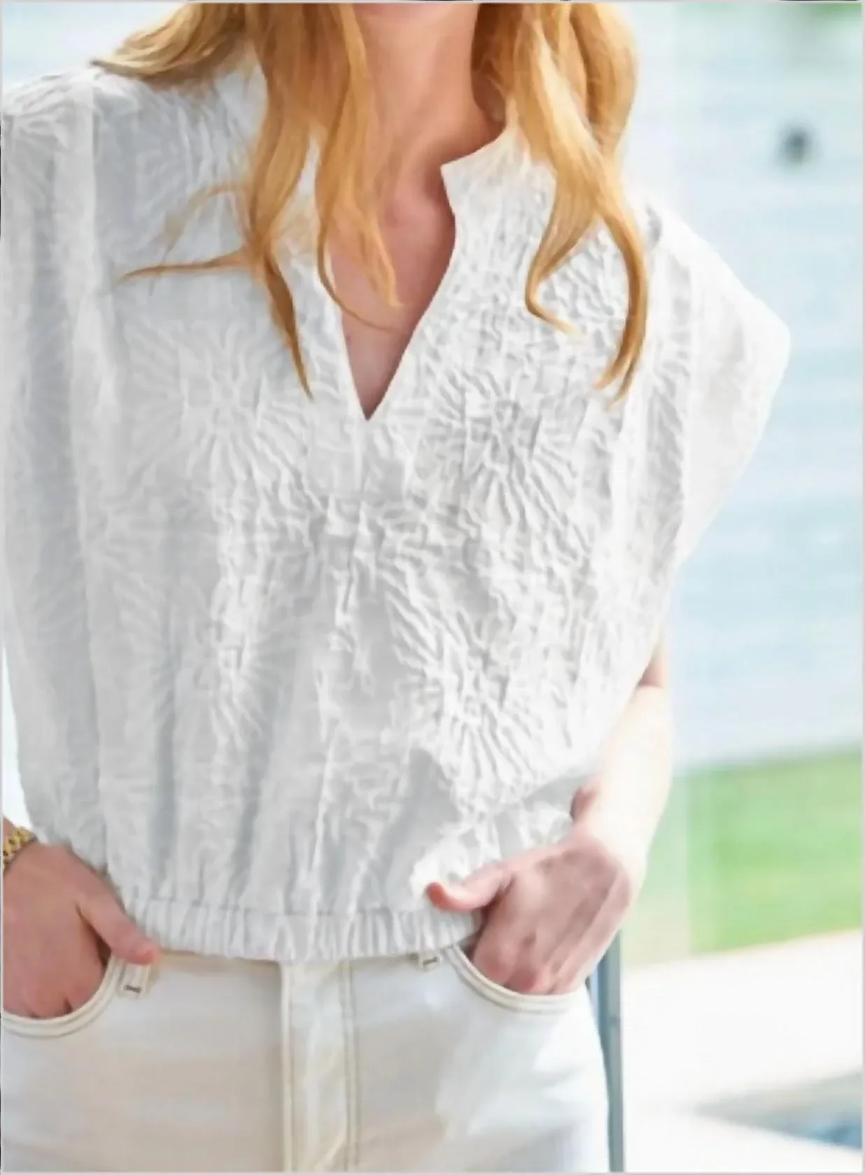 Блузка, которая никогда не выйдет из моды. Представляем блузку Pearl Popover от Finley - изысканное дополнение к любому модному гардеробу. Эта элегантная белая блузка с короткими рукавами и утонченным V-образным вырезом выполнена из роскошной фактурной жаккардовой ткани. Застежка - надевается через голову. Благодаря своему классическому однотонному узору, эта блузка станет уникальным элементом, который выделит вас из толпы.