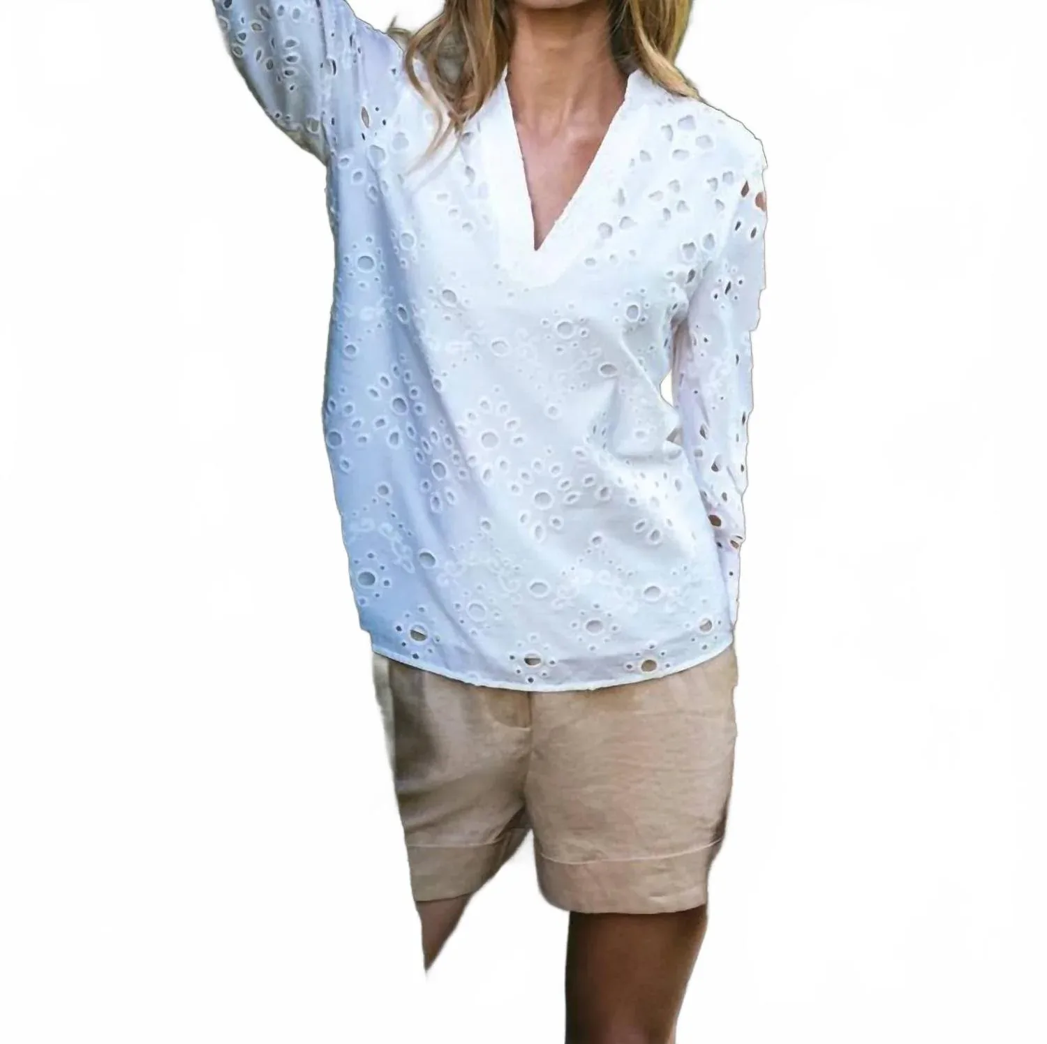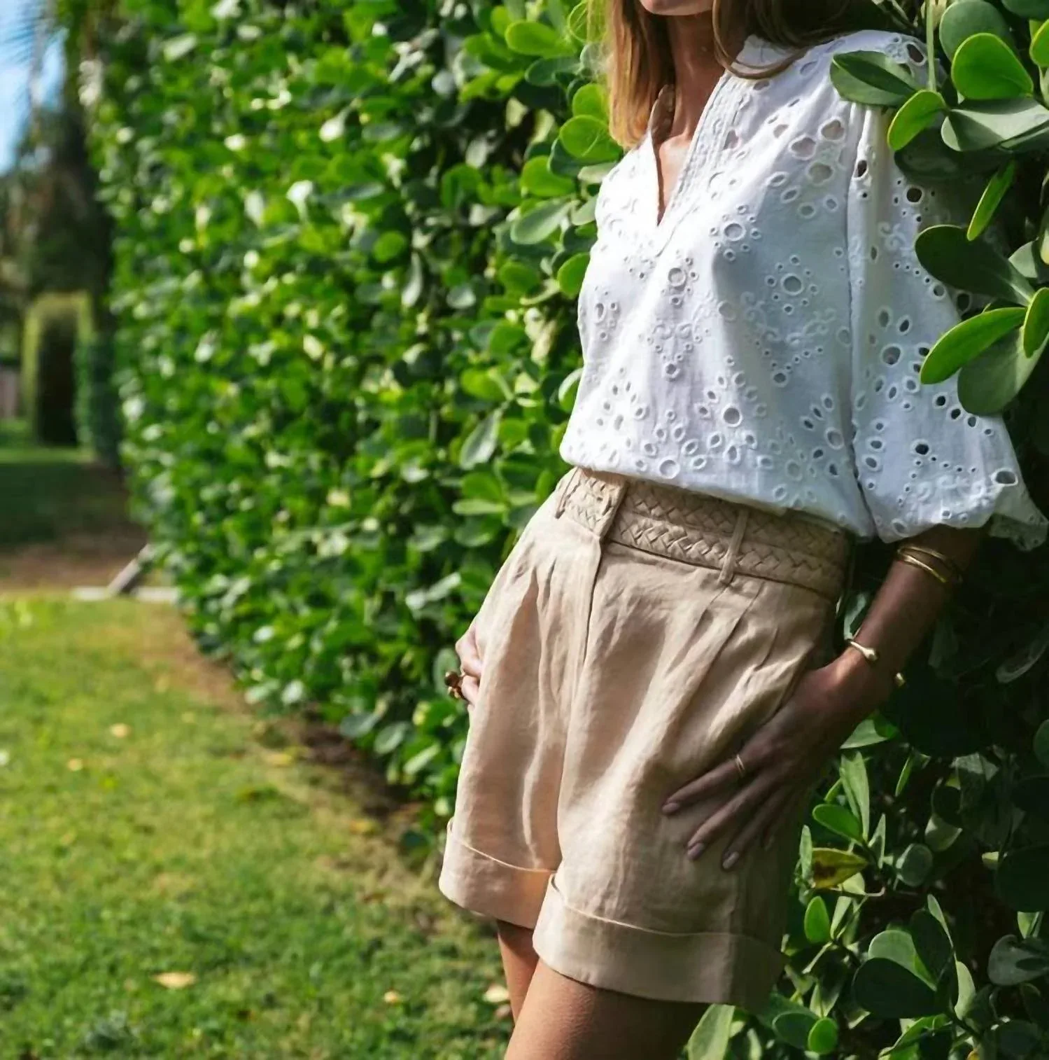 Блузка, которая никогда не выйдет из моды. Представляем блузку Rylie от FIGUE - стильное дополнение к вашему летнему гардеробу в свежем оттенке Chalk. Эта блузка имеет рукава три четверти с внутренней эластичной вставкой, обеспечивающие стиль и комфорт, а также привлекательный V-образный вырез с воротником-стойкой. Изготовлена ​​из 100% хлопка с перфорацией, имеет подкладку в основной части и отсутствие подкладки в рукавах. Длина от самой высокой точки до низа составляет 26 1/2 дюйма. Импортная модель свободного кроя, застегивается на резинку и подлежит только химчистке.