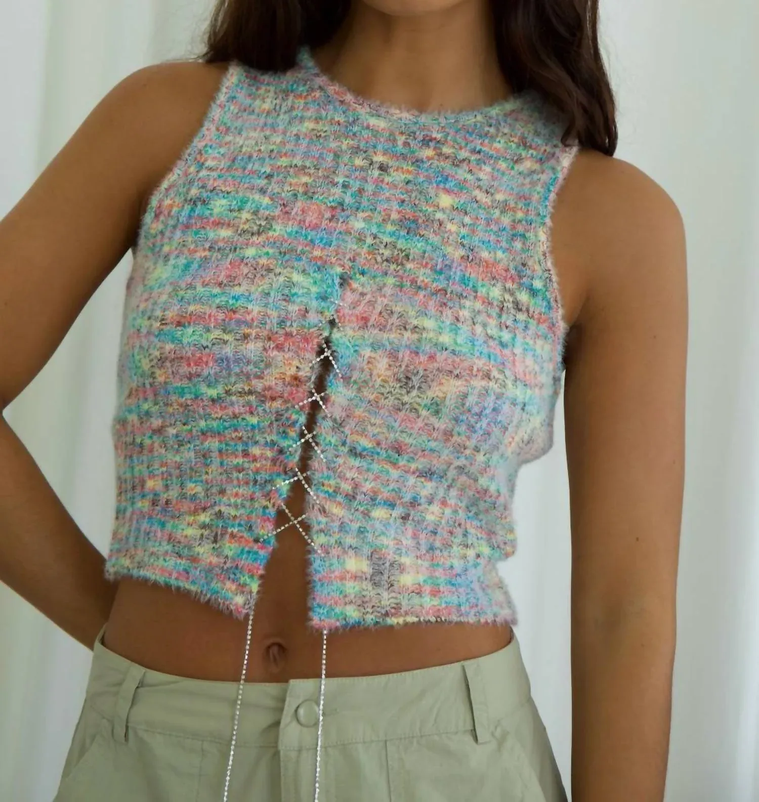 Этот классический топ идеально подходит для многослойных образов и достаточно симпатичен, чтобы носить его и отдельно. Обновите свой гардероб с помощью топа Sugar Rush Jewel Top от Pretty Garbage - женской модели без рукавов, идеально подходящей для весенних мероприятий. Изготовленный из узорчатой ​​многоцветной меланжевой ткани, состоящей на 70% из нейлона и на 30% из акрила, этот топ представляет собой уютный свитер из эластичной ткани. Благодаря застежке на шнуровке с украшениями и круглому вырезу горловины, он выглядит стильно. Для сохранения свежести изделия рекомендуется ручная стирка. Модель ростом 168 см (5’6") носит размер S.