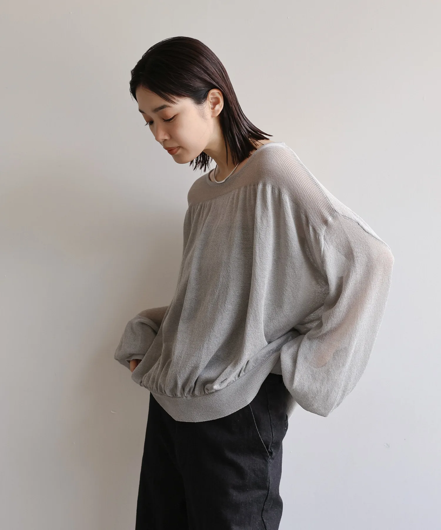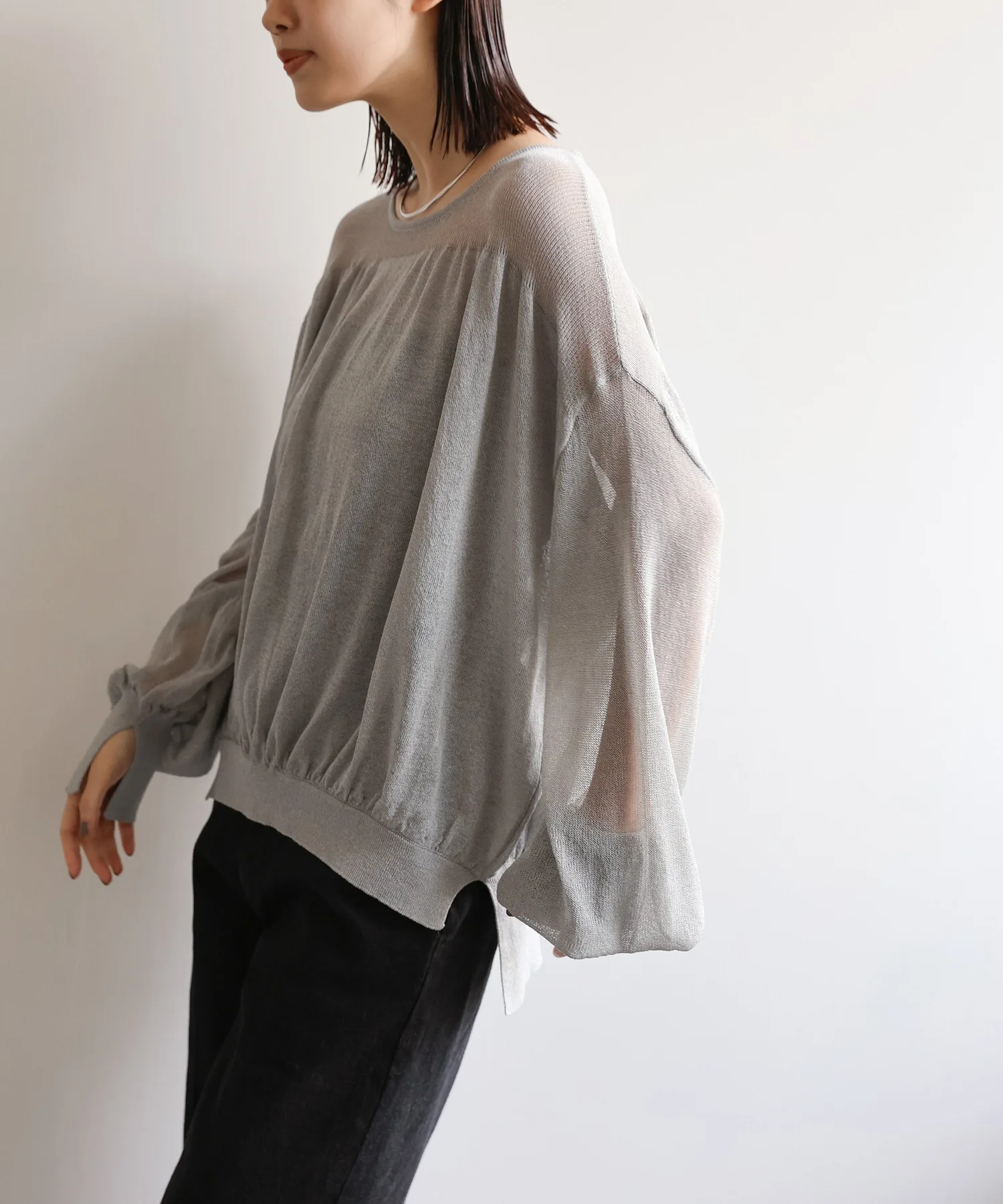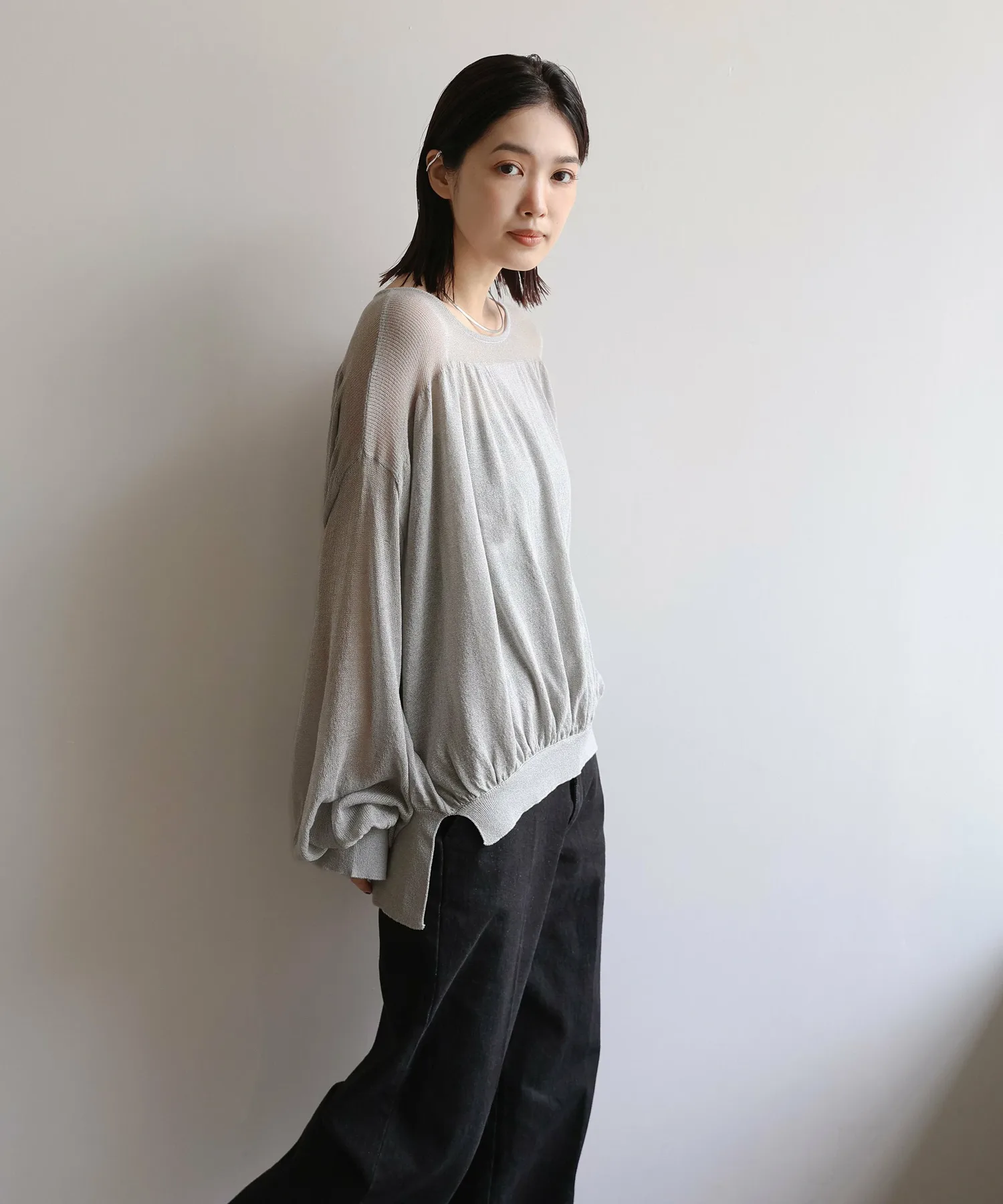 Свободный крой с разницей в длине спереди и сзади закрывает бедра, а разрезы на рукавах и подоле добавляют изысканности.