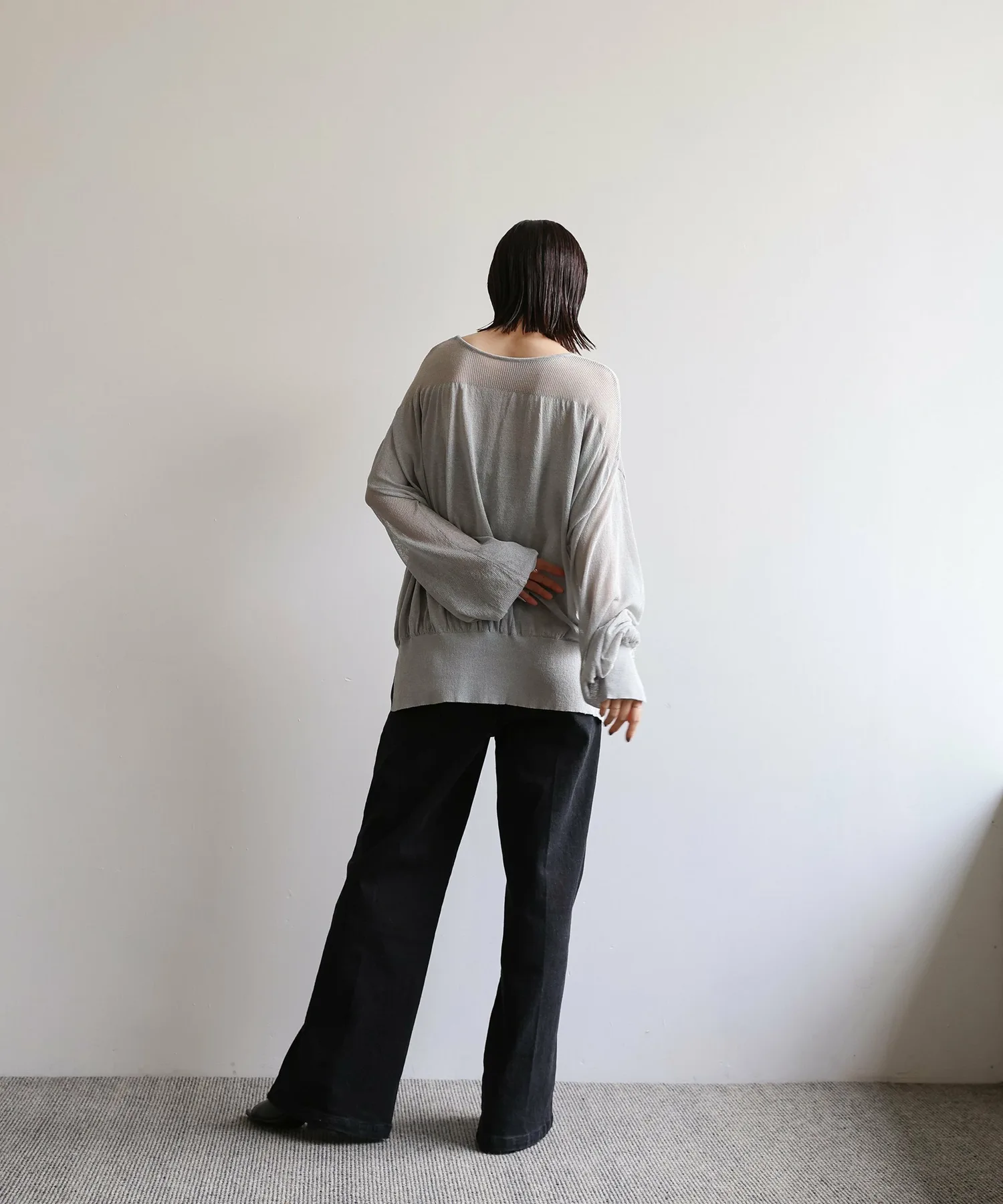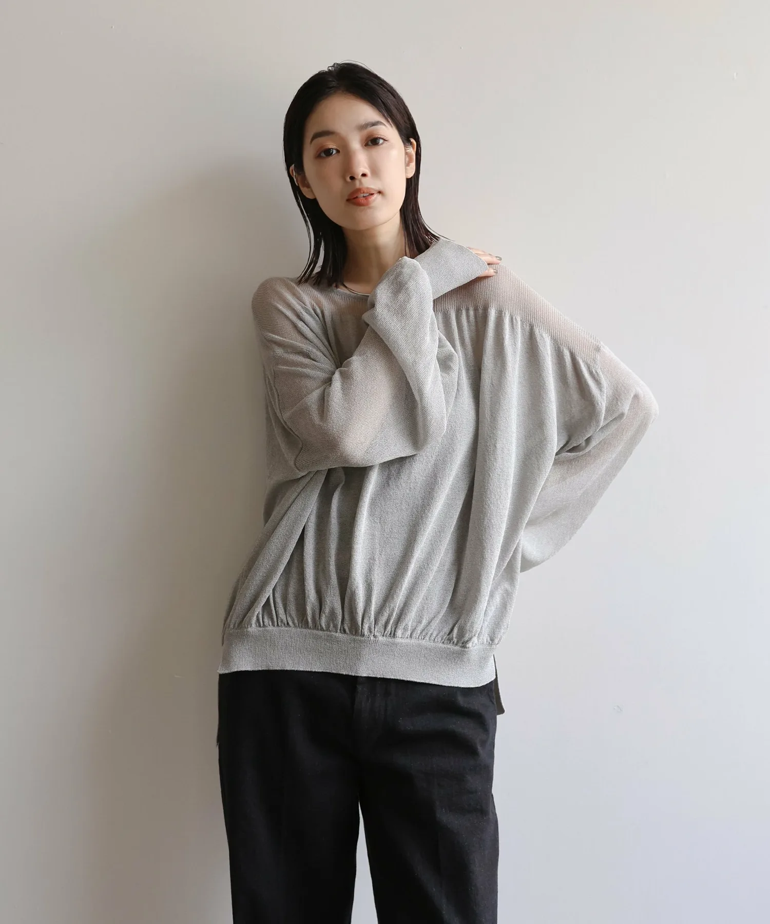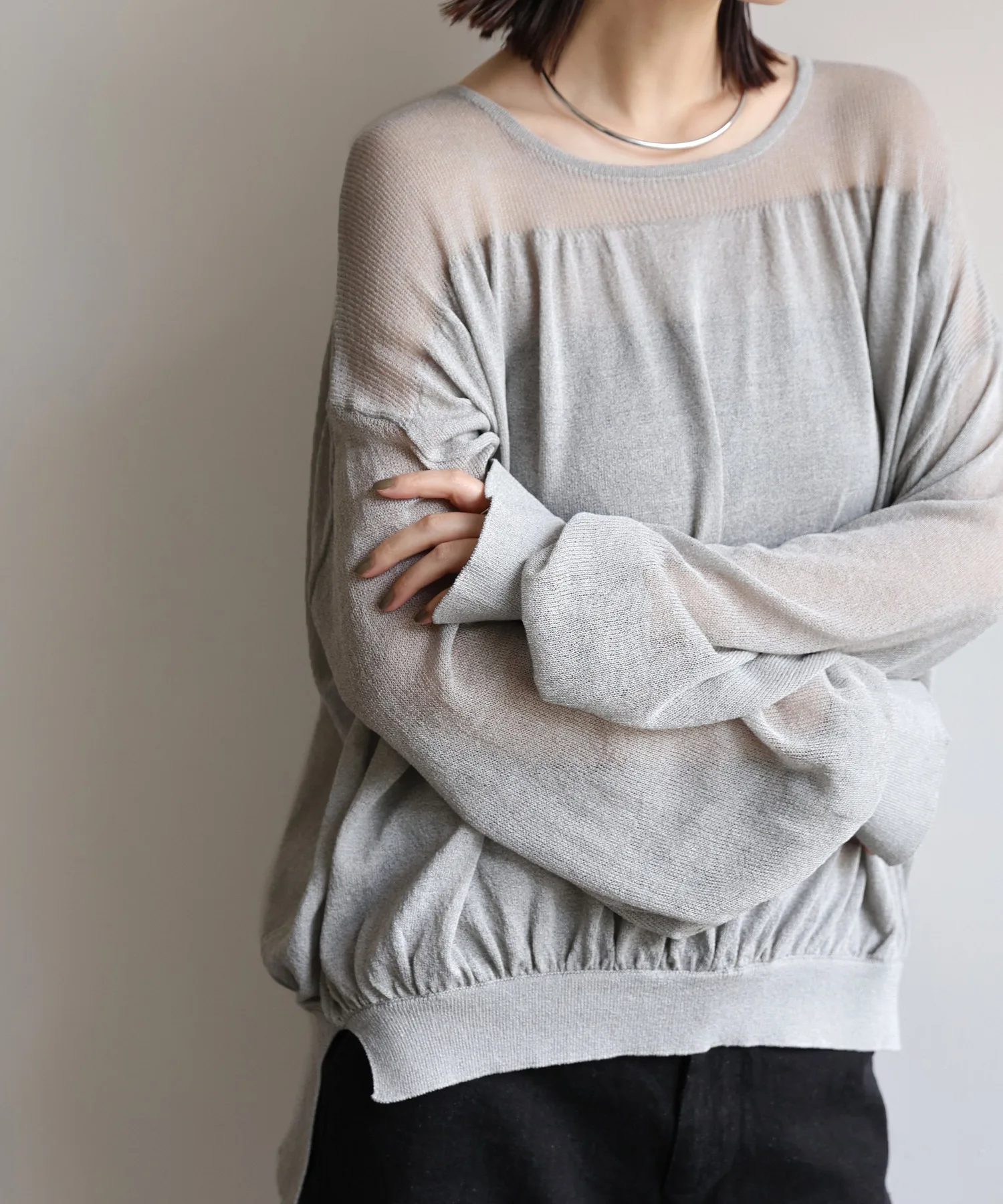 Свободный крой с разницей в длине спереди и сзади закрывает бедра, а разрезы на рукавах и подоле добавляют изысканности.