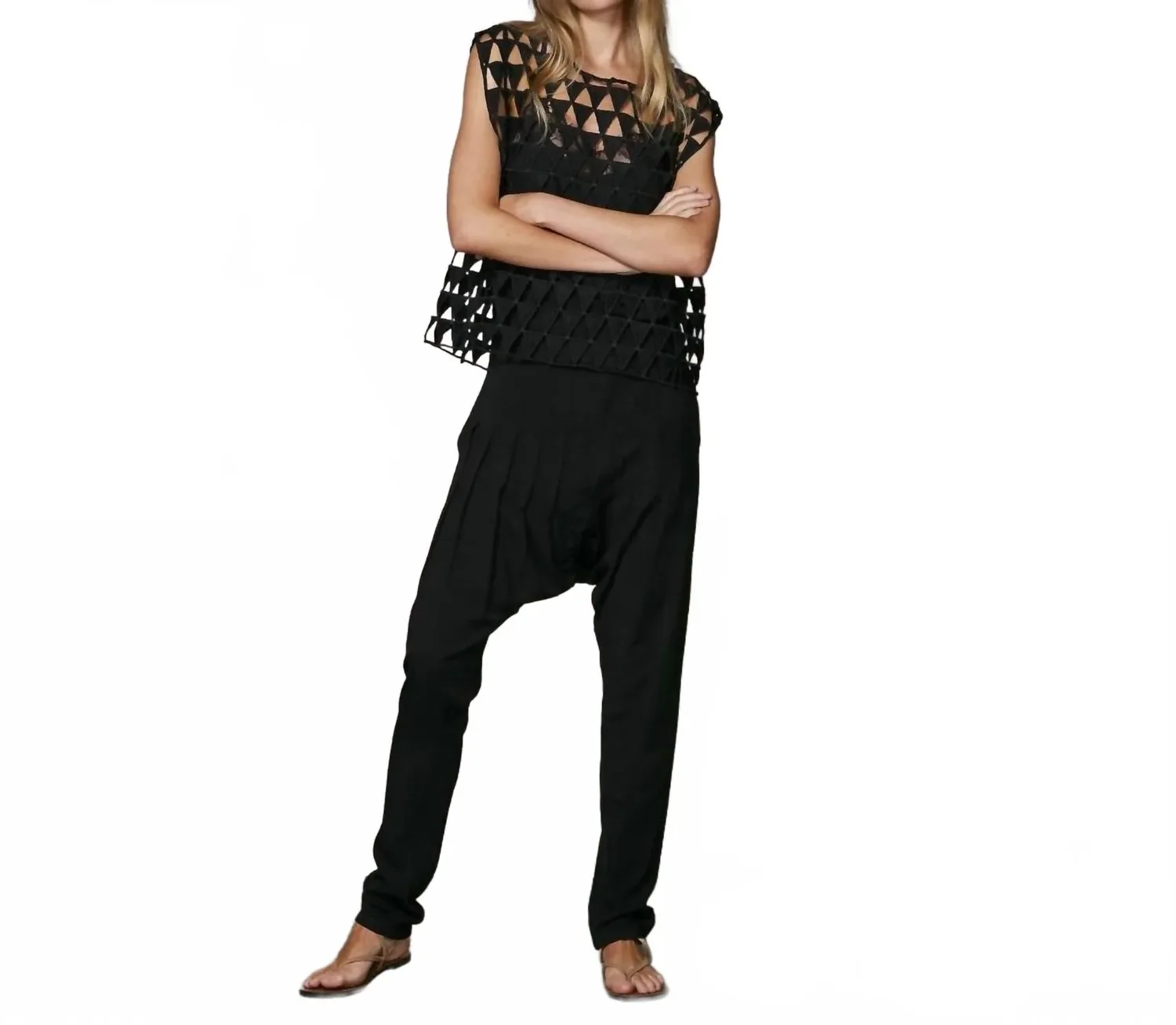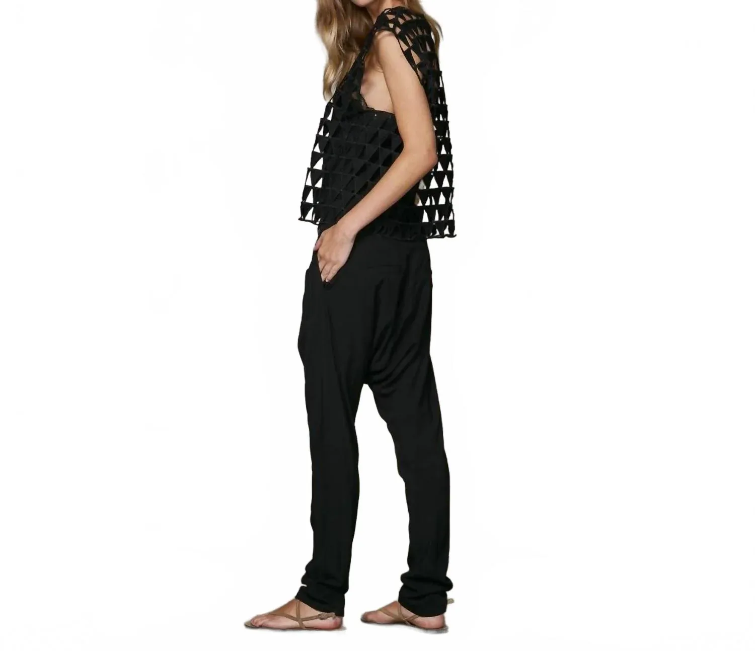 Сочетайте эту блузку с любимыми джинсами и шлепанцами для следующего девичника. Топ Zena от NU Denmark предлагает современный взгляд на летний стиль благодаря прозрачной сетчатой ткани с треугольными вырезами, создающими текстурный и графический эффект. Эта модель без рукавов имеет широкие плечи и вырез-лодочку, что придает ей структурированный, но воздушный вид, идеально подходящий для ношения поверх облегающего топа или бюстгальтера. Застежка-молния обеспечивает удобство надевания, а отсутствие специальных инструкций по стирке и сушке позволяет ухаживать за изделием индивидуально. Идеально подходит для отдыха: сочетайте эту черную структурированную блузку со свободными брюками для шикарного, расслабленного образа.