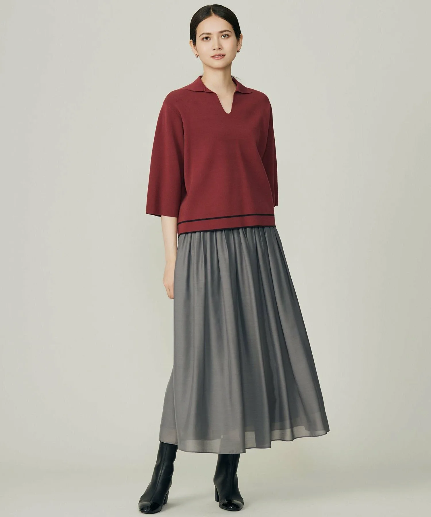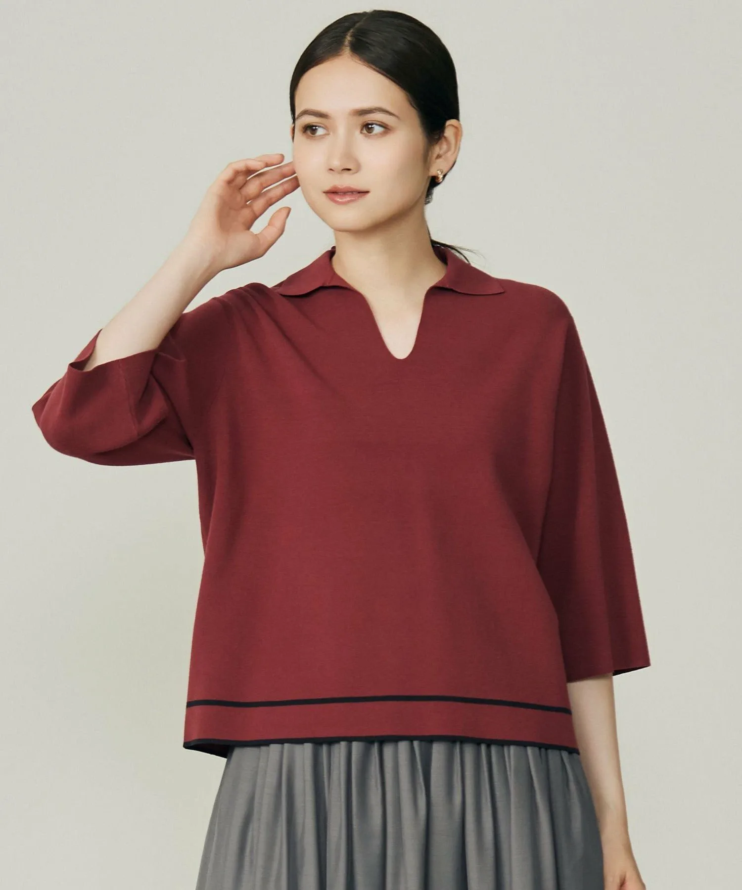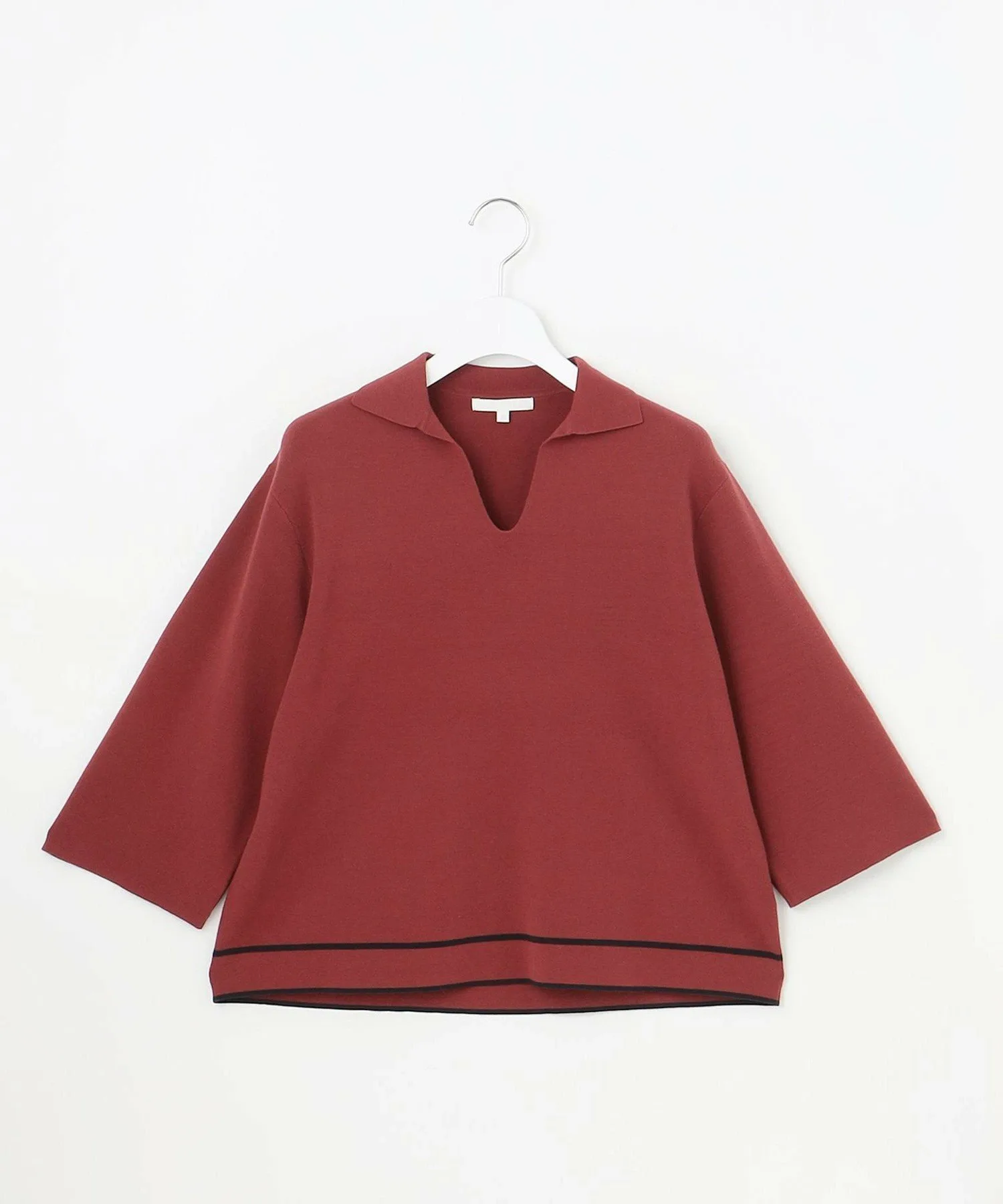 Этот трикотажный свитер с воротником-поло идеально сочетает в себе спортивный стиль и элегантность. Дизайн: Этот свитер имеет полосатый край для создания ретро-спортивного образа. Трикотаж с воротником — модный тренд. Свободный крой рукавов и компактная форма создают комфортный и одновременно лаконичный образ. Изготовленный из универсального материала, этот свитер станет вашей любимой вещью на долгие годы. Материал: Этот элегантный материал сочетает в себе мягкую вискозу и эластичность для комфортного, струящегося ощущения. Он удобен, мягок, воздухопроницаем и обладает изысканным блеском. Тот же материал: Трикотажная футболка (KRWMCW0455), юбка (SKWMGW0351)