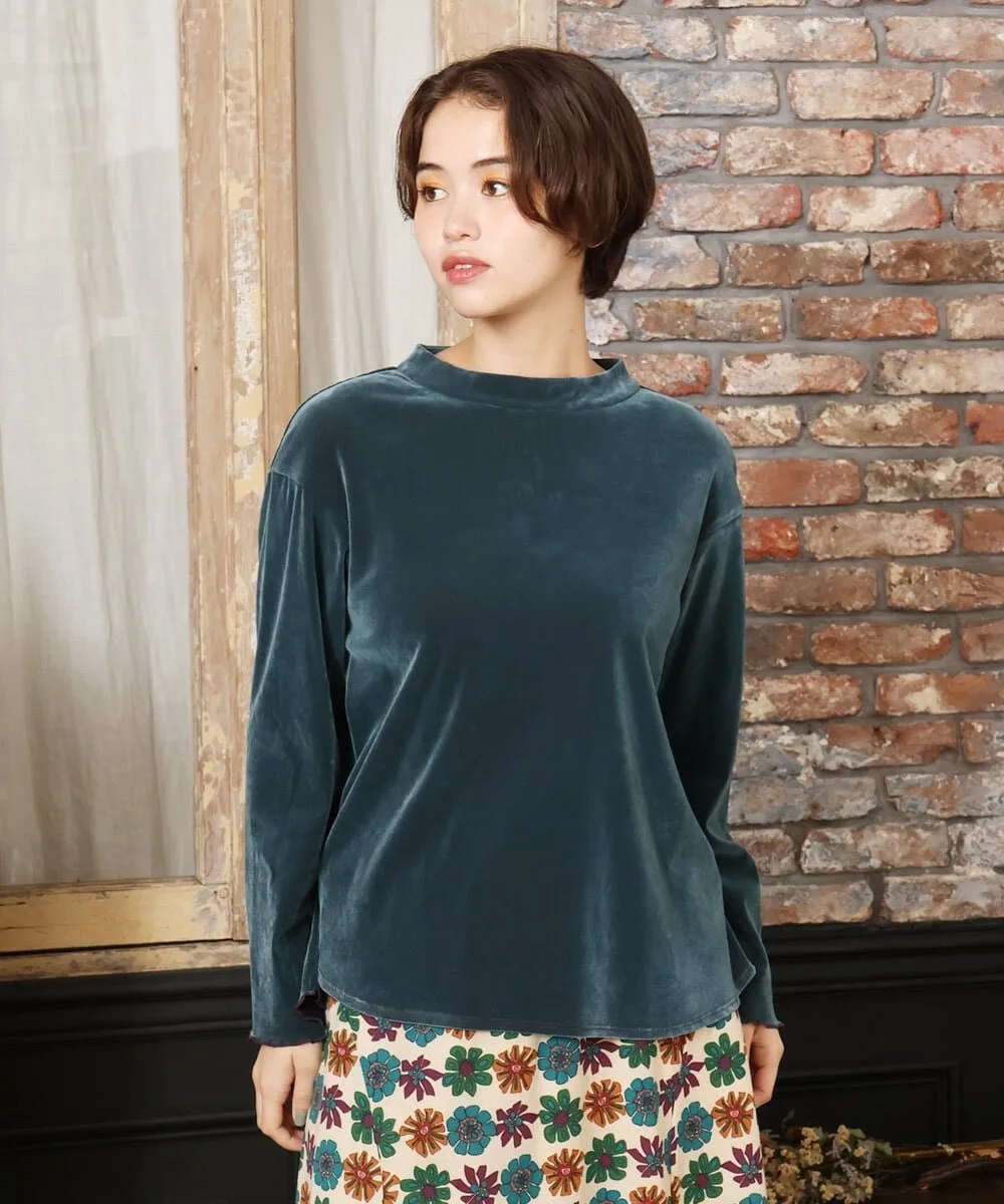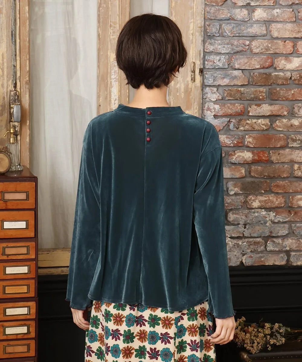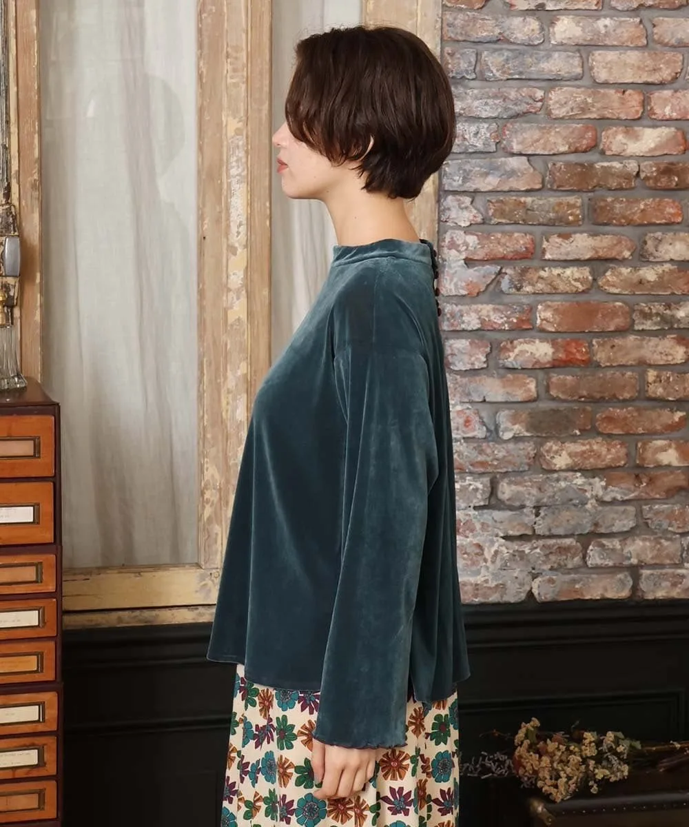 Топ, сшитый из велюровой ткани. Мягкий материал и приспущенные плечи создают расслабленный силуэт. Простой фасон пуловера. Воротник-стойка придает элегантный вид. Пуговицы сзади позволяют легко надевать и снимать. Оборки на манжетах добавляют изысканности. Просто надев его, вы мгновенно преобразите свой сезонный образ.