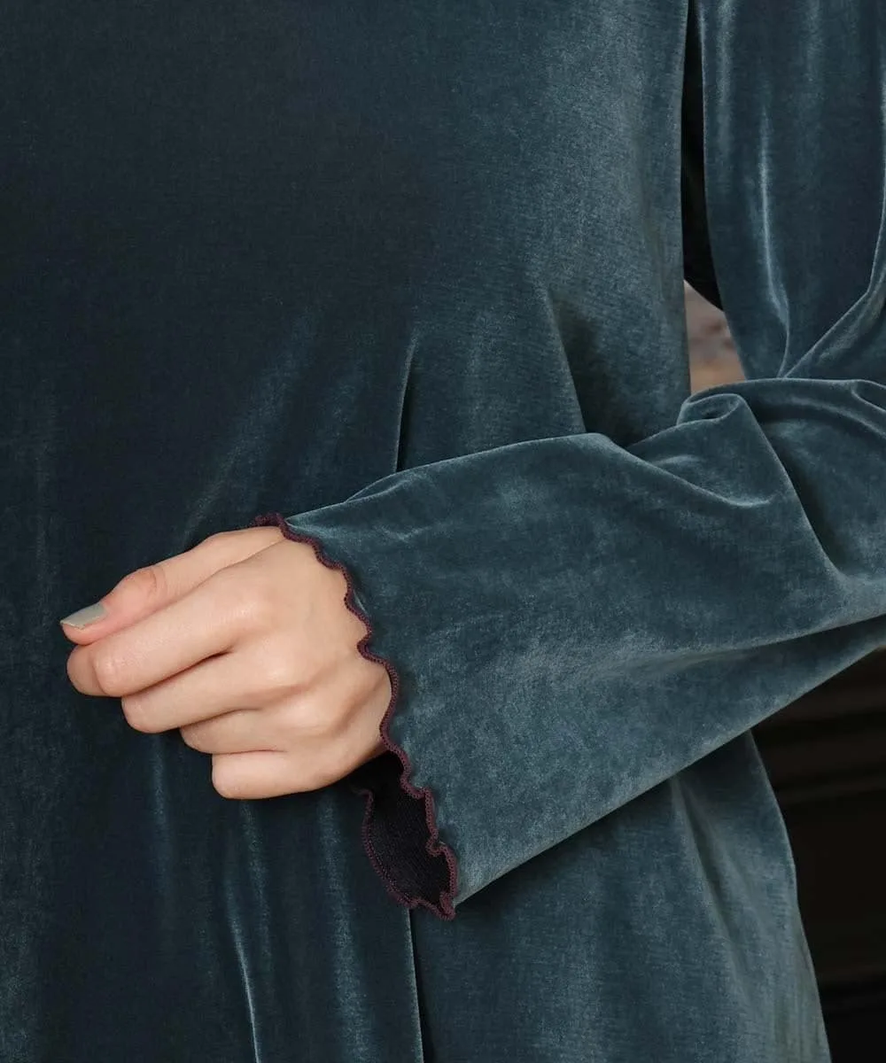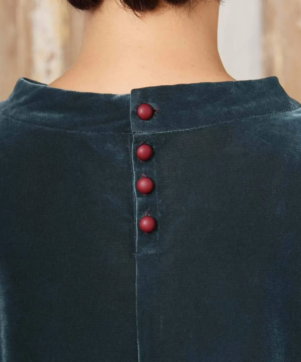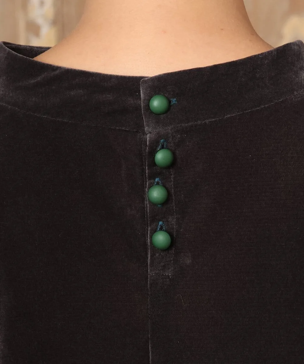 Топ, сшитый из велюровой ткани. Мягкий материал и приспущенные плечи создают расслабленный силуэт. Простой фасон пуловера. Воротник-стойка придает элегантный вид. Пуговицы сзади позволяют легко надевать и снимать. Оборки на манжетах добавляют изысканности. Просто надев его, вы мгновенно преобразите свой сезонный образ.