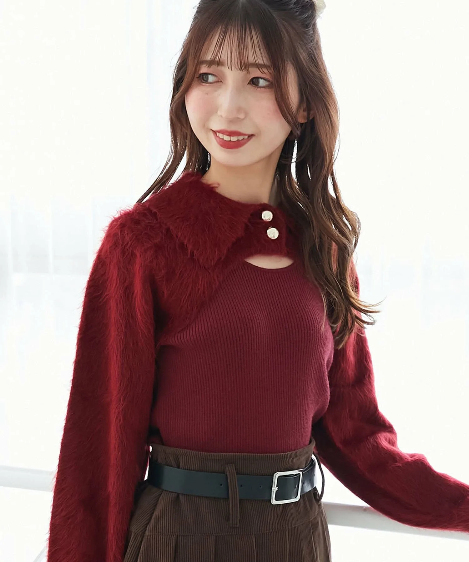 Болеро выполнено из пушистой, ворсистой пряжи для создания небрежной текстуры, а основная часть имеет ребристую структуру для чистого, гладкого силуэта.