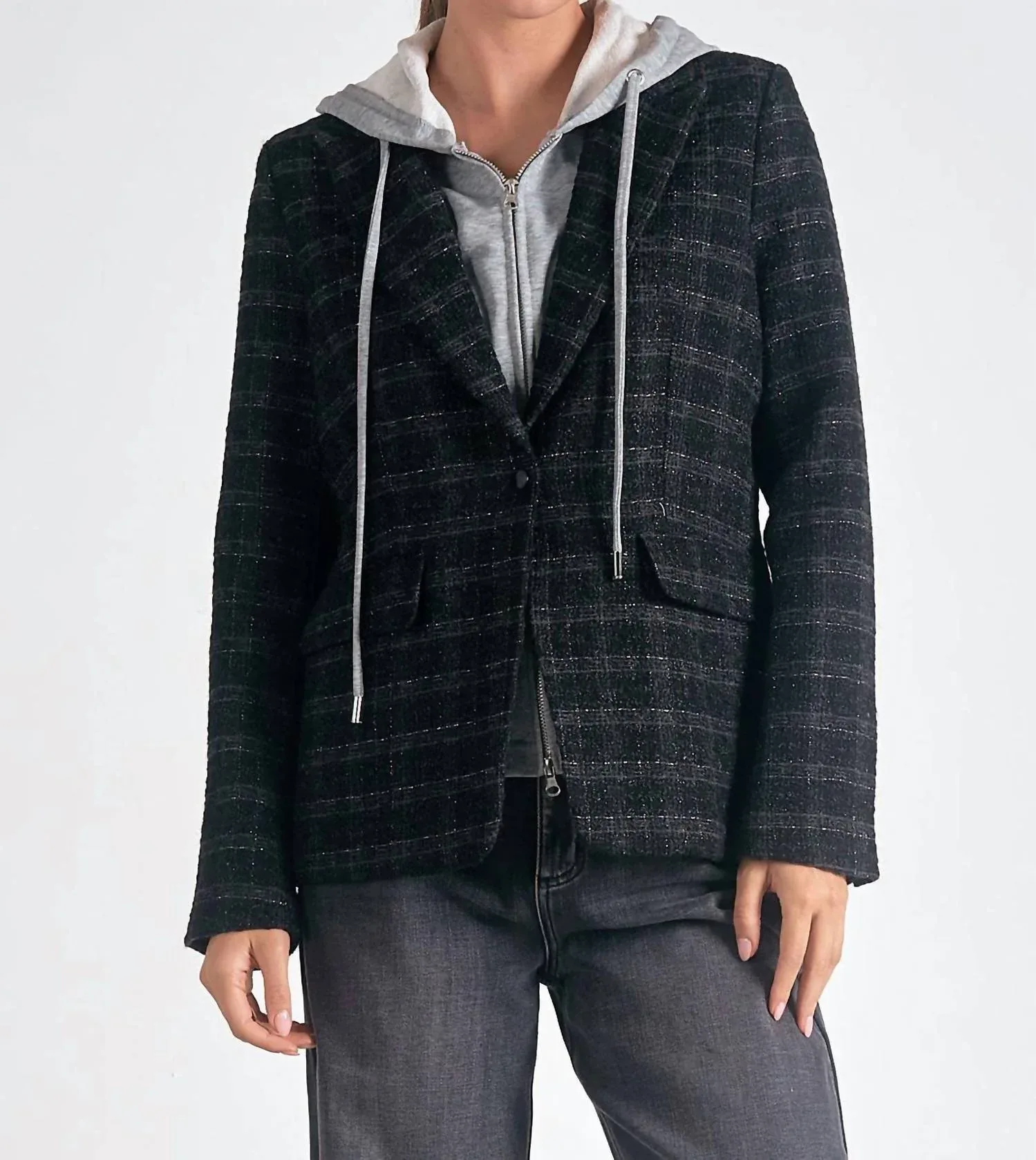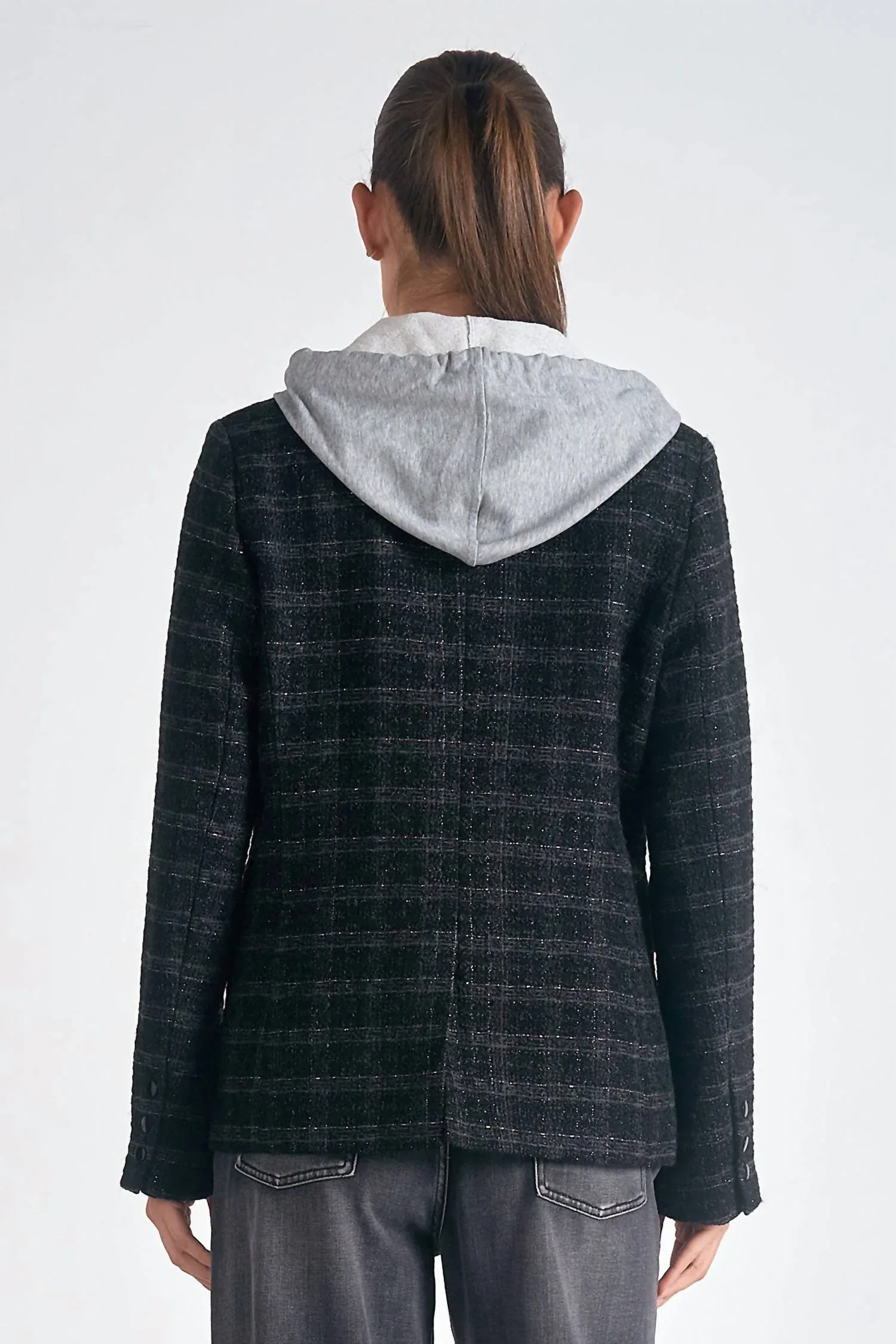 Уникальное сочетание элегантности блейзера и комфорта худи. Модель с длинными рукавами и съемным капюшоном. Черно-серебристая клетка. Изготовлена из твидовой ткани, состоящей из 96% полиэстера и 4% спандекса. Состав худи: 80% хлопка и 20% полиэстера. Можно носить как в расстегнутом, так и в застегнутом виде благодаря застежке на пуговицы и молнии. Удобные накладные карманы спереди. Только химчистка.