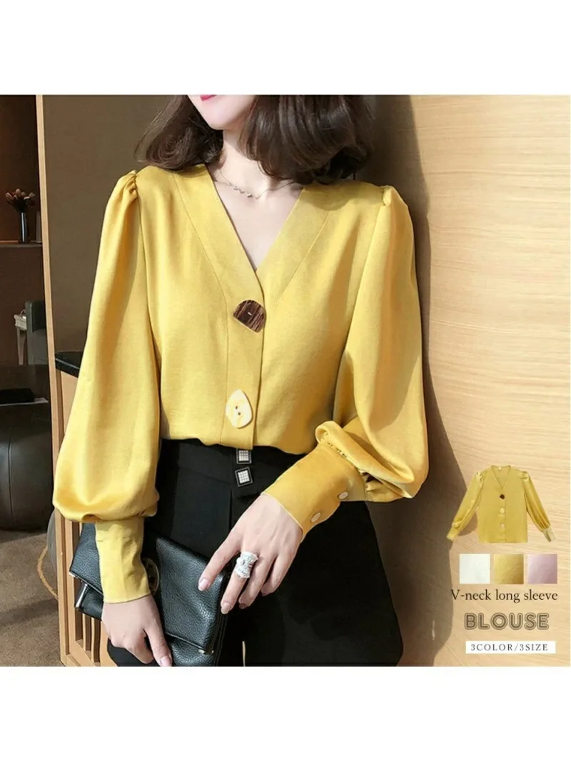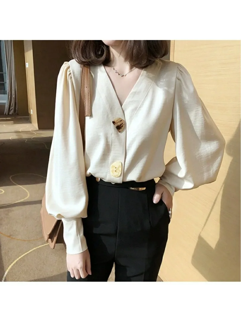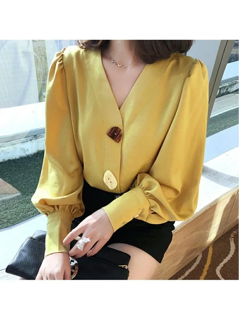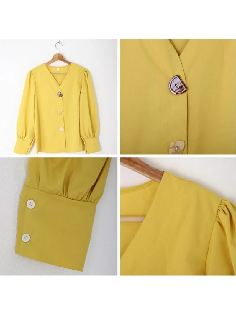 Крупные пуговицы добавляют изюминку этой элегантной блузке с V-образным вырезом.