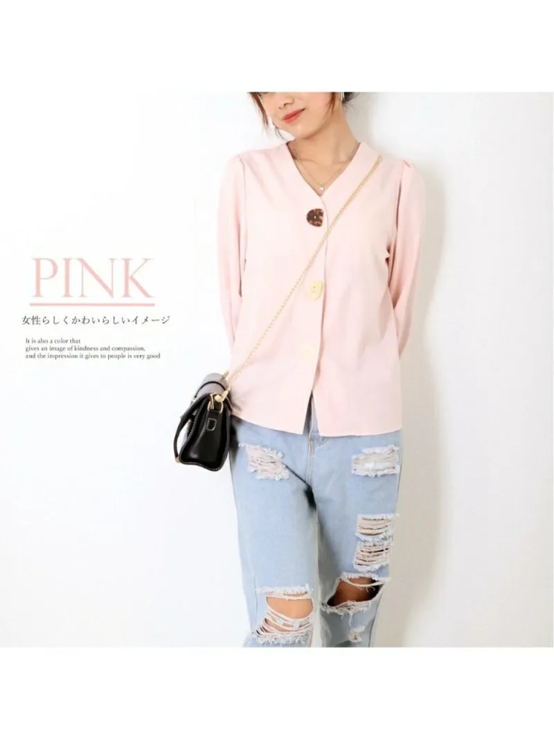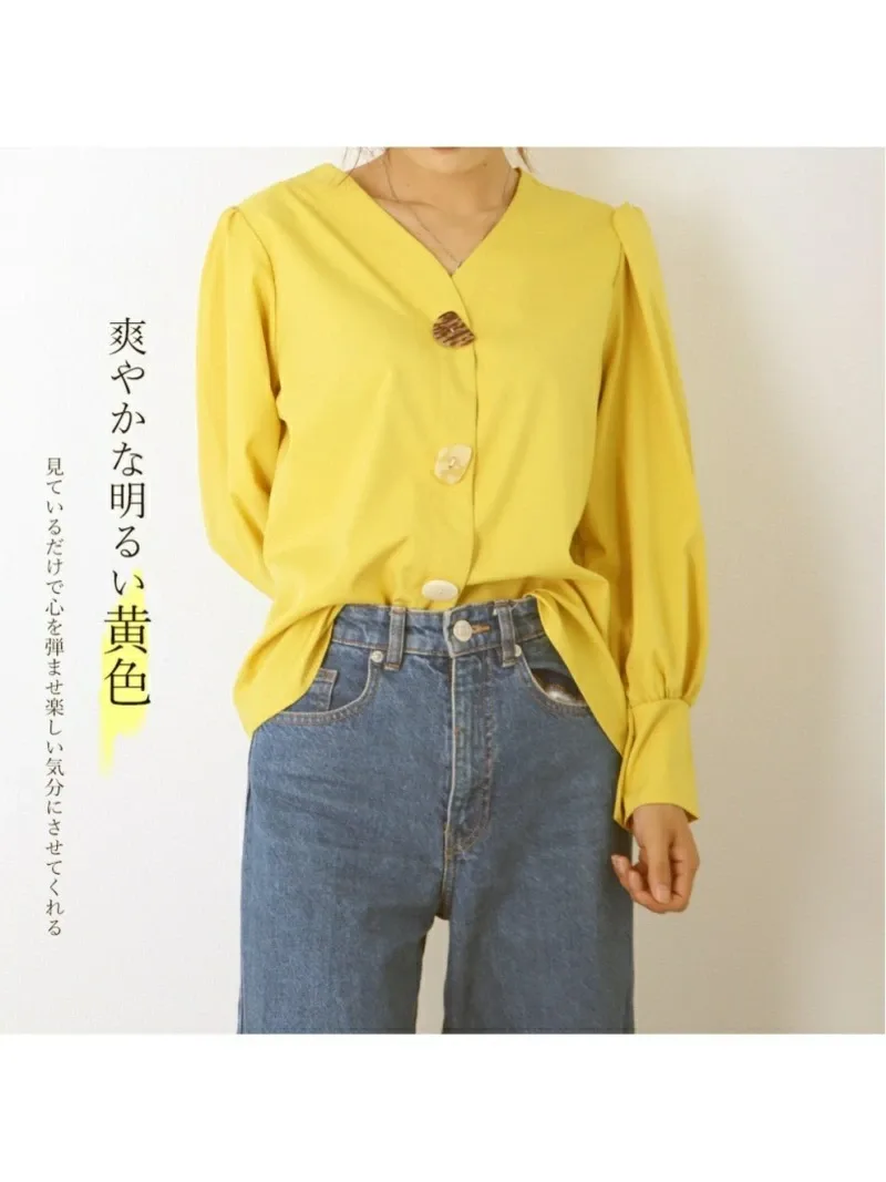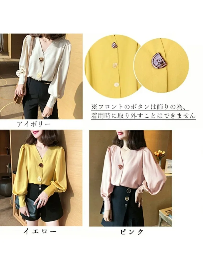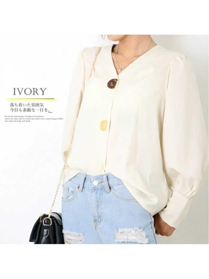 Крупные пуговицы добавляют изюминку этой элегантной блузке с V-образным вырезом.