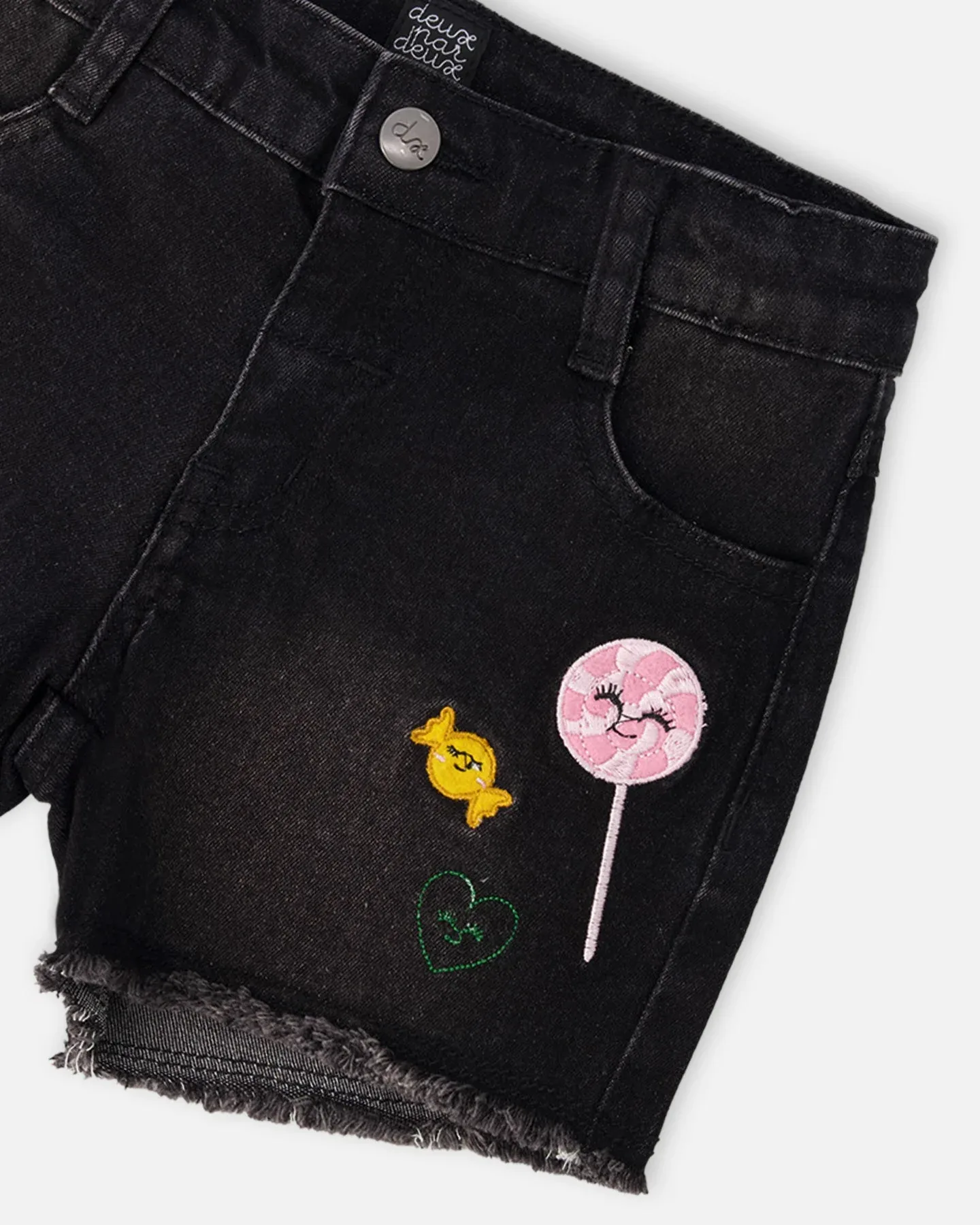 Наши черные джинсовые шорты с вышивкой - это веселый и универсальный летний элемент гардероба. Эти шорты имеют передние карманы-лодочки, застежку на пуговицу и молнию, а также красочные вышитые мотивы конфет и леденцов, придающие им игривый вид. Идеально подходят для повседневной носки и прекрасно сочетаются с нашими жизнерадостными топами из коллекции «Sweets And Swirls».