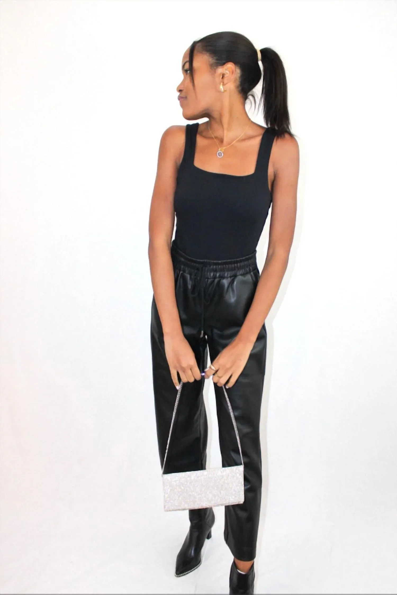 Эти брюки имеют прямой крой, высокую талию и эластичный пояс со шнурком. Они надеваются без застежек и изготовлены из искусственной кожи.