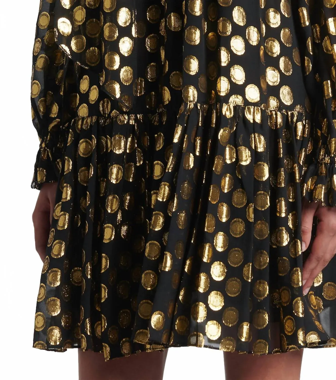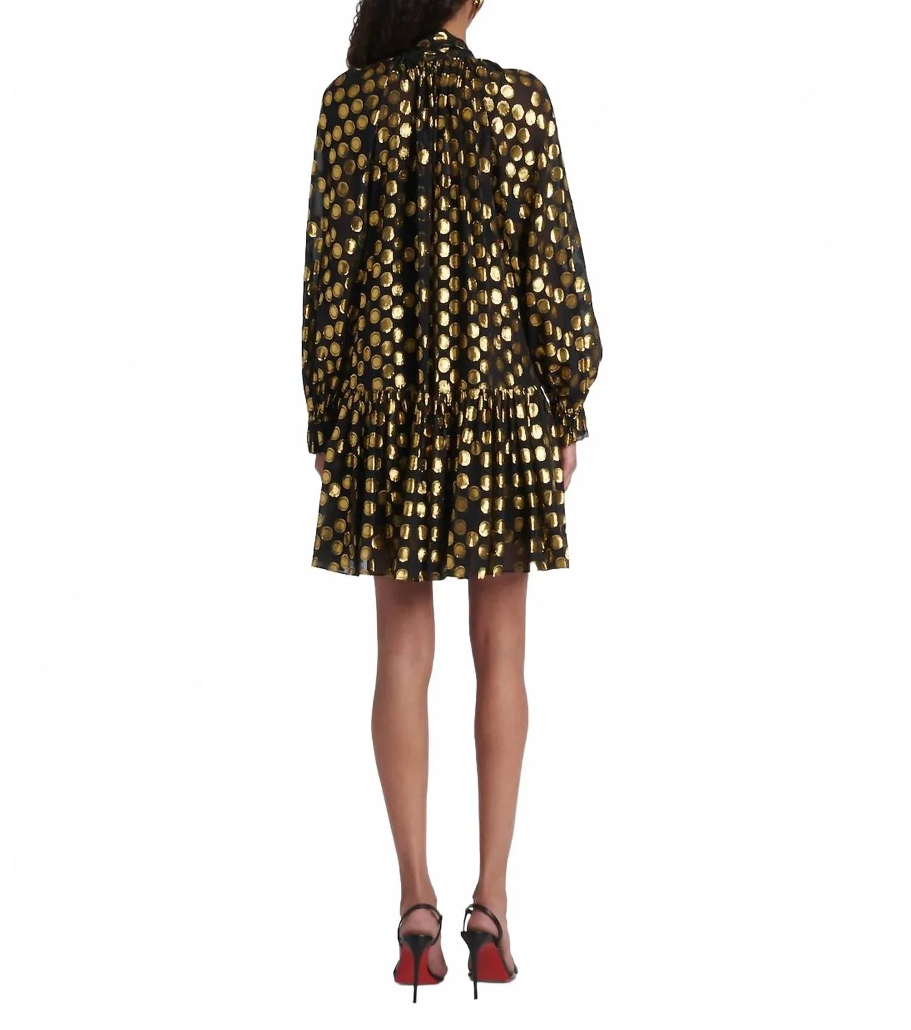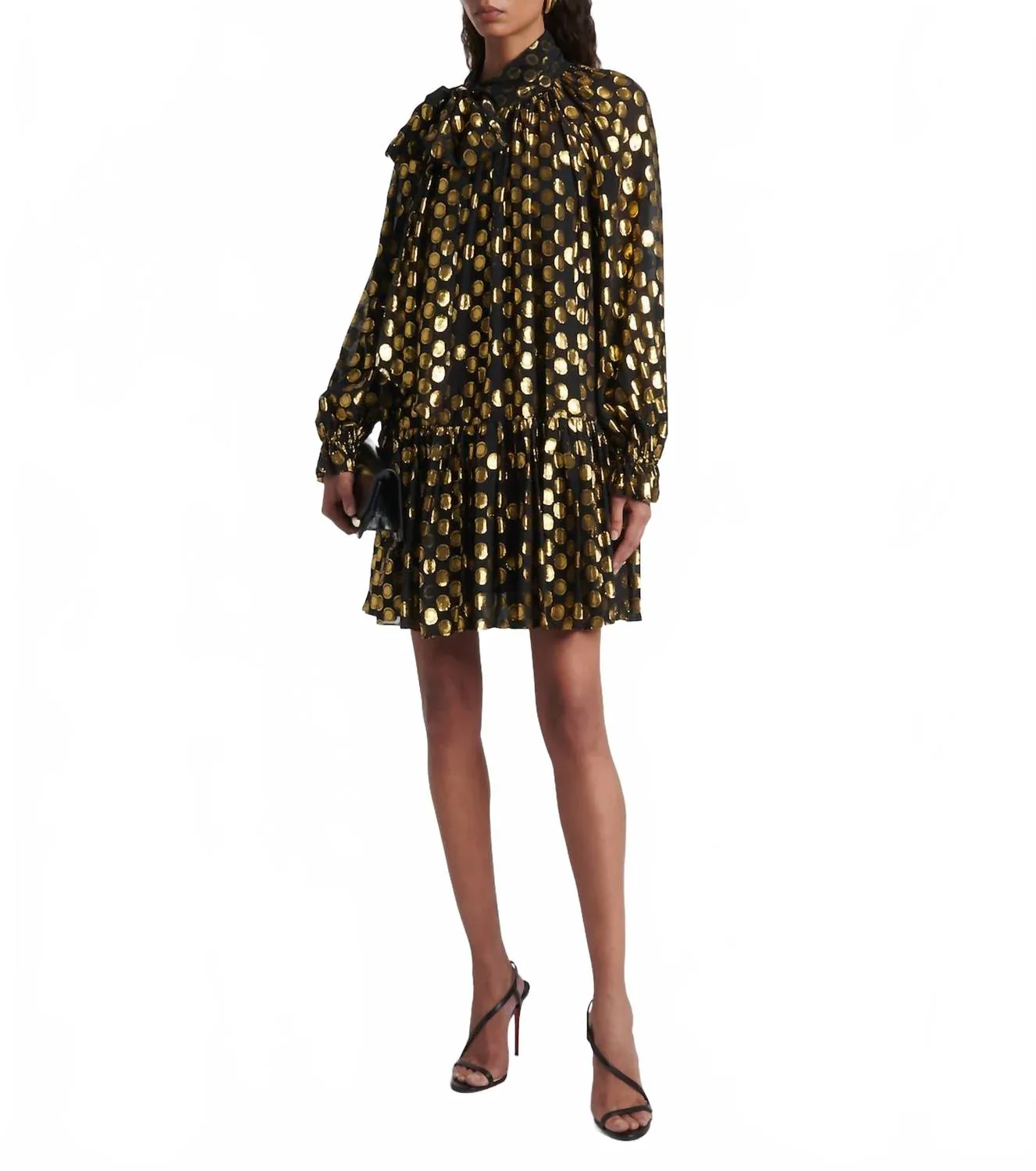 Идеальное мини-платье для теплых месяцев. Окунитесь в элегантность с шелковым мини-платьем Loretta с длинными рукавами от Ulla Johnson в цвете Obsidian. Это изысканное платье имеет длинные рукава с эластичными манжетами, мини-длину и искусно прикрепленный шарф-галстук. Изготовленное из роскошной шелковой смеси (83% шелка и 17% полиэстера), оно украшено золотыми точками, вплетенными в нежный черный шелк, что придает ему роскошный вид. Платье свободного кроя с развевающимся многоярусным подолом, надевается через голову, имеет съемную нижнюю юбку и требует химчистки. Идеально подходит для новогодней вечеринки или любого вечернего мероприятия, где вы хотите блистать.