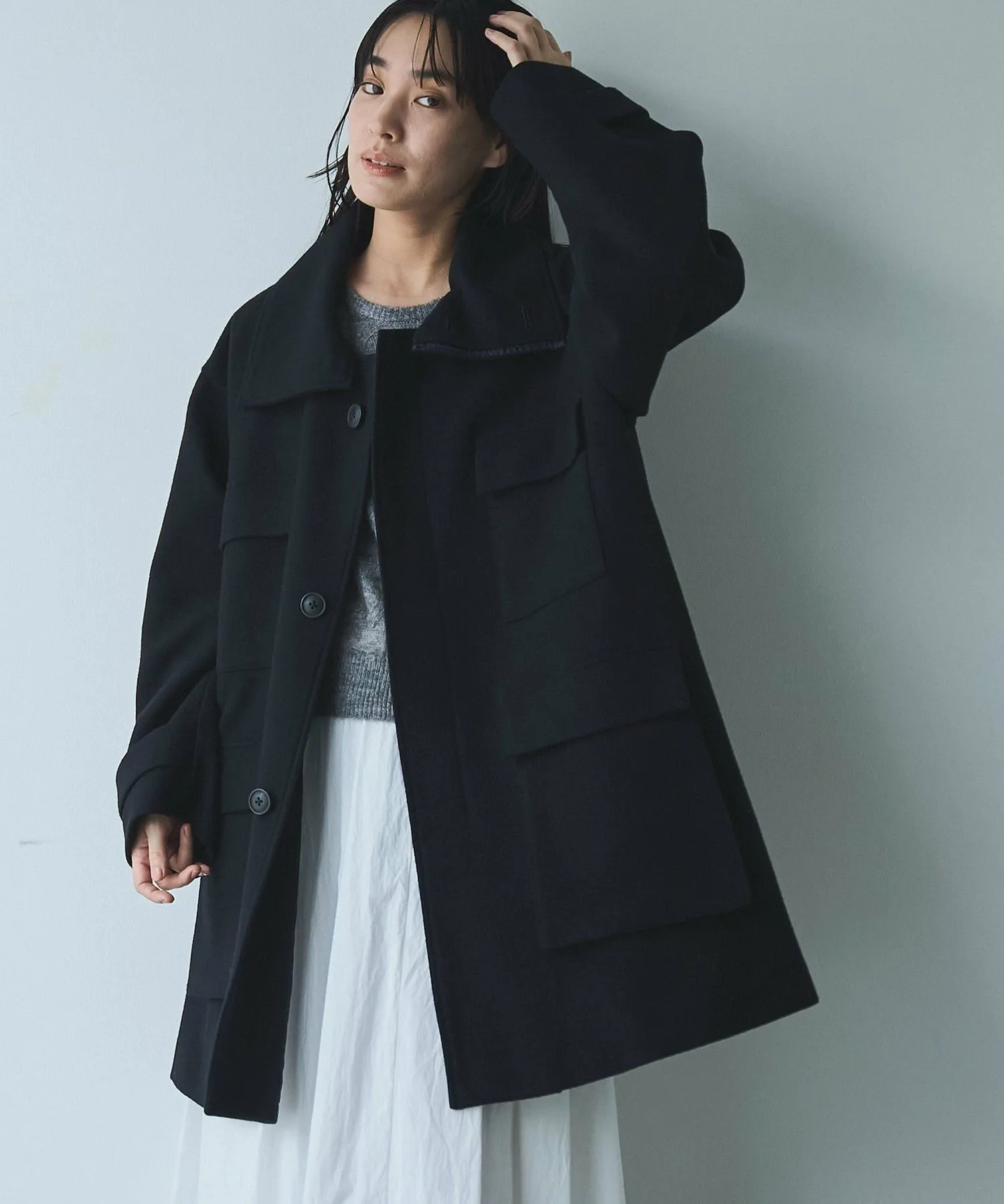 Пальто в стиле милитари с большими карманами.