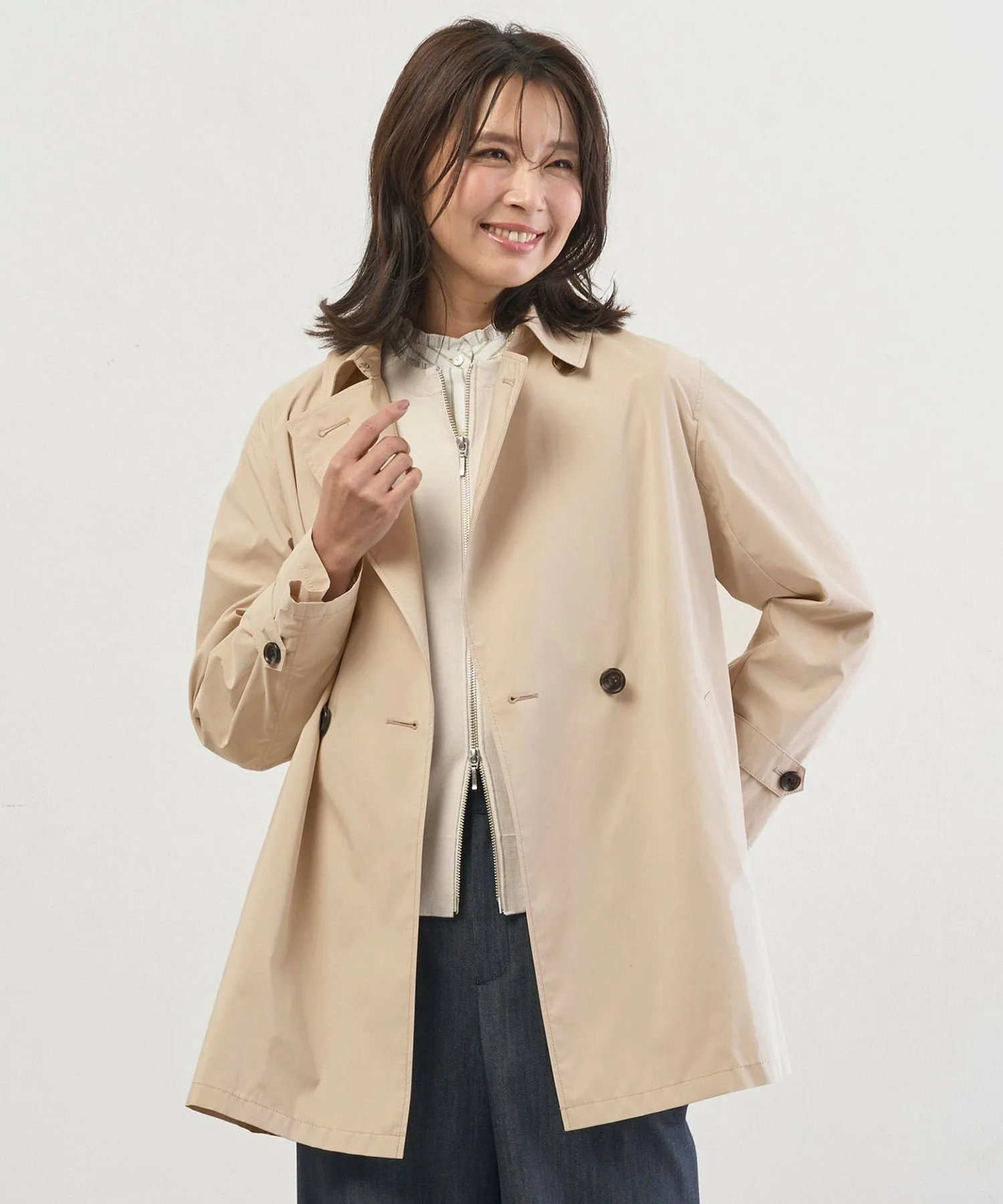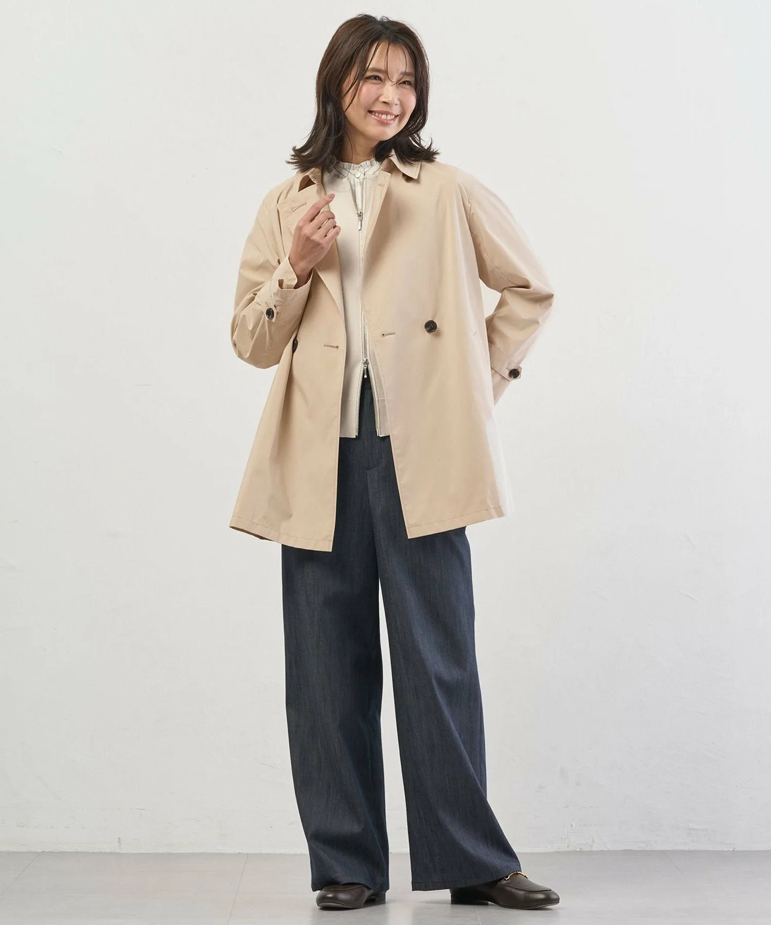 Классическое пальто, создающее легкий и элегантный образ, идеально подходящее для небольшого дождя.