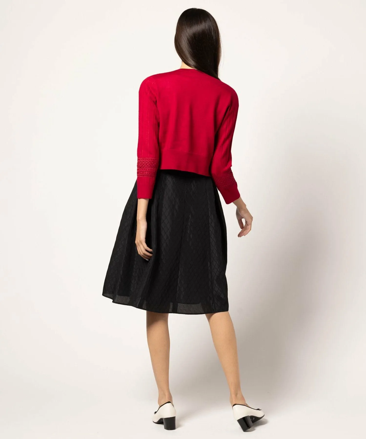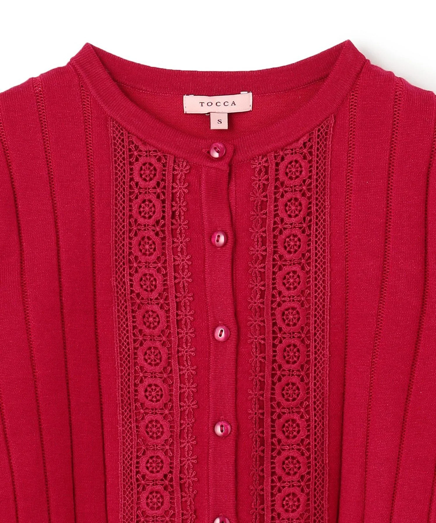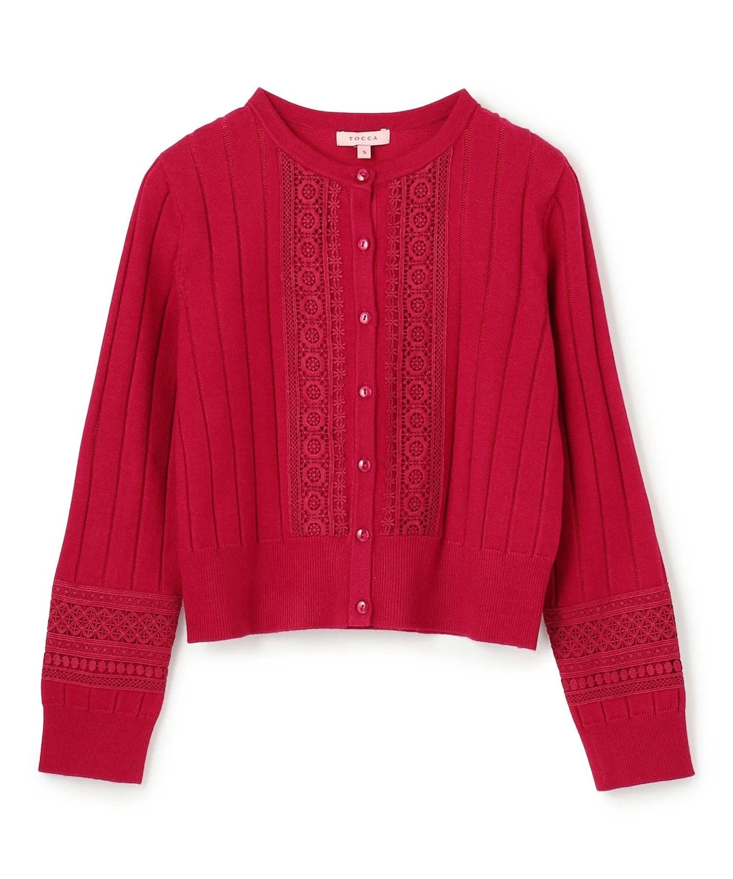Прекрасный кардиган, типичный для TOCCA, сочетающий кружевную вязку и ленточную ажурную отделку.
