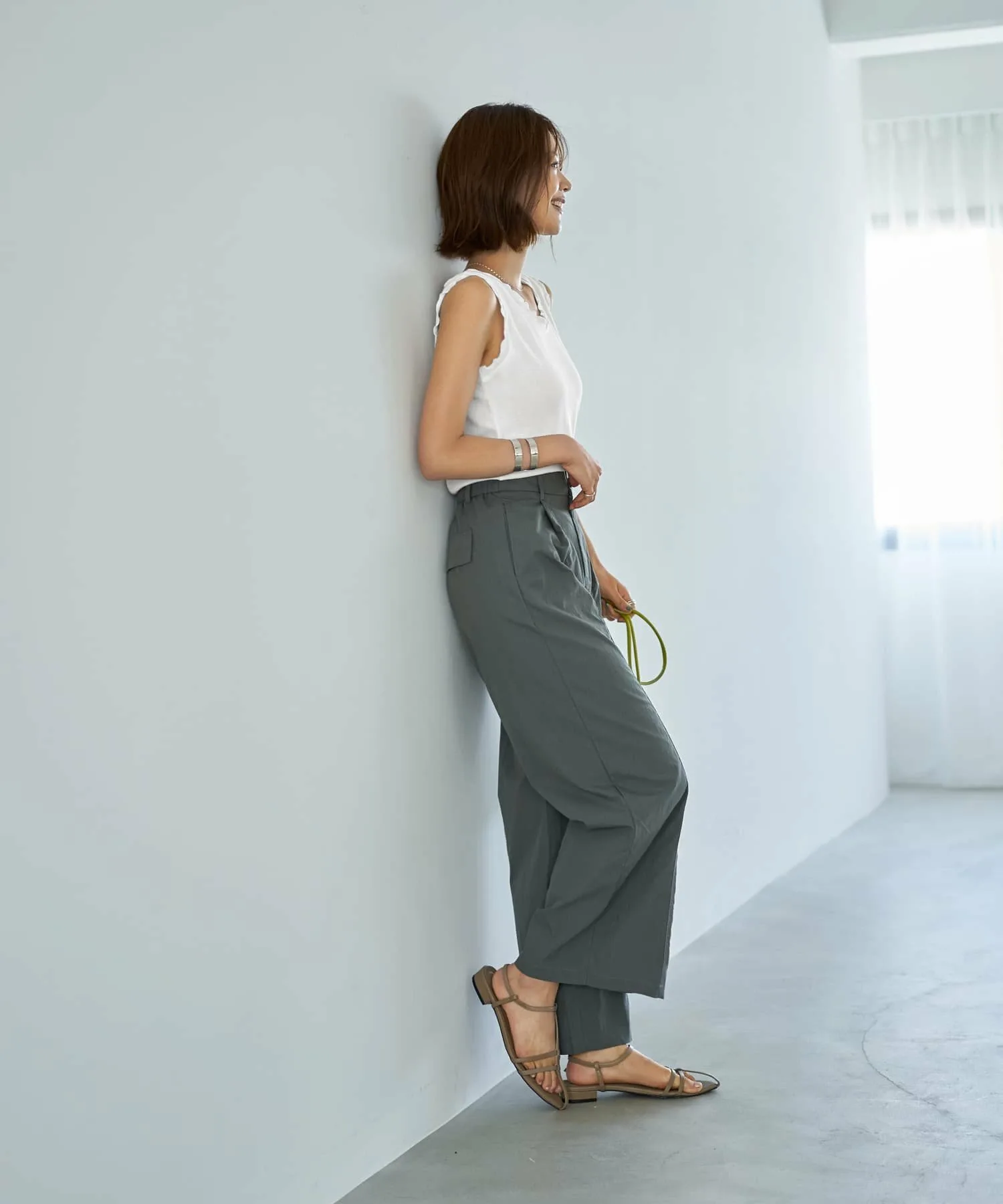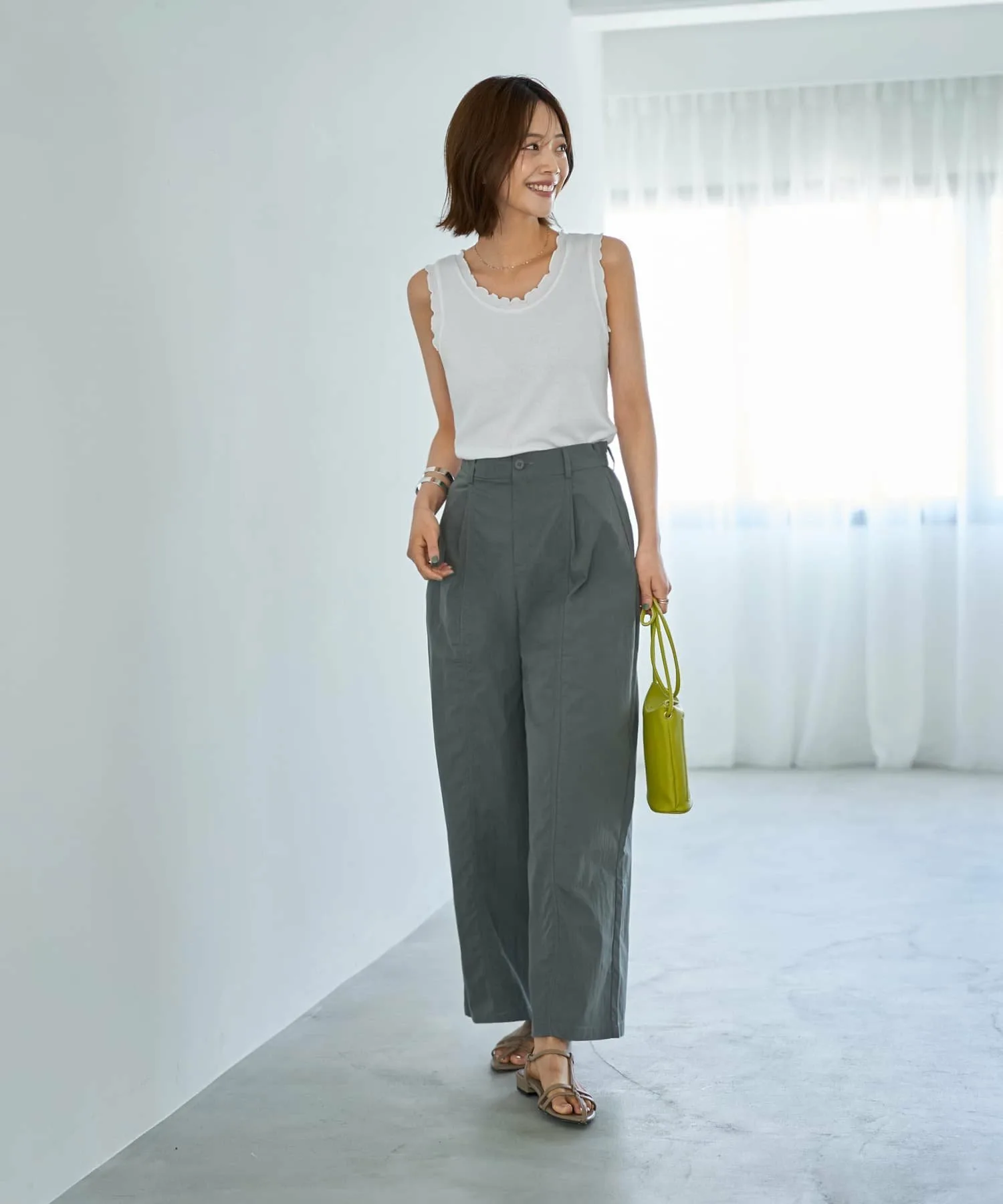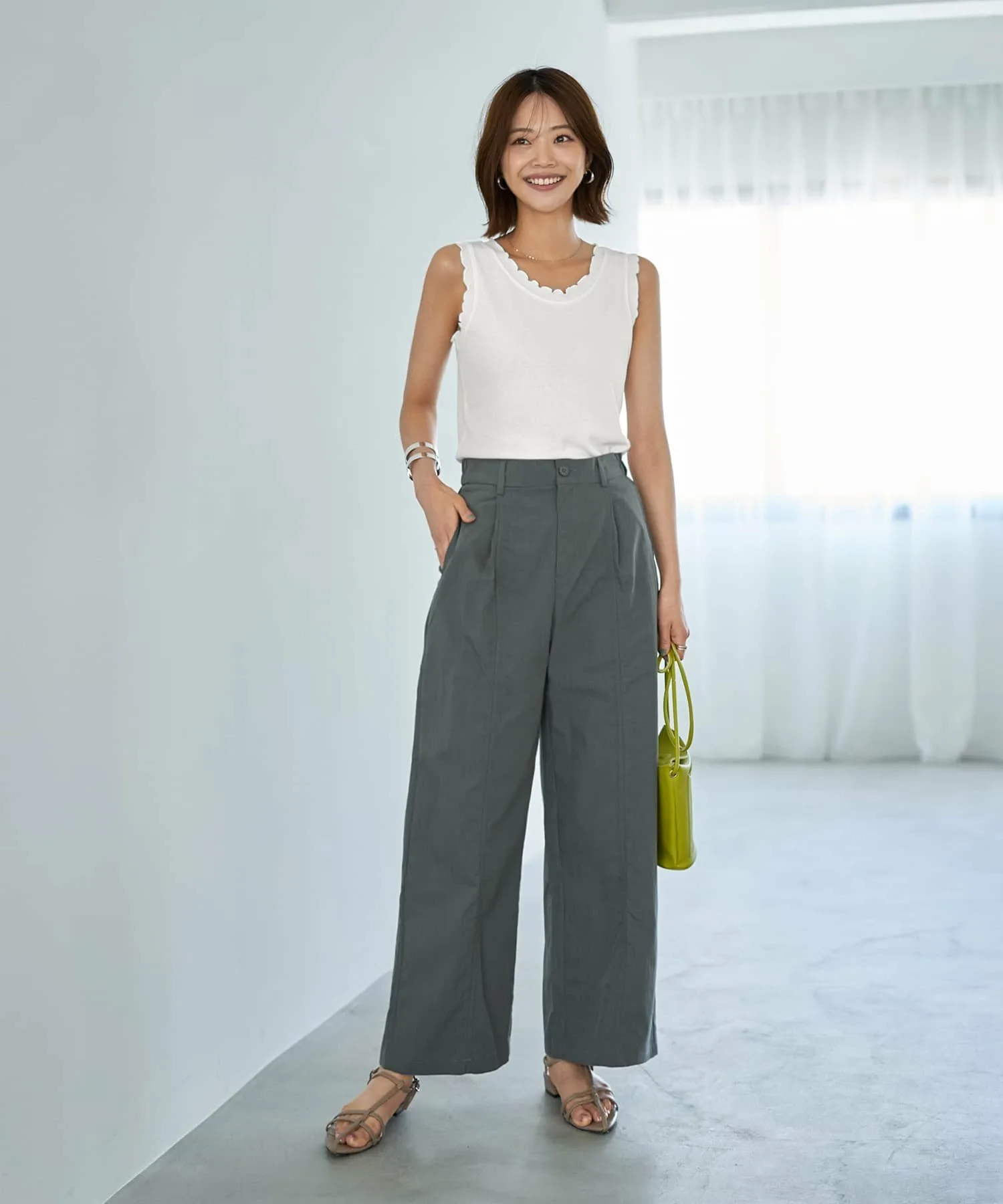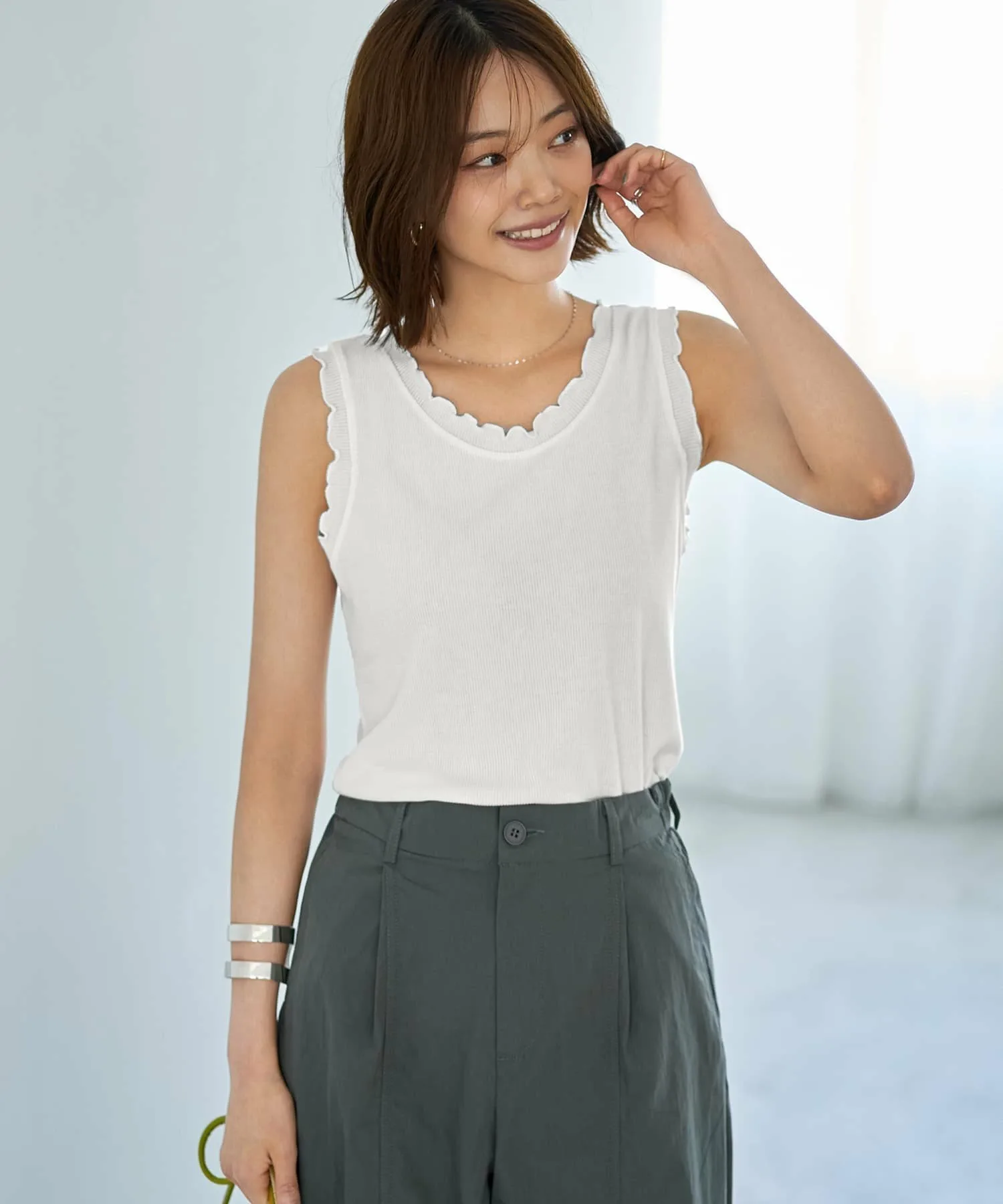 В чем секрет этих рюшечных топов, которые не выглядят слишком приторно? В непринужденно милом топе-майке. Этот топ украшен рюшами по краю выреза горловины, подмышек и подола. Хотя на самом деле это не рюши, оборки создают эффект «рюшей», придавая образу солидность и сдержанность. Размер M обеспечивает хорошую эластичность. Он удобно сидит по фигуре, не будучи слишком тесным. Женственный дизайн с открытым декольте создает элегантный и привлекательный силуэт. Несмотря на то, что топ немного тонковат, он обладает оптимальной плотностью и плотностью для комфортного самостоятельного образа. Гладкая, приятная на ощупь ребристая трикотажная ткань комфортна для потной кожи. В сочетании с жакетом, кардиганом, комбинезоном или юбкой-свитером он создает уникальный образ, непохожий на обычный топ-майку.