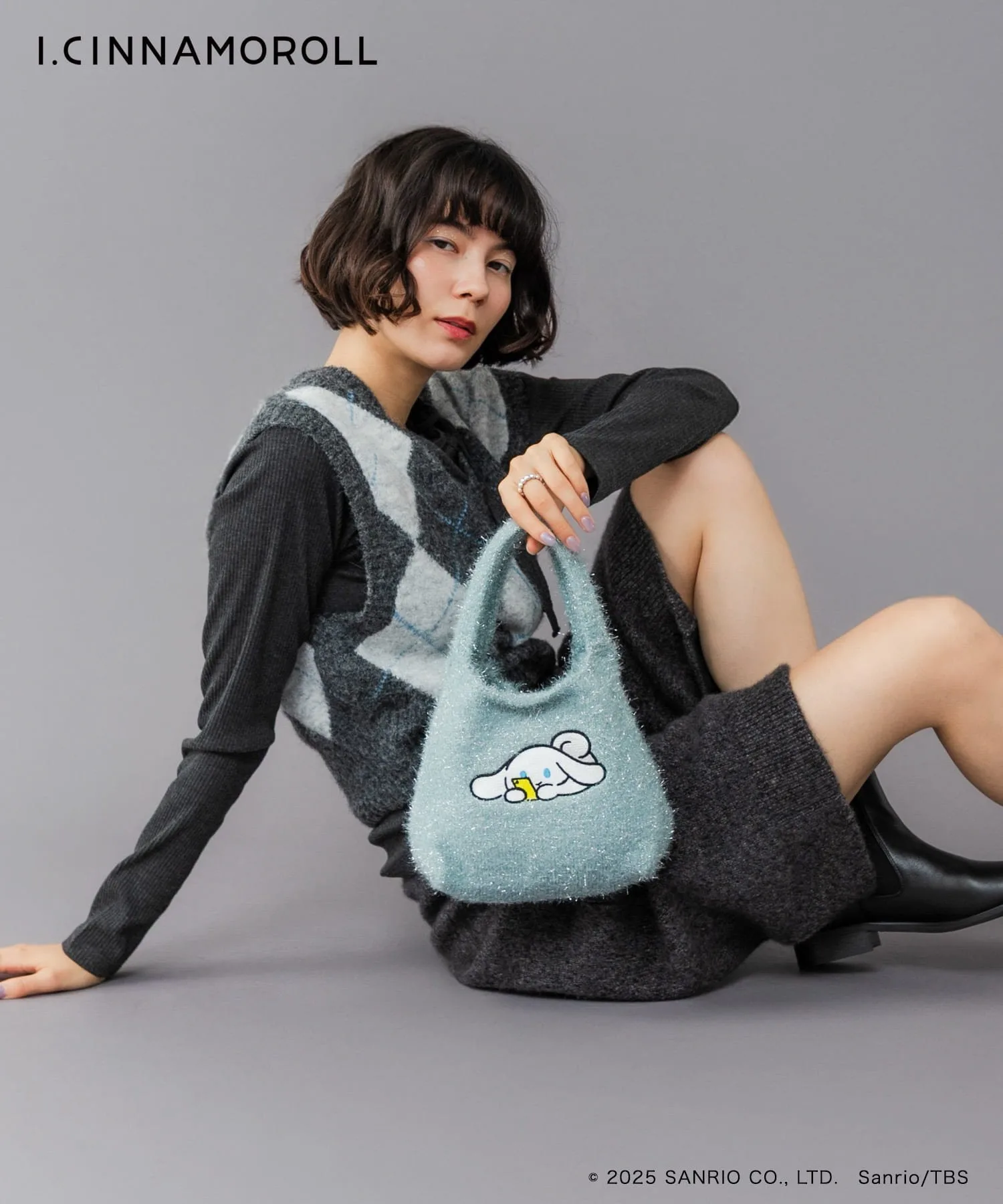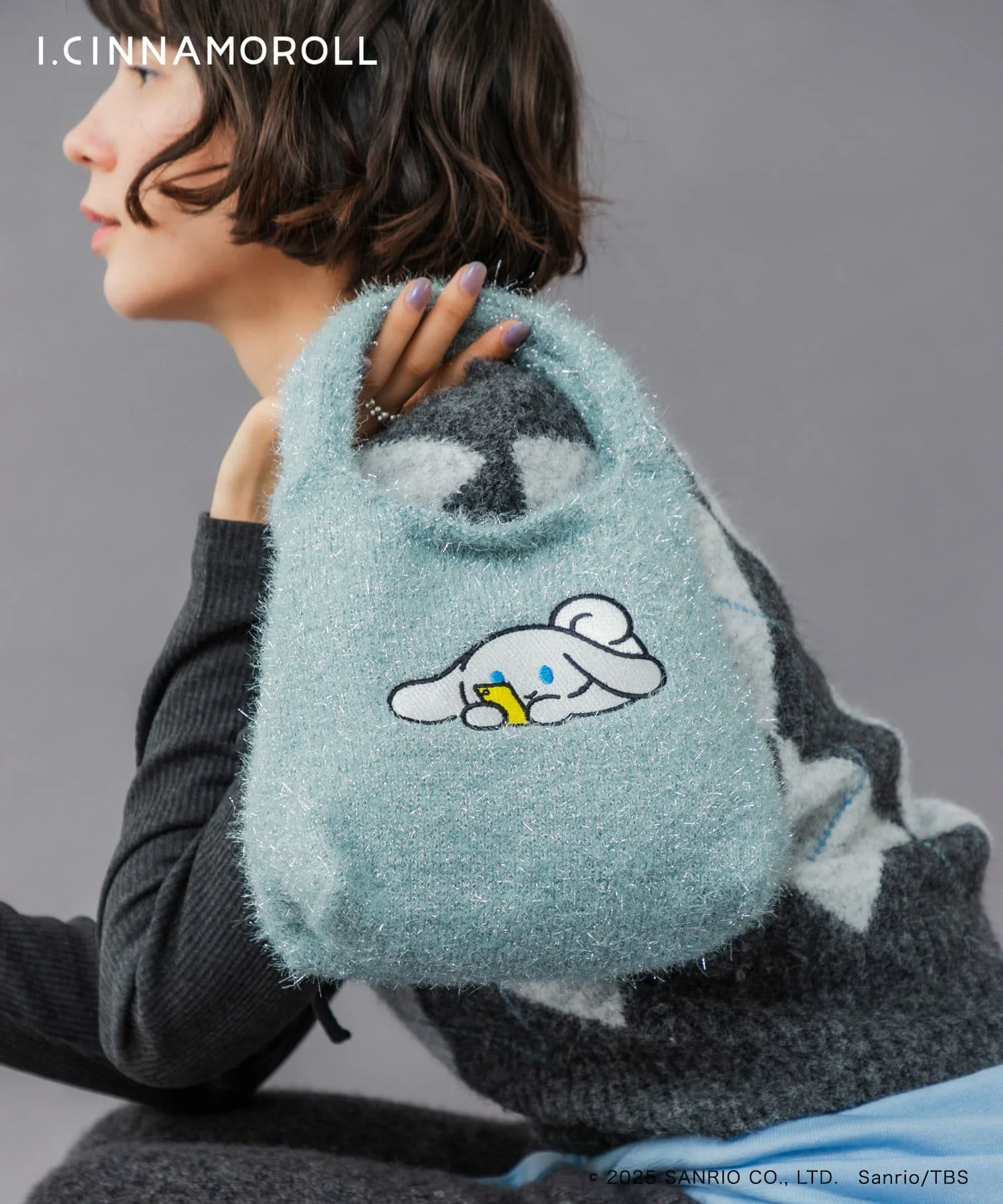 Дизайн включает вышивку Icinammoroll на нежном мерцающем блестящем материале.