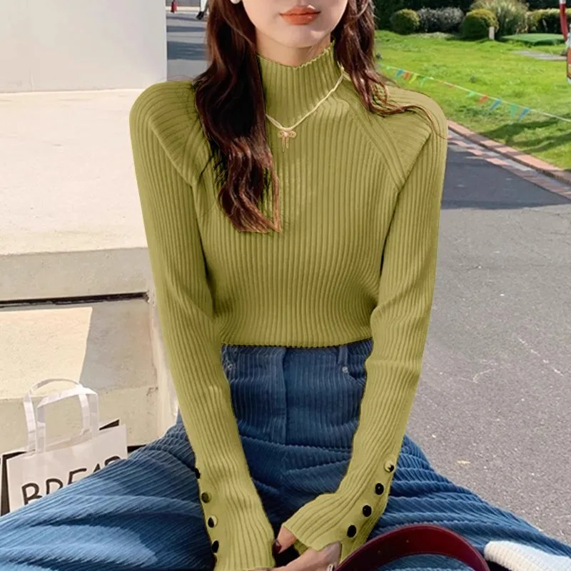 Вязаный свитер с высоким воротником и пуговицами на рукавах, создающий ощущение непринужденности, но в то же время идеально подходящий для таких случаев.