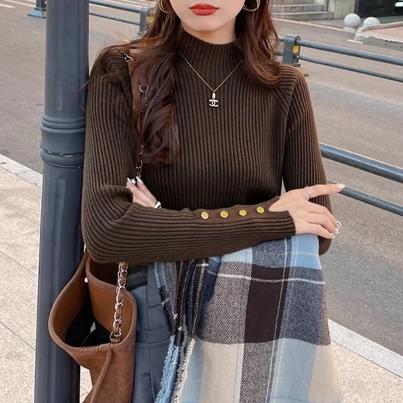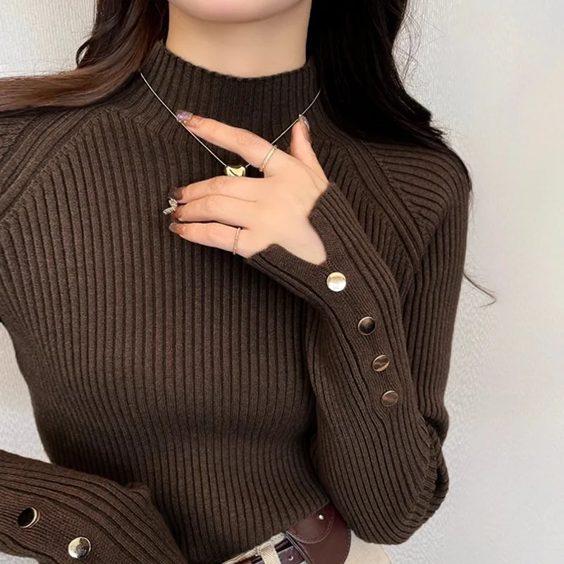Вязаный свитер с высоким воротником и пуговицами на рукавах, создающий ощущение непринужденности, но в то же время идеально подходящий для таких случаев.