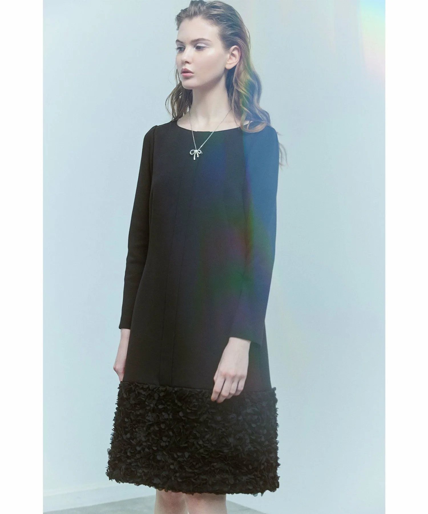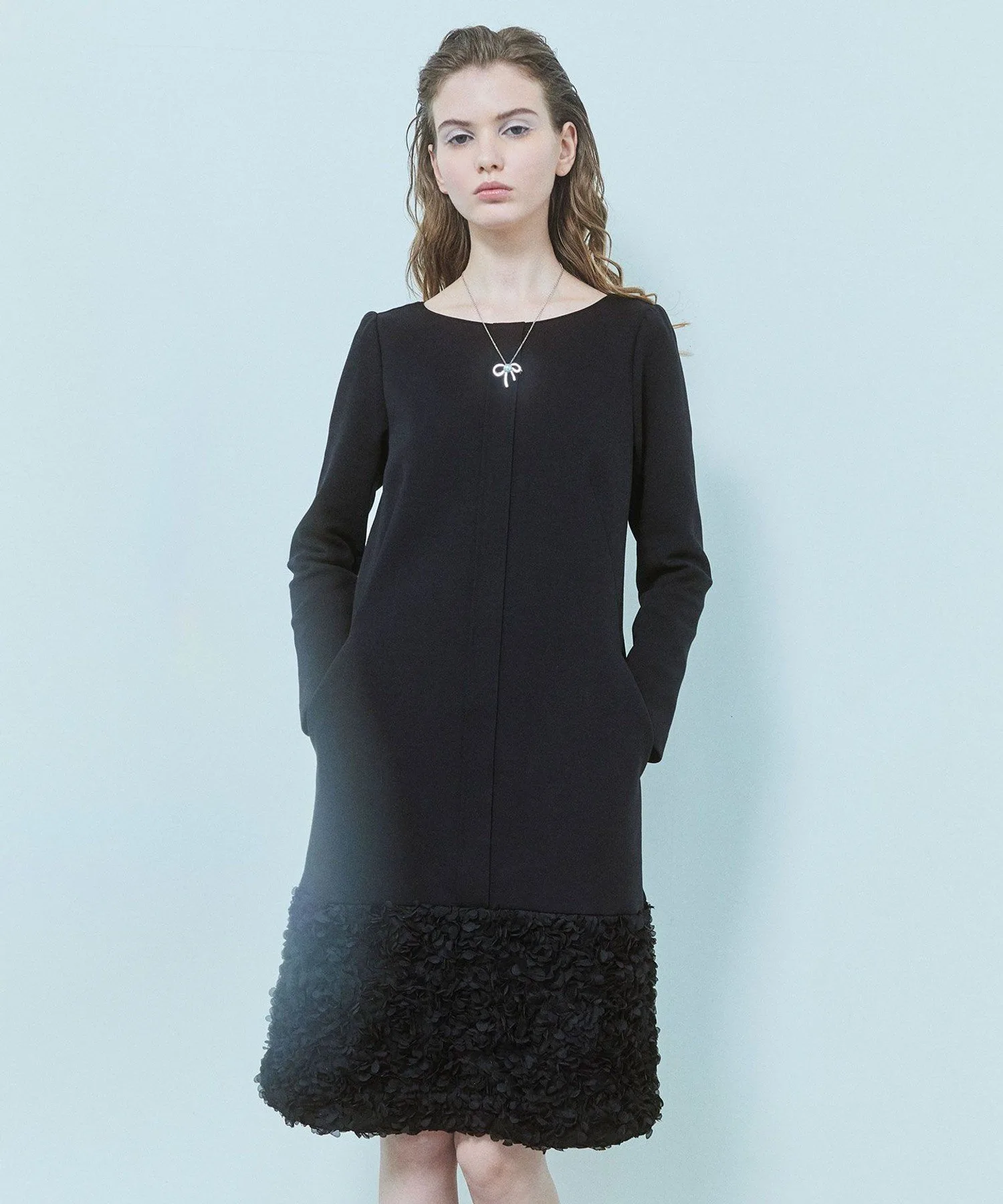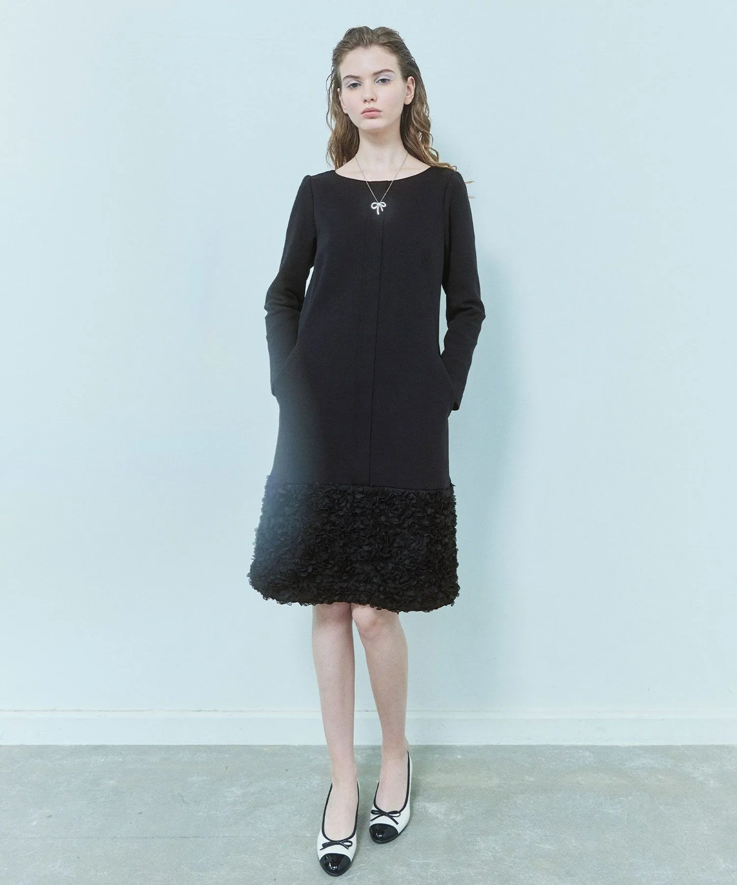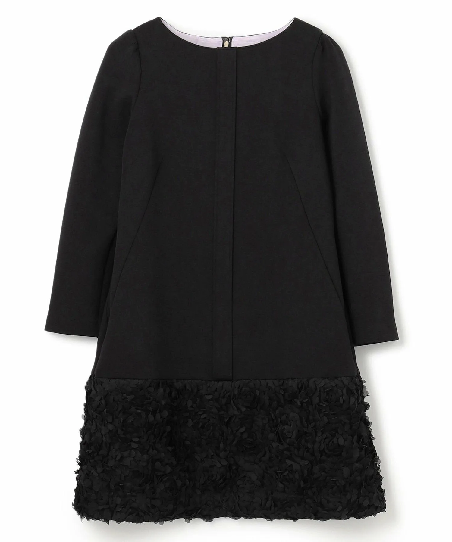 Подол юбки выполнен из ткани, напоминающей цветы, что придает ей нежный вид, как у цветочной феи.
