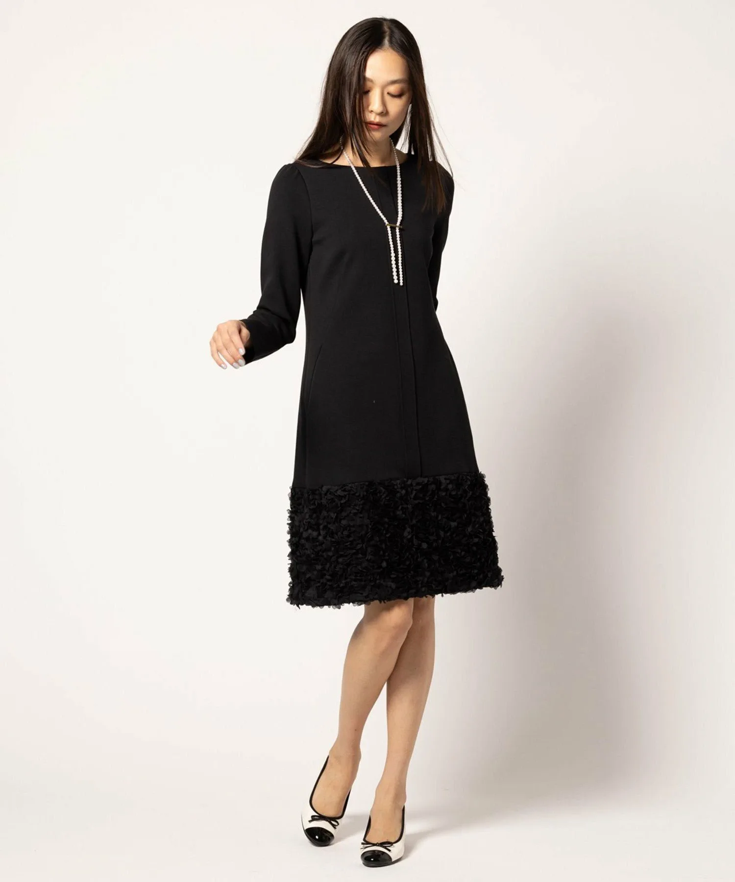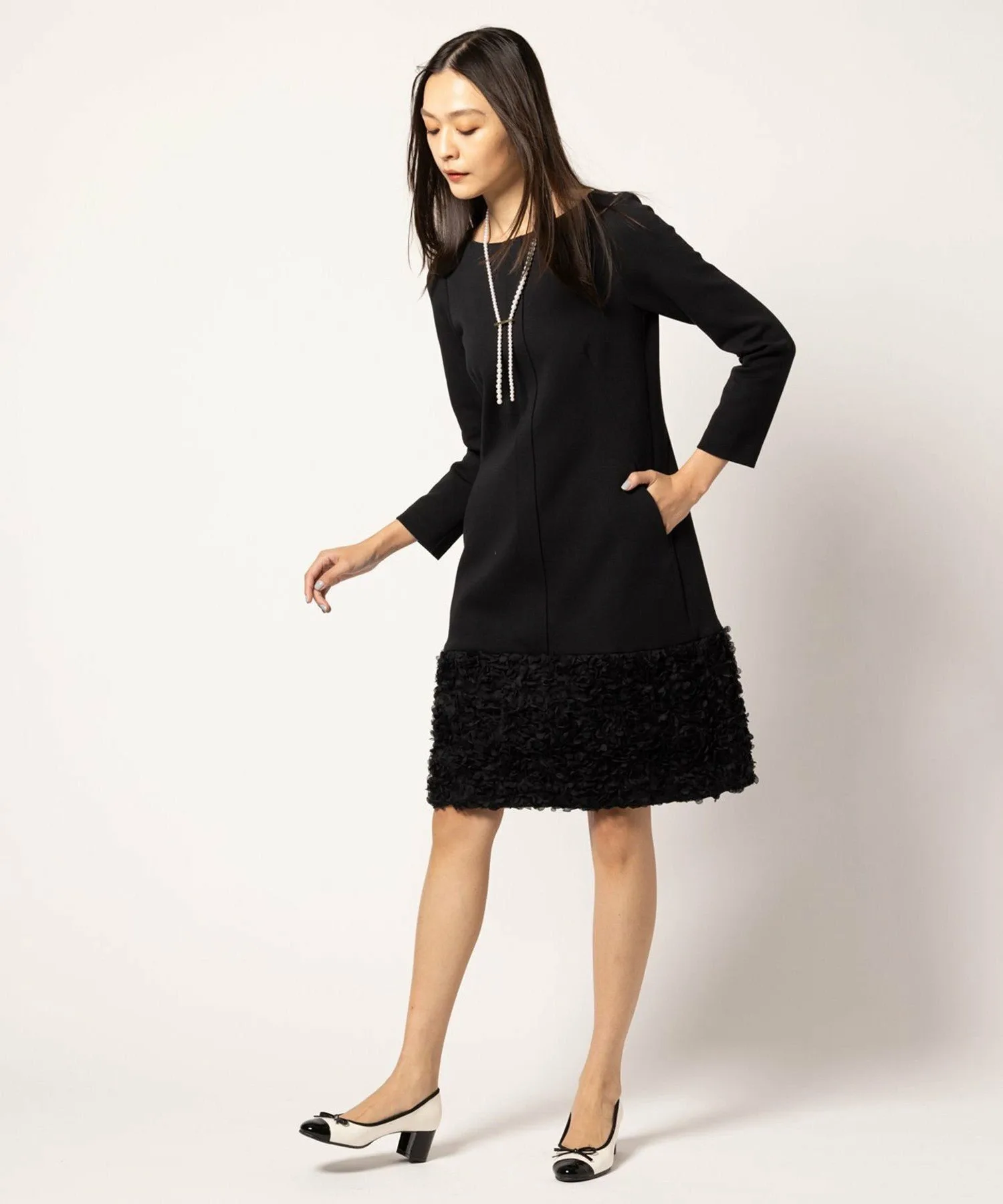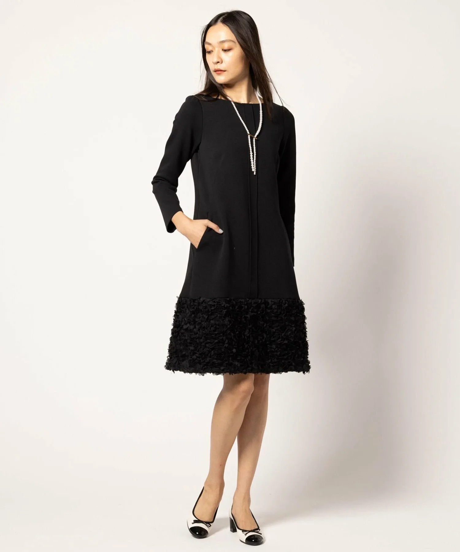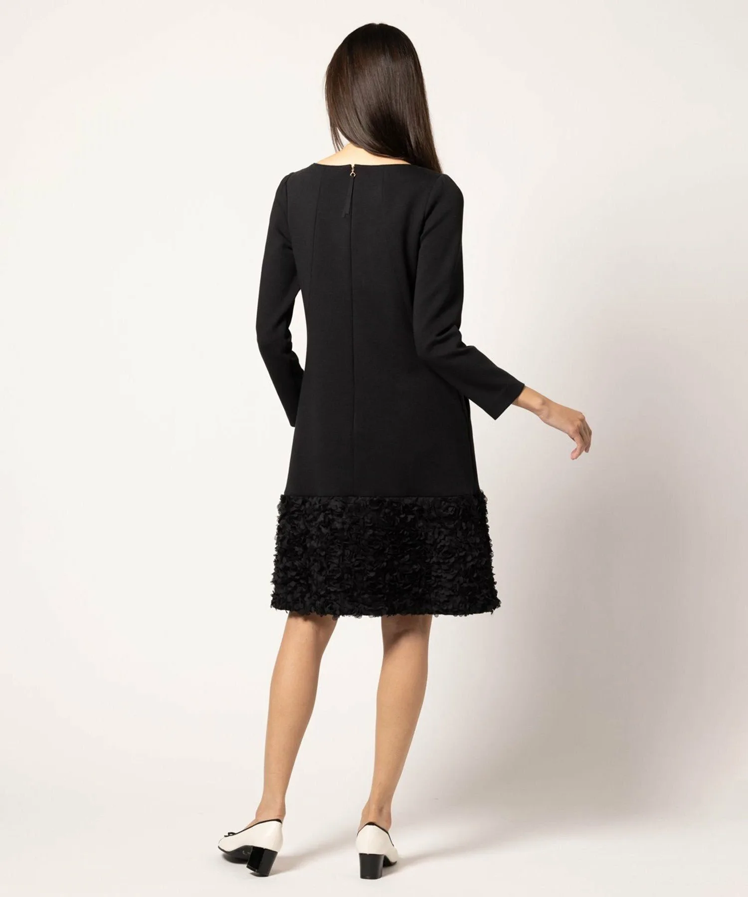Подол юбки выполнен из ткани, напоминающей цветы, что придает ей нежный вид, как у цветочной феи.