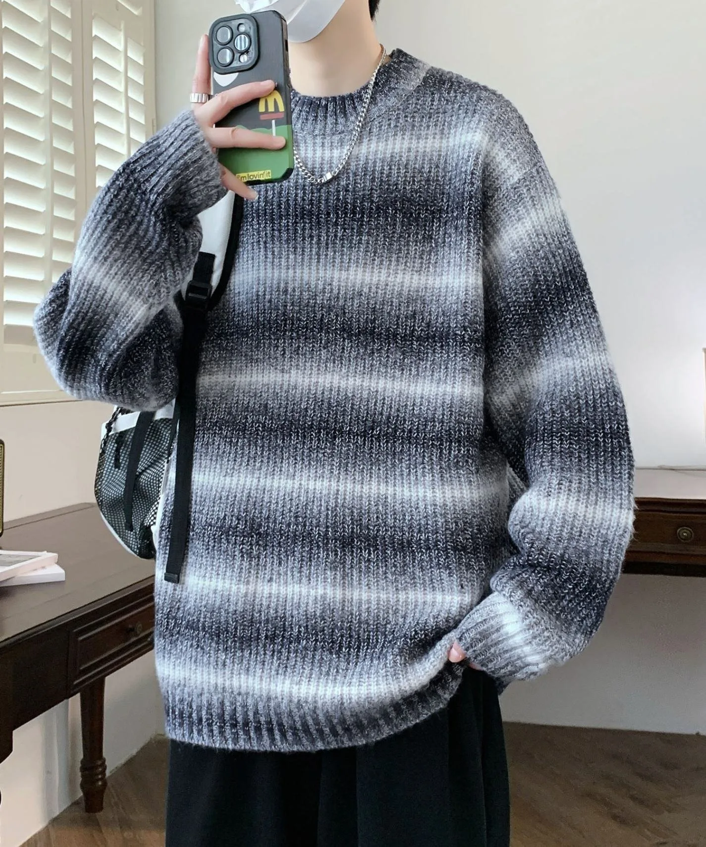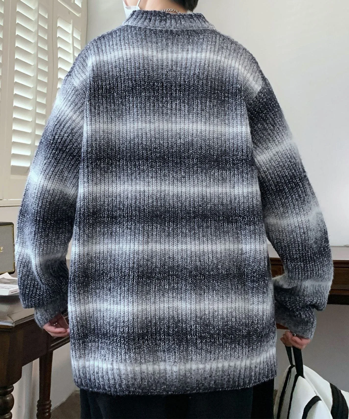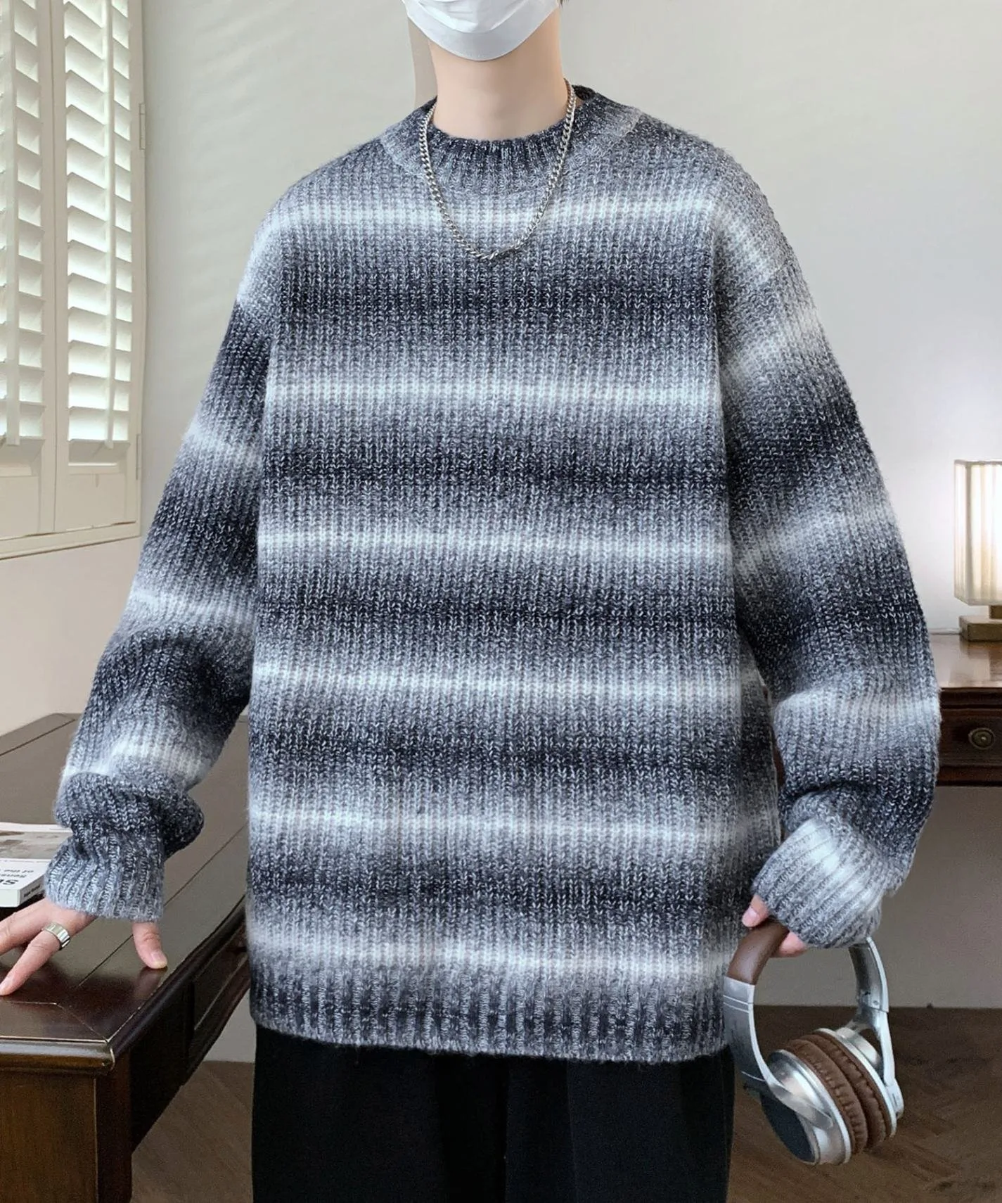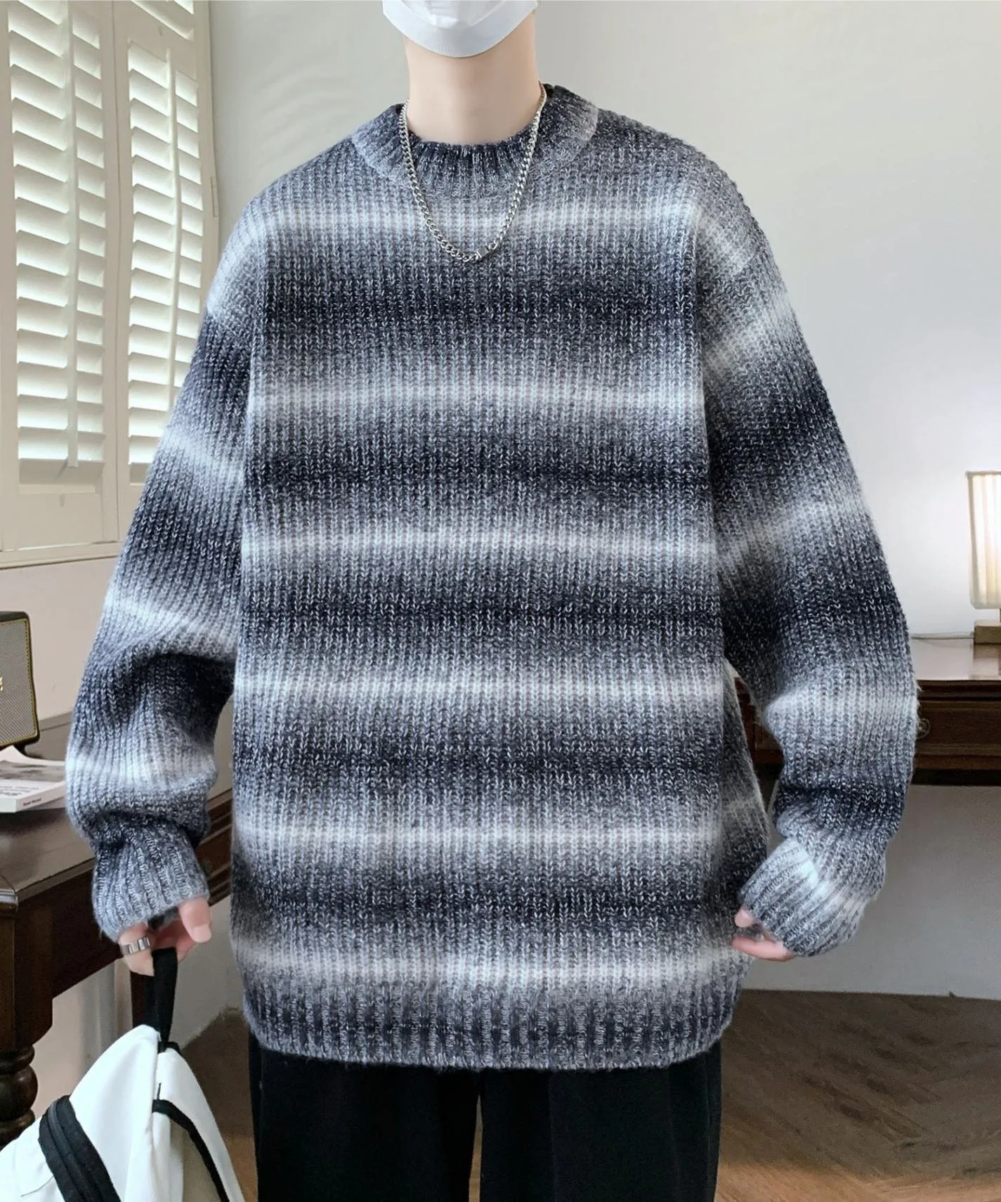 Модный полосатый вязаный пуловер с привлекательным бледно-розовым градиентом.