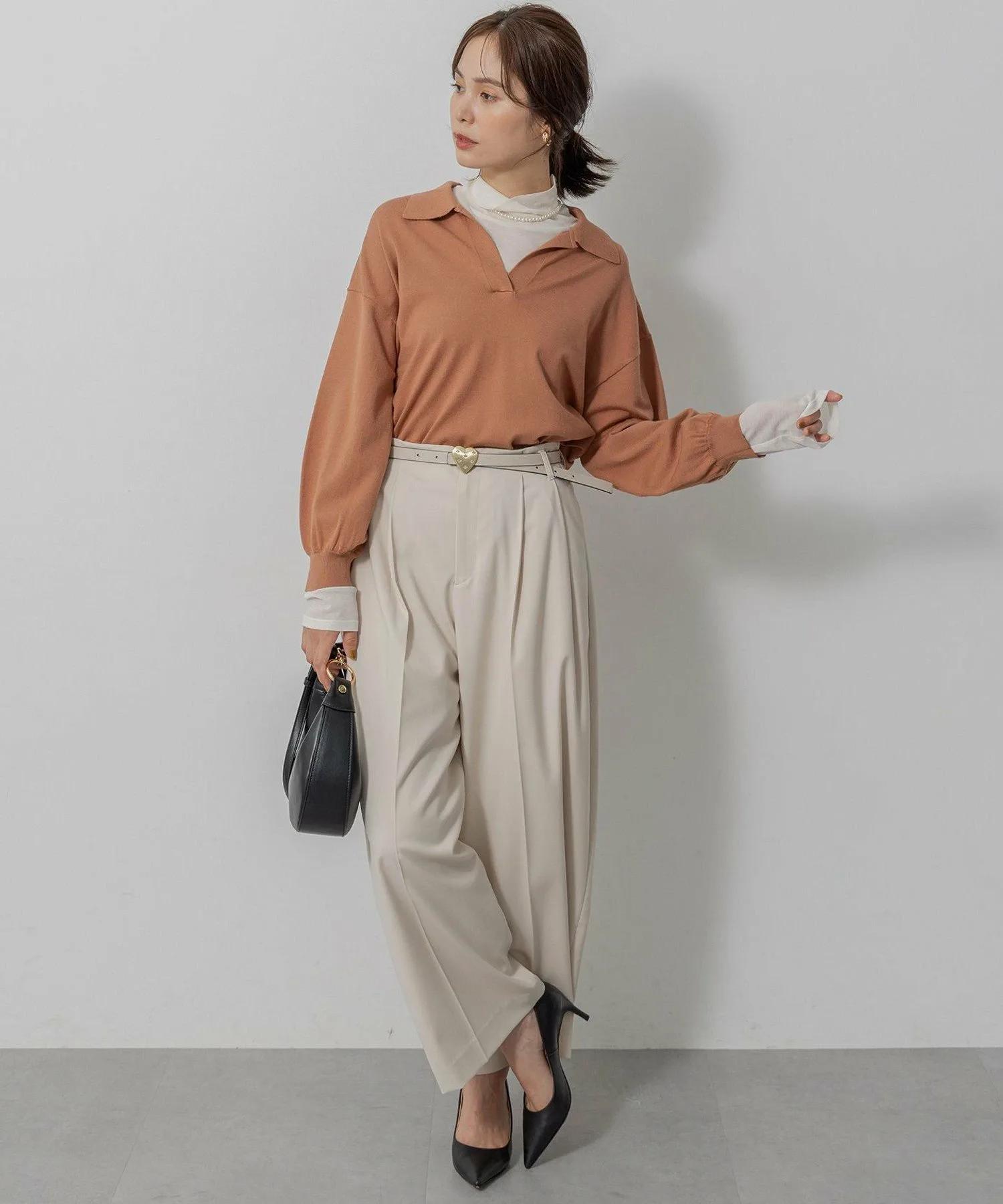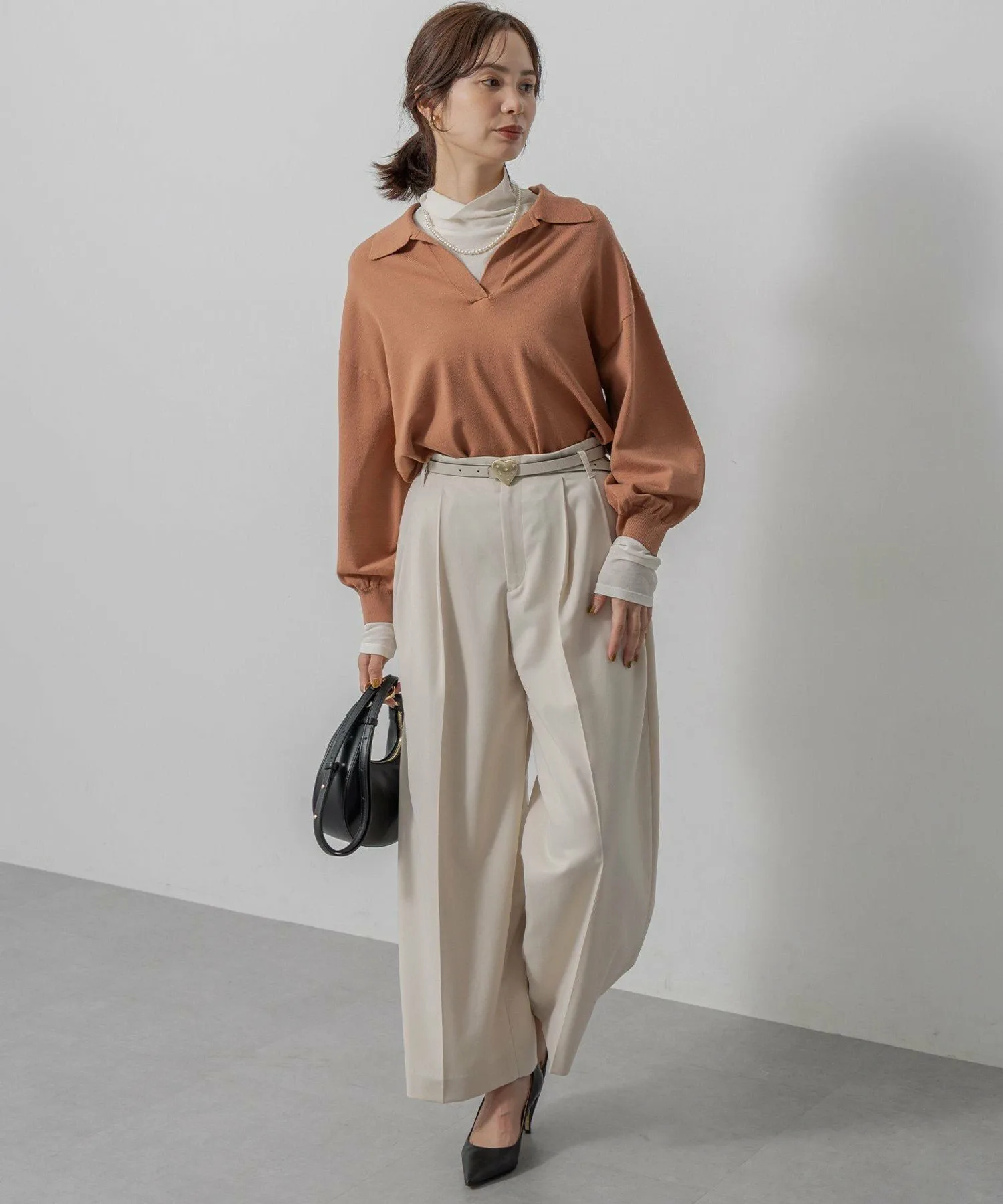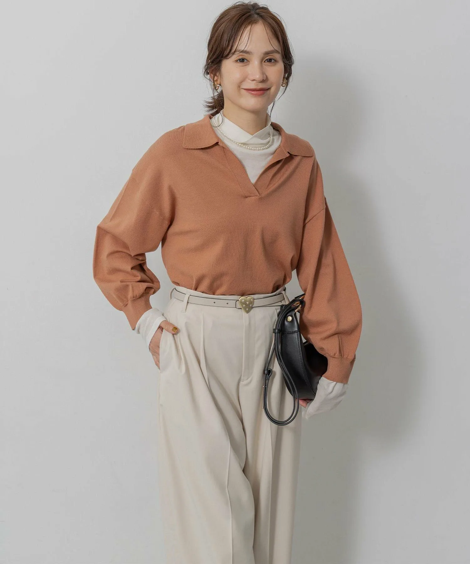 Дизайн・Мы уделили особое внимание открытому вырезу горловины, который подчеркивает женственность, идеальному размеру и объему при закатанных рукавах.・Он не подчеркивает линии тела, а подол хорошо сидит, поэтому выглядит аккуратно, заправленный в брюки или юбку.・Тонкая деталь подола позволяет создать сбалансированный образ, если заправить его.・Идеальная длина, чуть ниже бедер, позволяет легко сочетать его с любыми брюками или юбками.