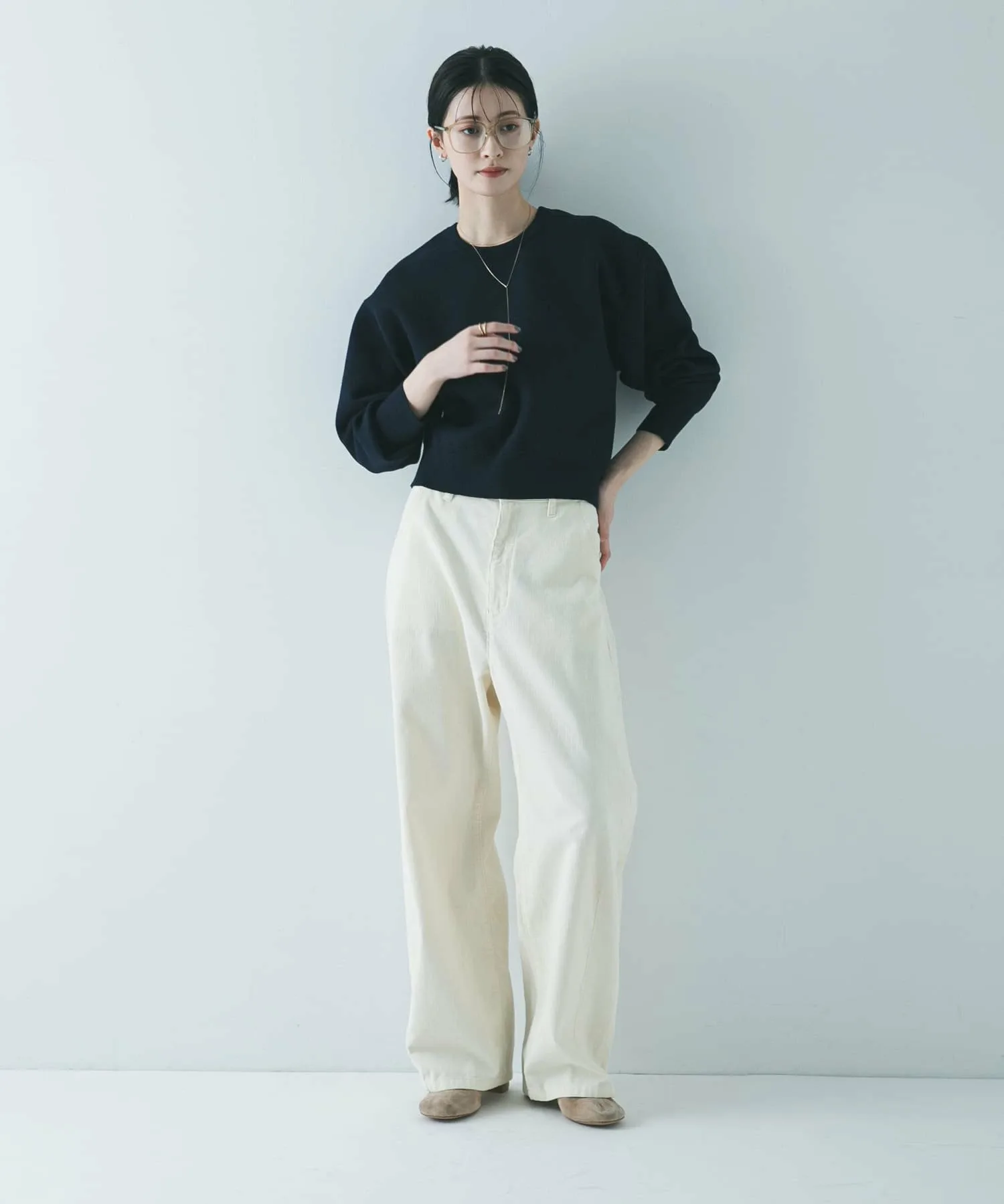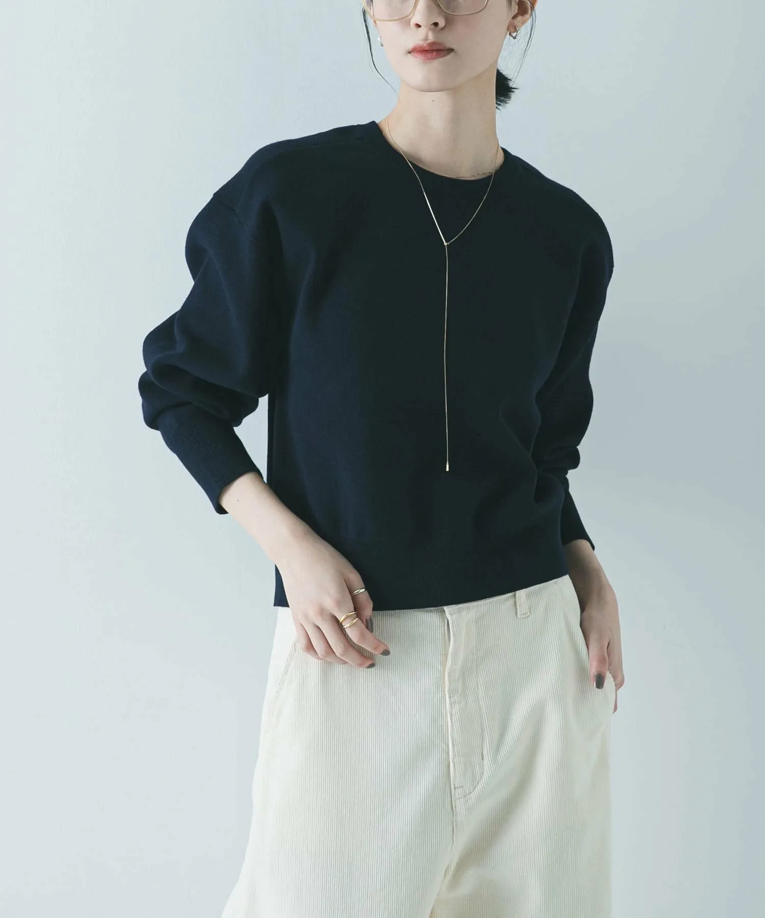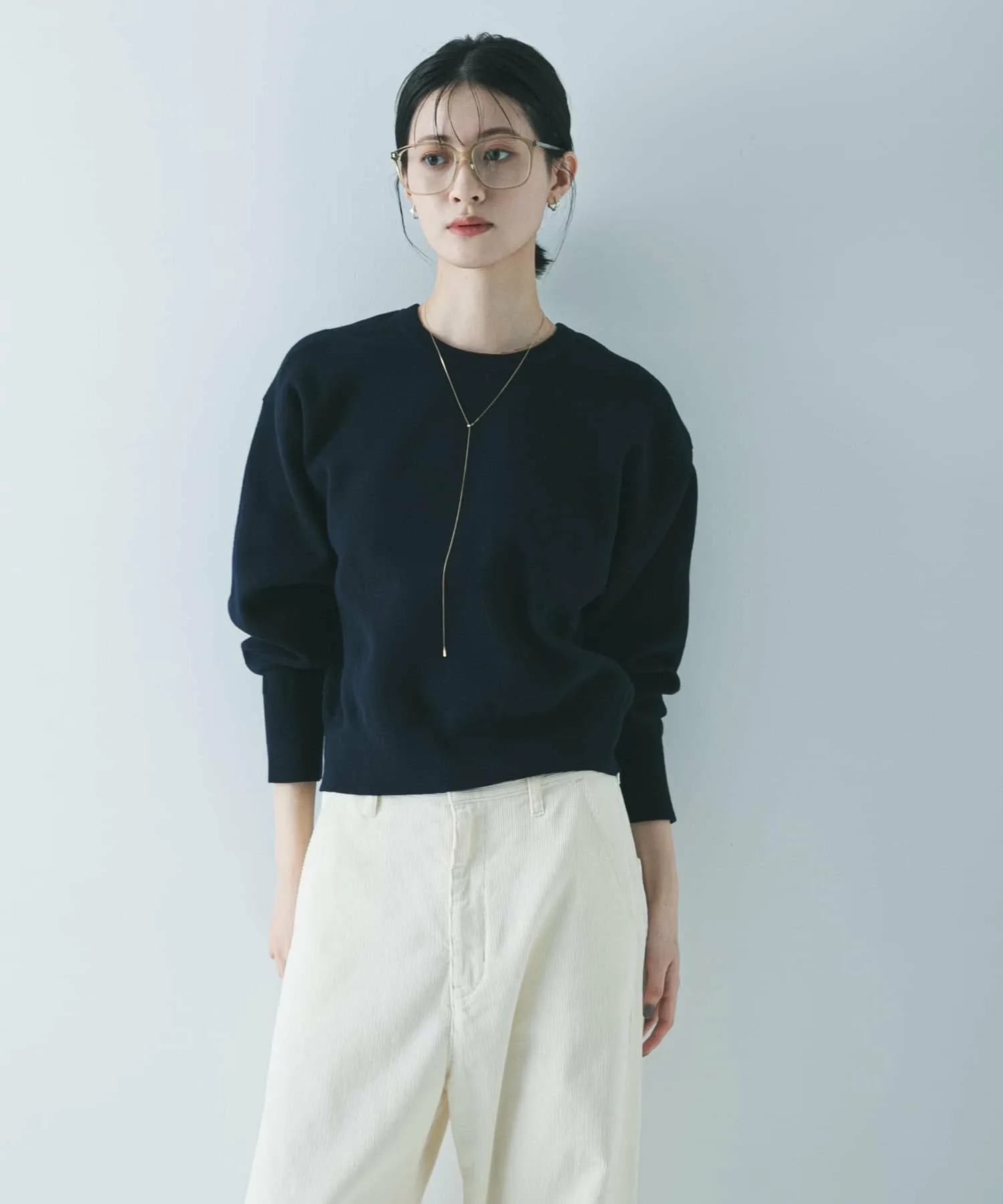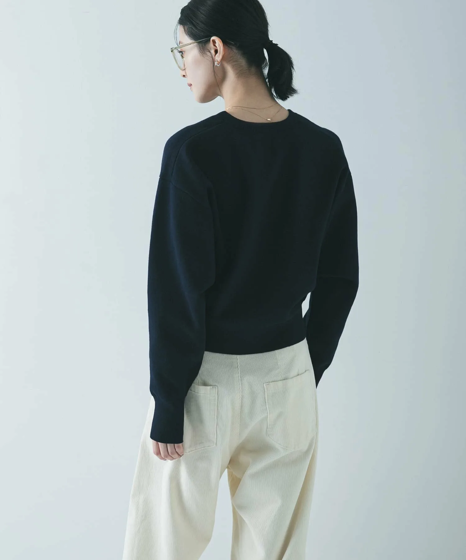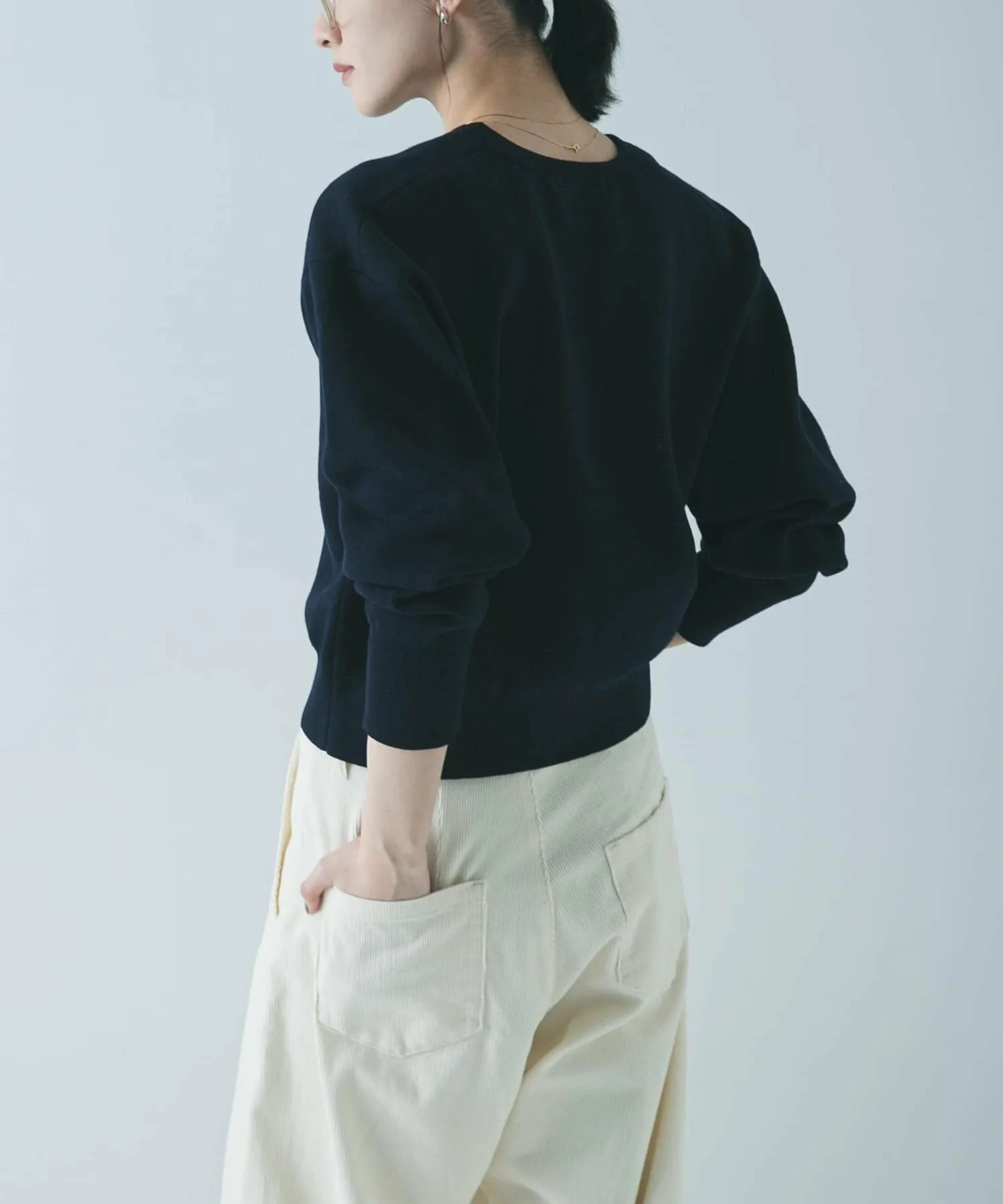 Мы рекомендуем сочетать его с широкими штанинами, такими как брюки со сборками или объемные юбки. Простой круглый вырез горловины подходит к широкому спектру стилей, от повседневного до элегантного.