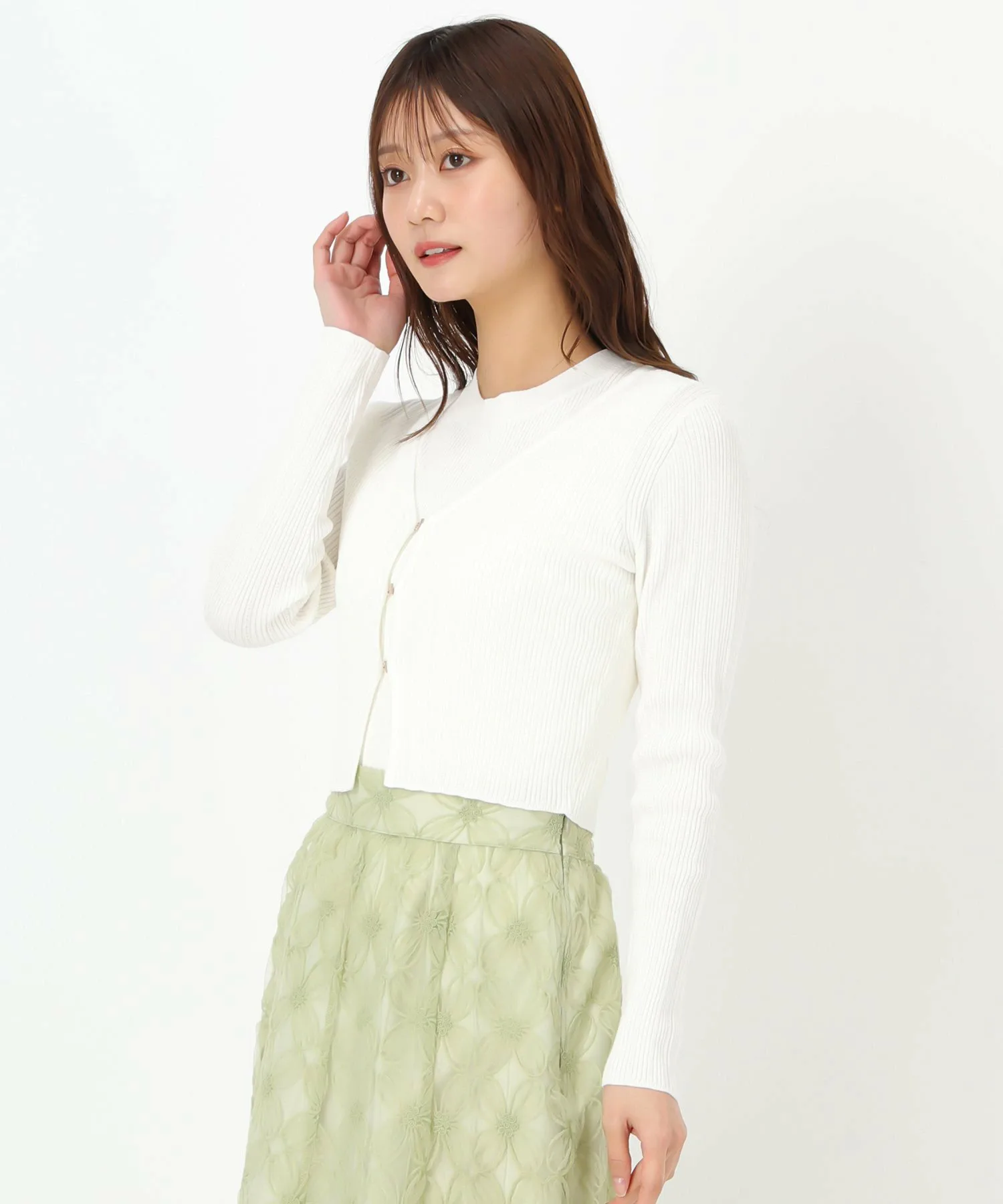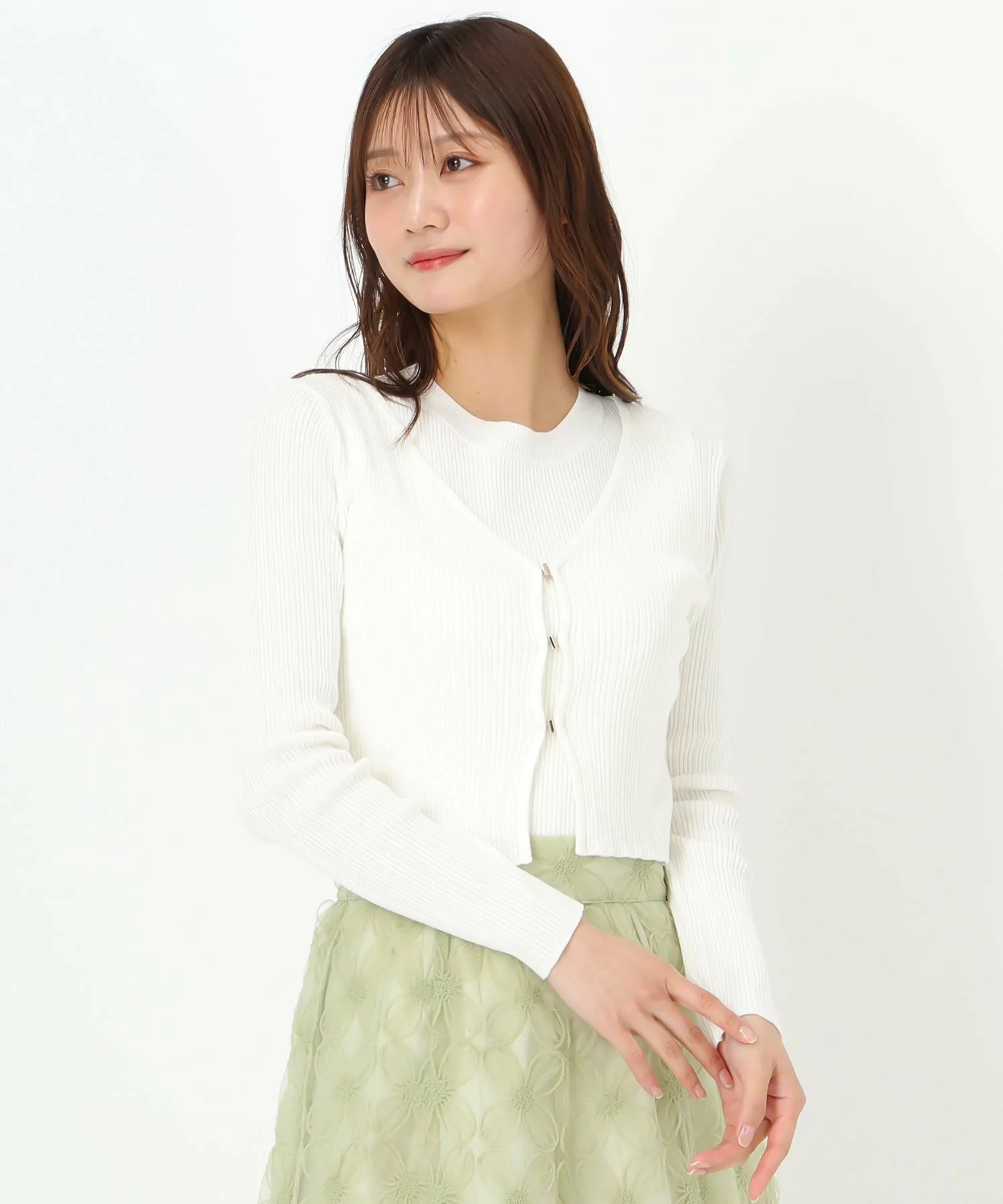 Комплект, состоящий из трикотажного изделия без рукавов и кардигана с золотыми крючками.