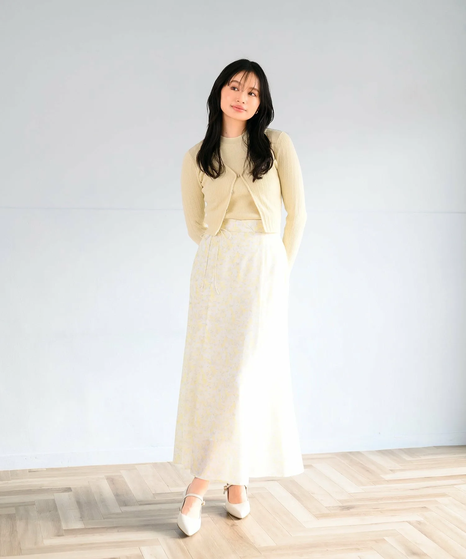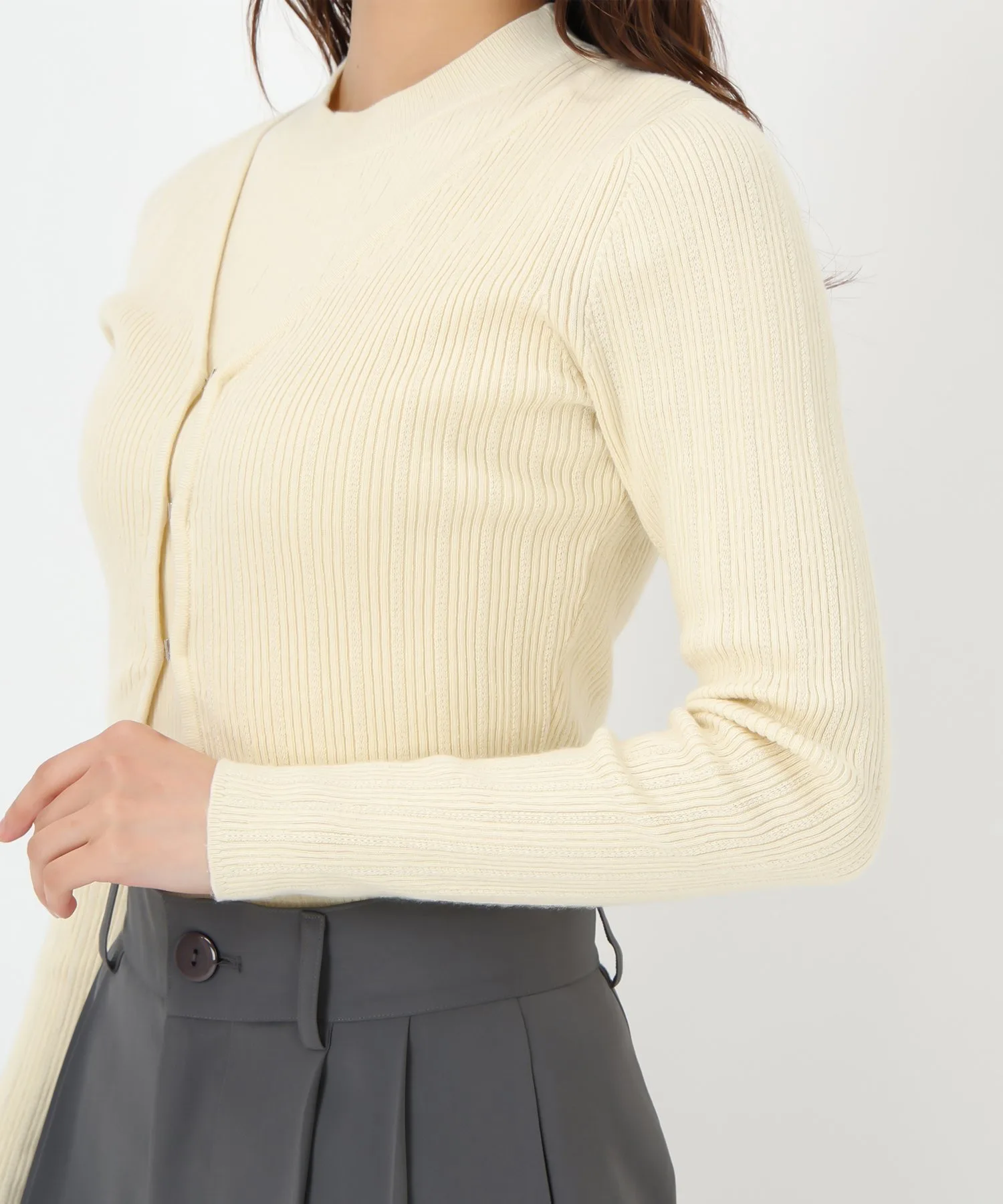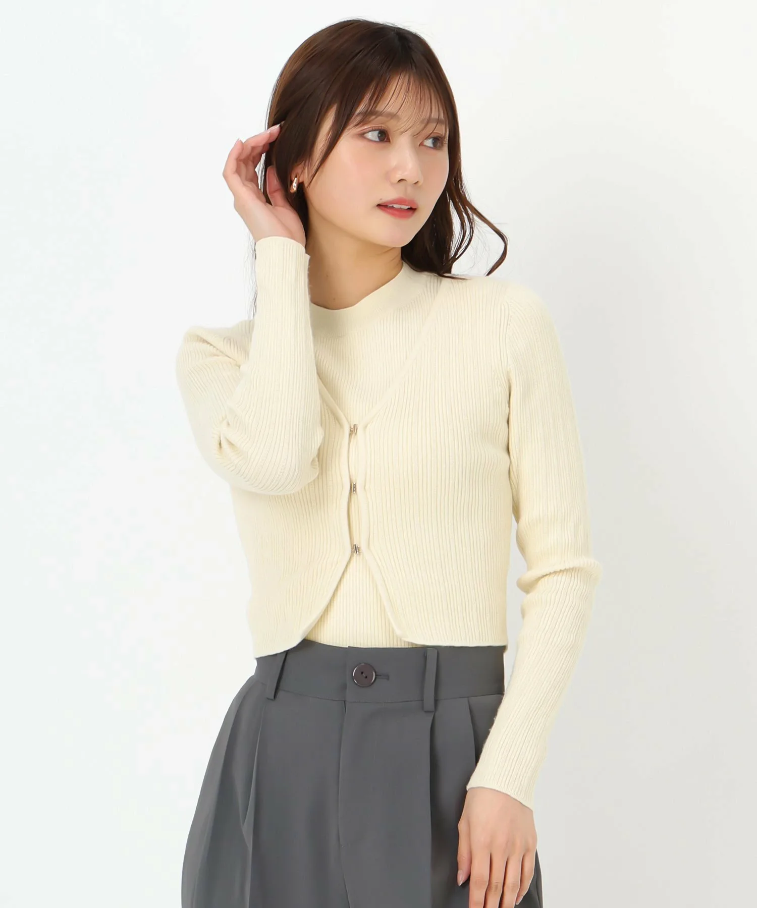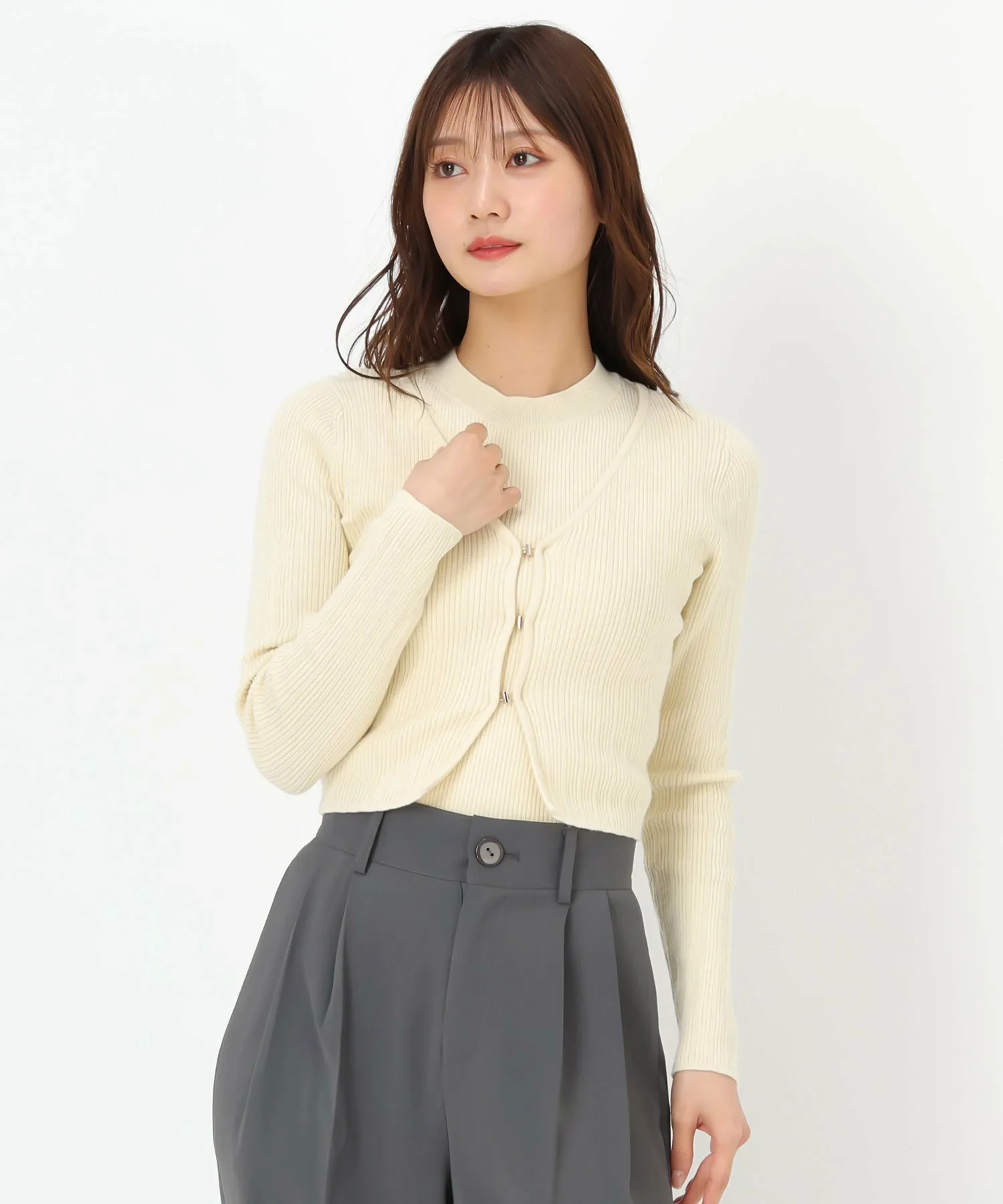 Комплект, состоящий из трикотажного изделия без рукавов и кардигана с золотыми крючками.