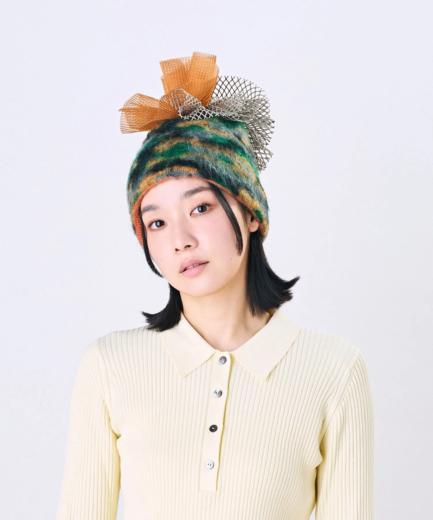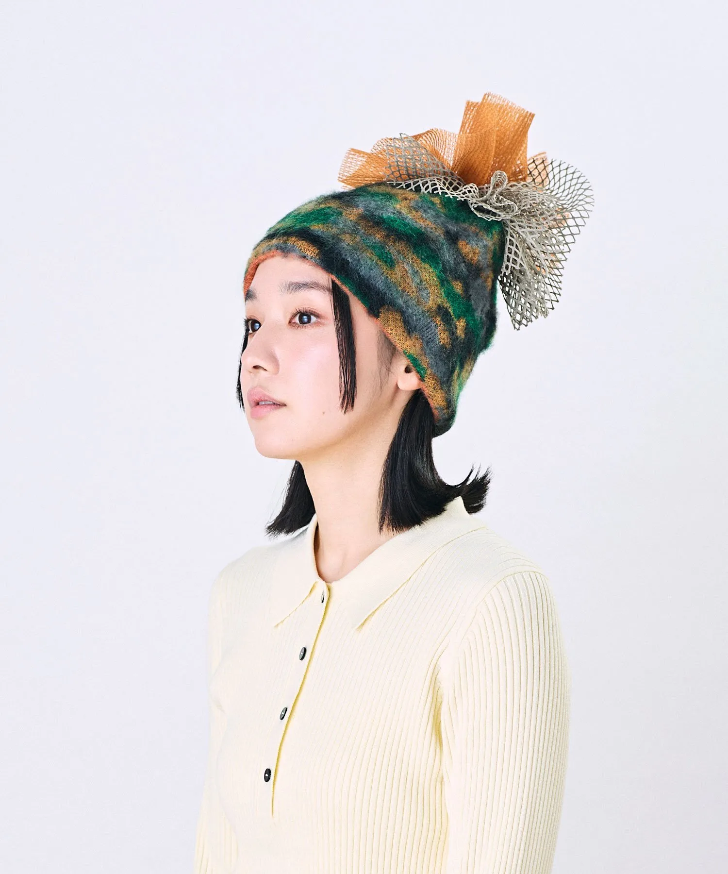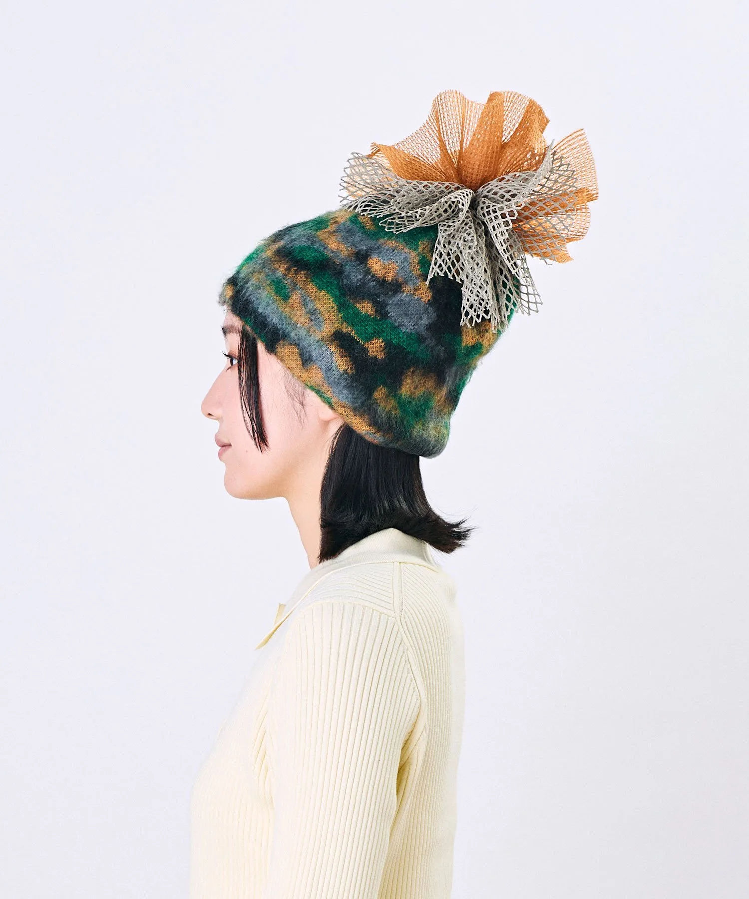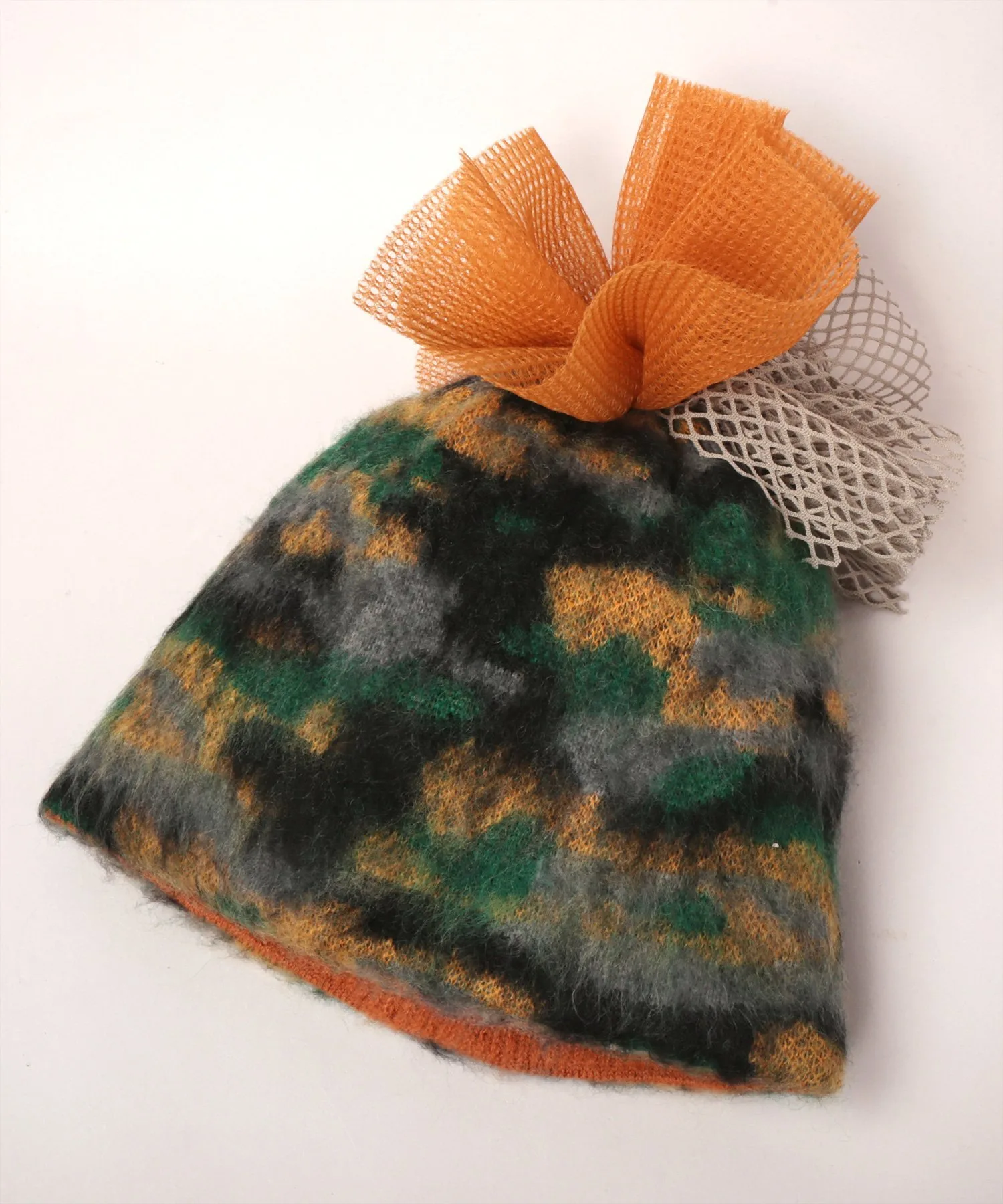 Изготовлен из теплой шерсти и мохера. Тюль и сетчатые помпоны создают великолепную атмосферу.