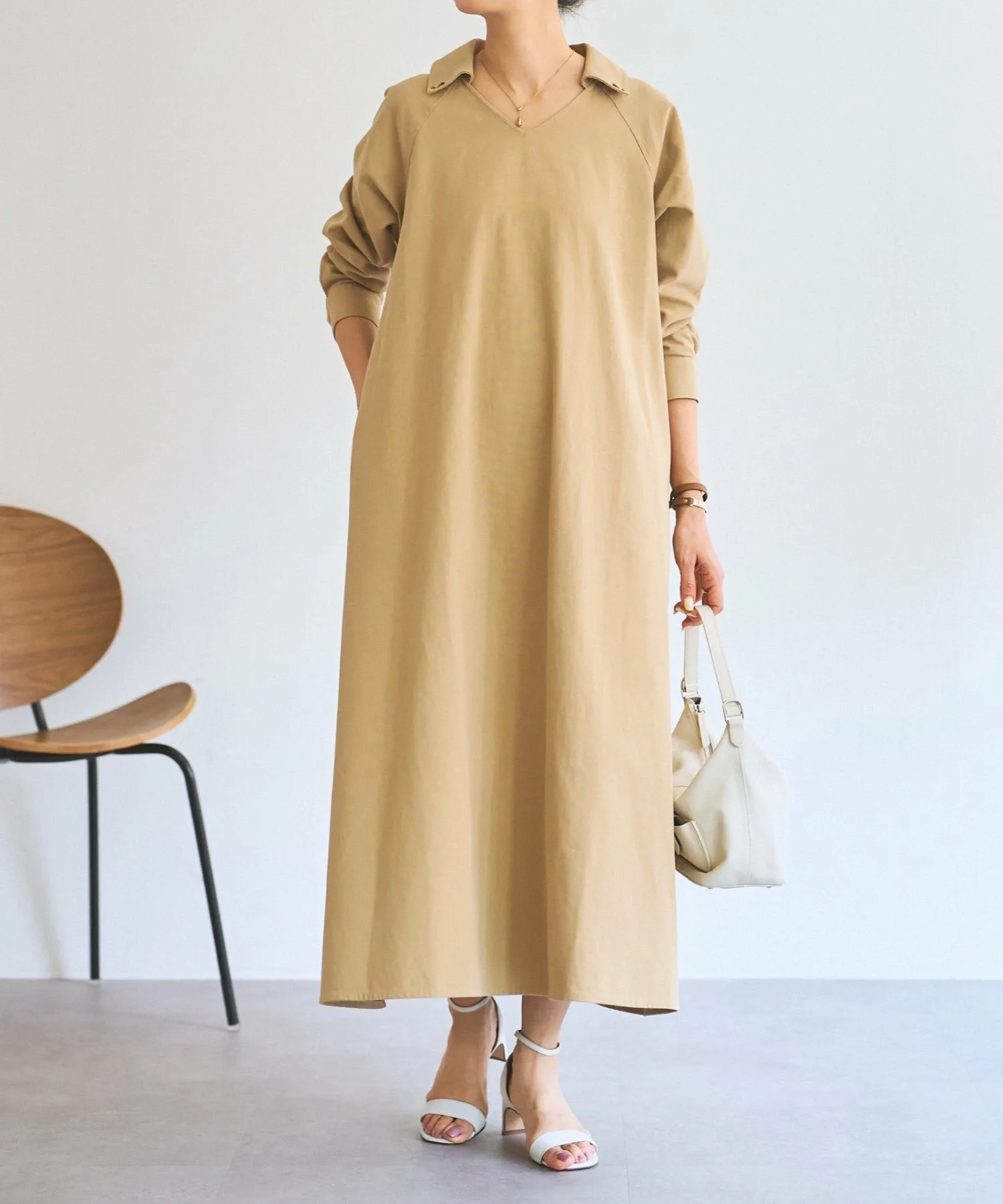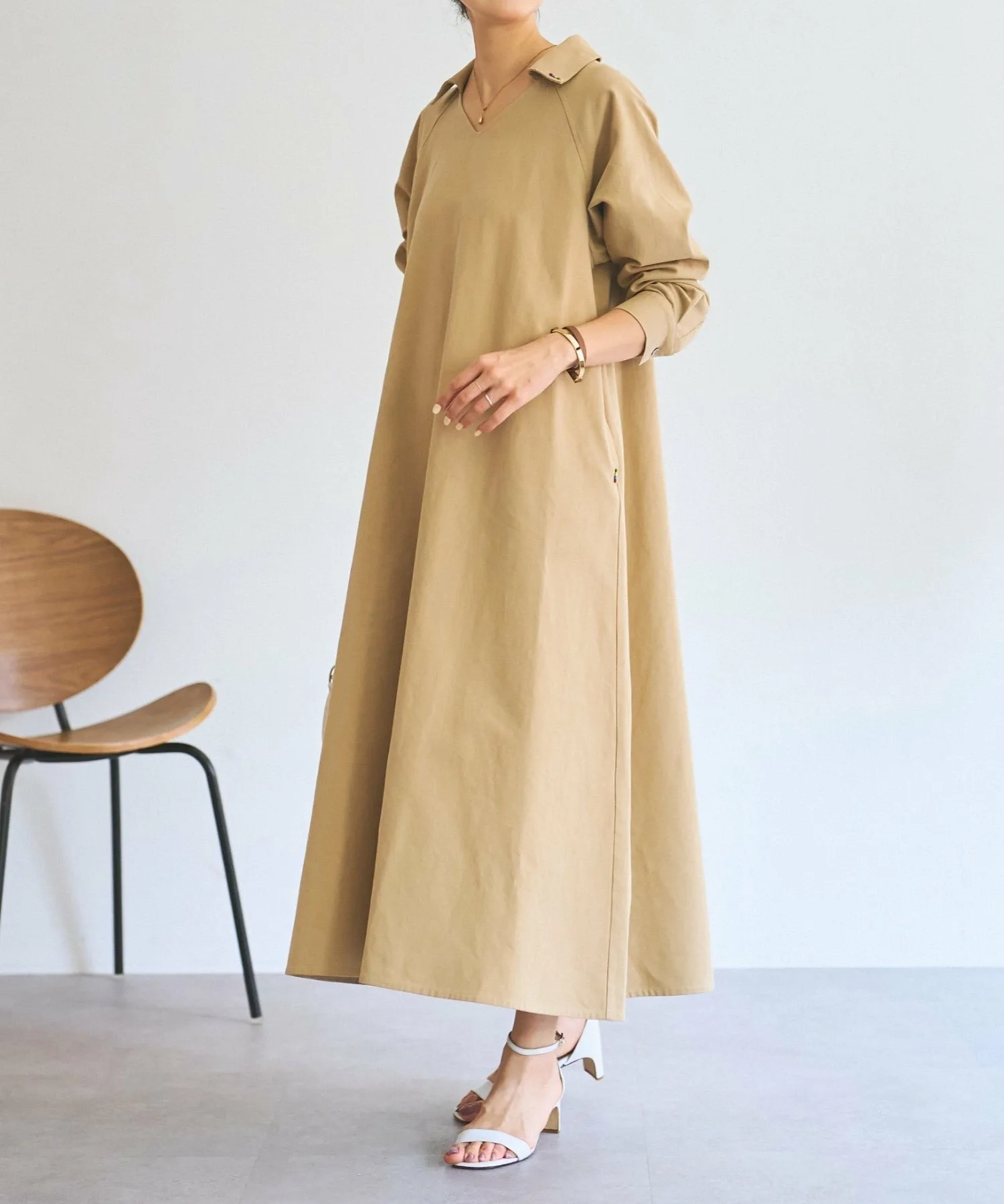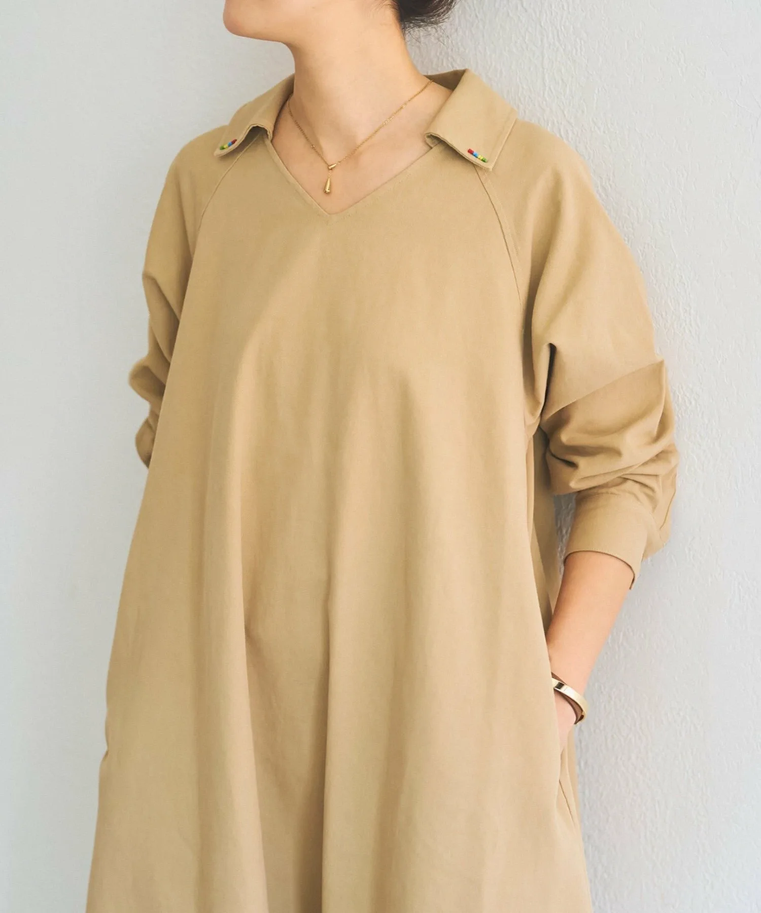 Длинное расклешенное платье, украшенное разноцветными бусинами, пришитыми к воротнику и карманам.