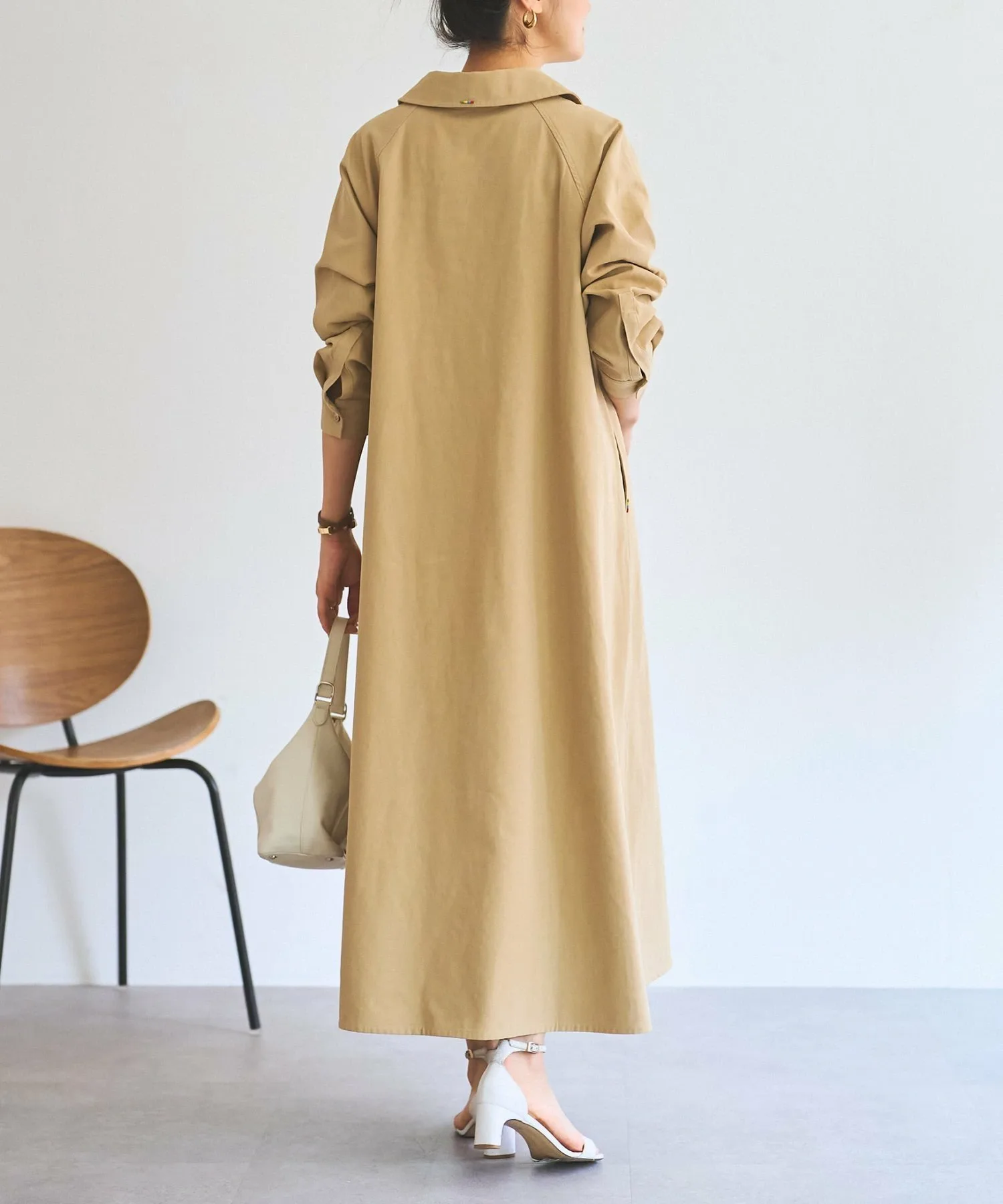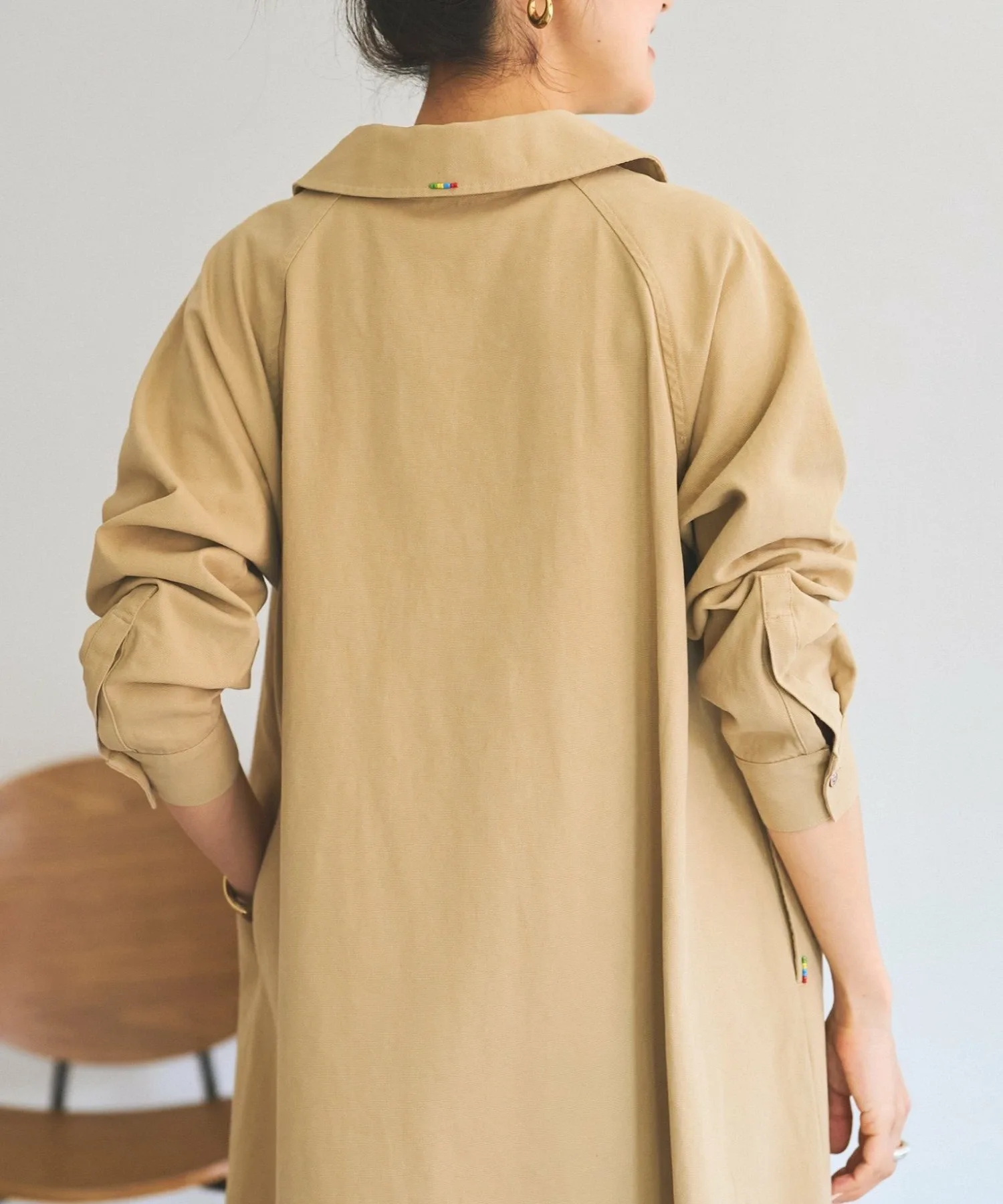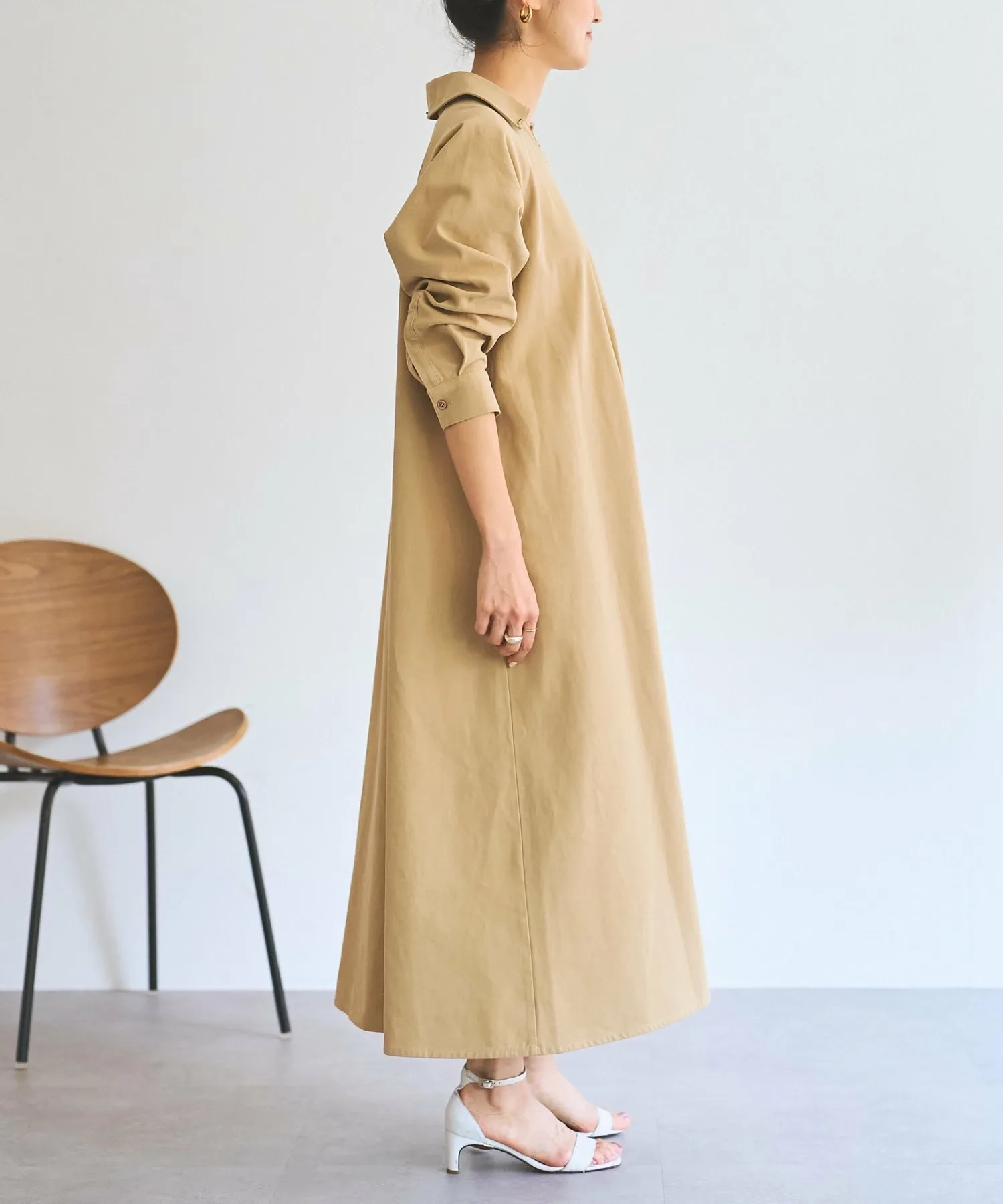 Длинное расклешенное платье, украшенное разноцветными бусинами, пришитыми к воротнику и карманам.
