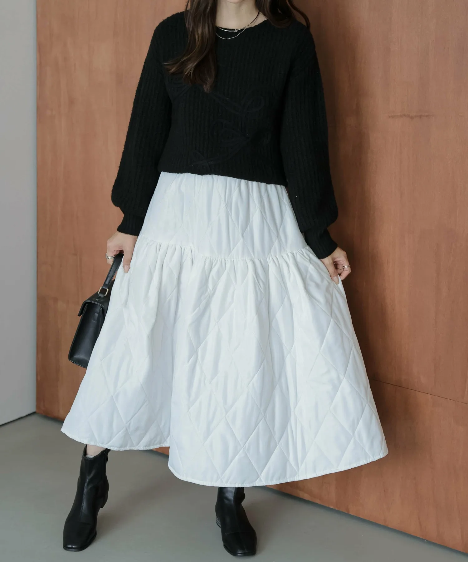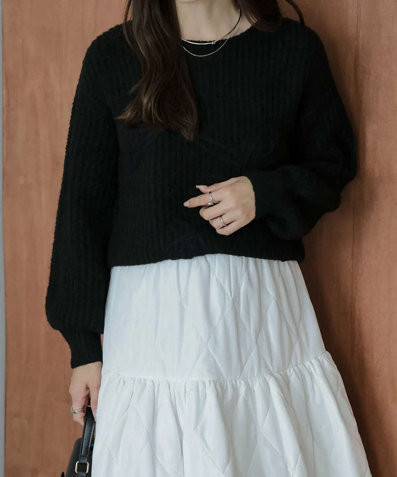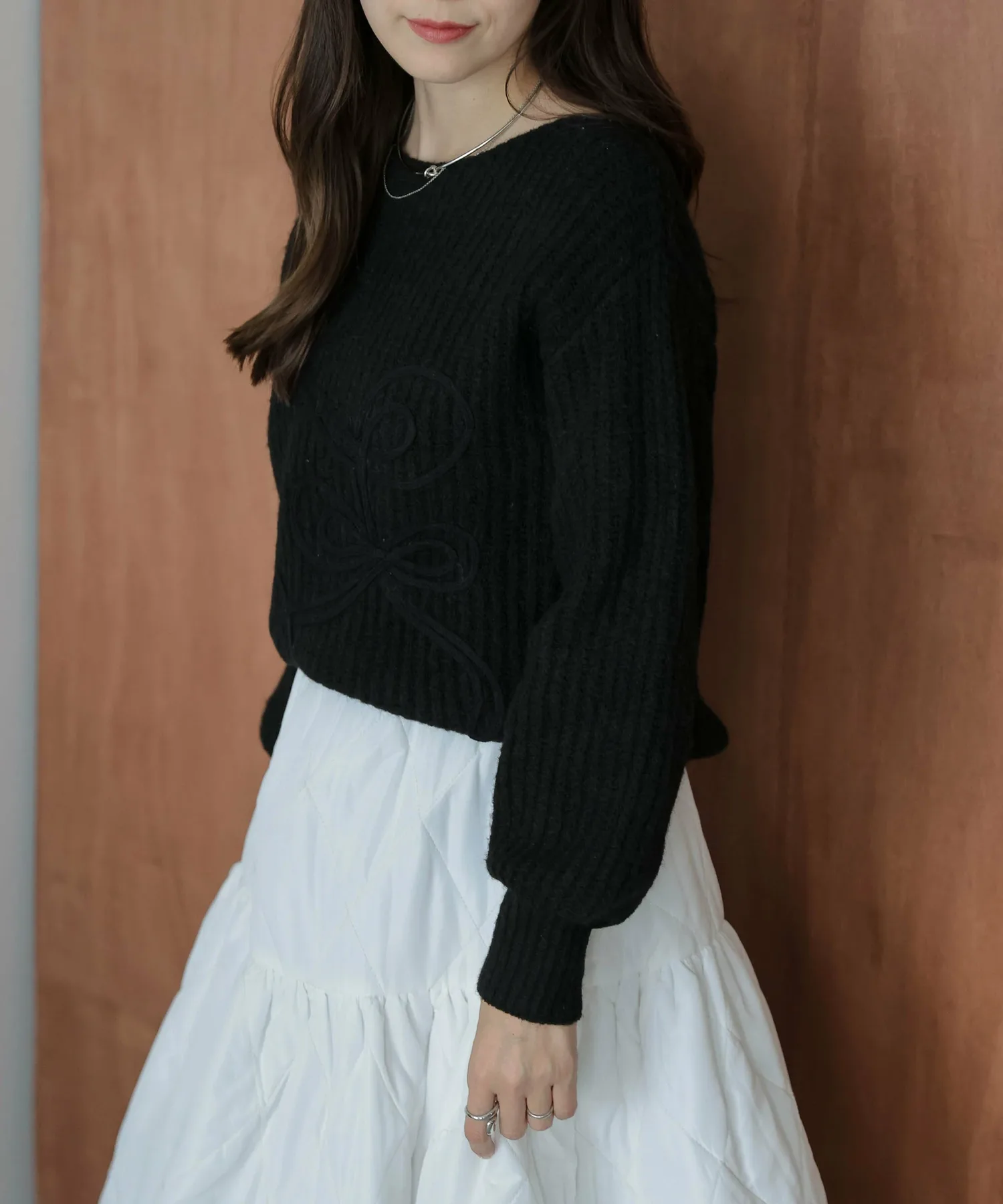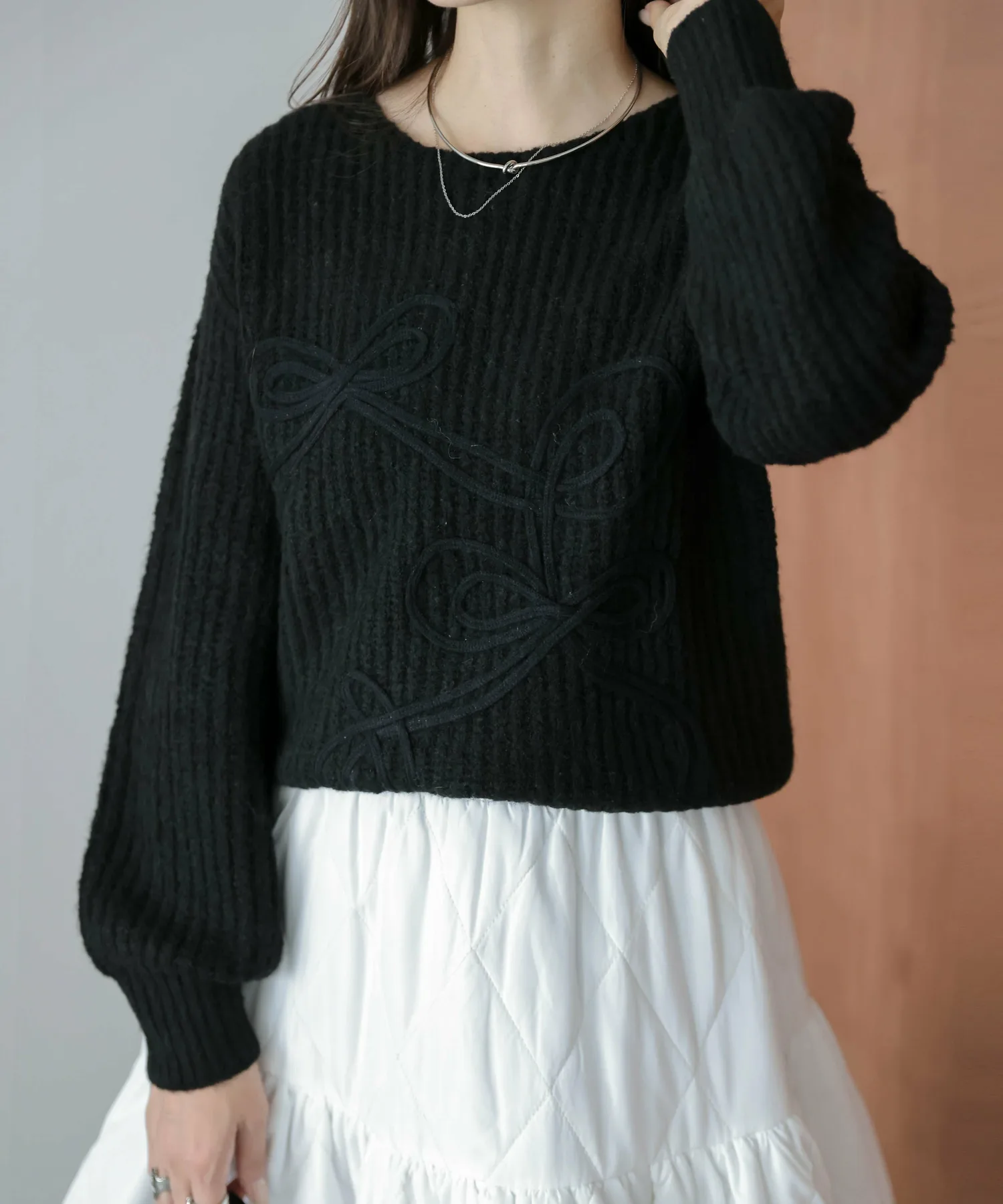 Он хорошо сочетается с любыми брюками или юбками, а умеренно объемный силуэт рукавов придает ему зрелый, милый вид.